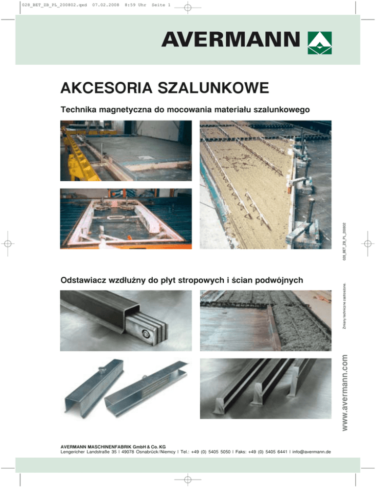 028_BET_ZB_PL_200802.qxd 07.02.2008 8:59 Uhr Seite 1 AKCESORIA SZALUNKOWE www.avermann.com Odstawiacz wzd∏u˝ny do p∏yt stropowych i Êcian podwójnych Zmiany techniczne zastrze˝one. 028_BET_ZB_PL_200802 Technika magnetyczna do mocowania materia∏u szalunkowego AVERMANN MASCHINENFABRIK GmbH & Co. KG Lengericher Landstraße 35 | 49078 Osnabrück / Niemcy | Tel.: +49 (0) 5405 5050 | Faks: +49 (0) 5405 6441 | [email protected] 028_BET_ZB_PL_200802.qxd 07.02.2008 8:59 Uhr Seite 2 AKCESORIA SZALUNKOWE Podwójny odstawiacz poprzeczny do p∏yt stropowych i Êcian podwójnych 028_BET_ZB_PL_200802 SYSTEM SZALOWANIA OBRZE˚Y Zmiany techniczne zastrze˝one. Systemy szalunkowe z magnesami do Êcian pe∏nych www.avermann.com Szalunek sk∏adany mechanicznie Szalunek specjalny z hydraulicznym przesuwem w kierunku górnym Dostarczamy szalunki do ka˝dego elementu betonowego. Zwróç si´ do nas z zapytaniem! AVERMANN MASCHINENFABRIK GmbH & Co. KG Lengericher Landstraße 35 | 49078 Osnabrück / Niemcy | Tel.: +49 (0) 5405 5050 | Faks: +49 (0) 5405 6441 | [email protected]