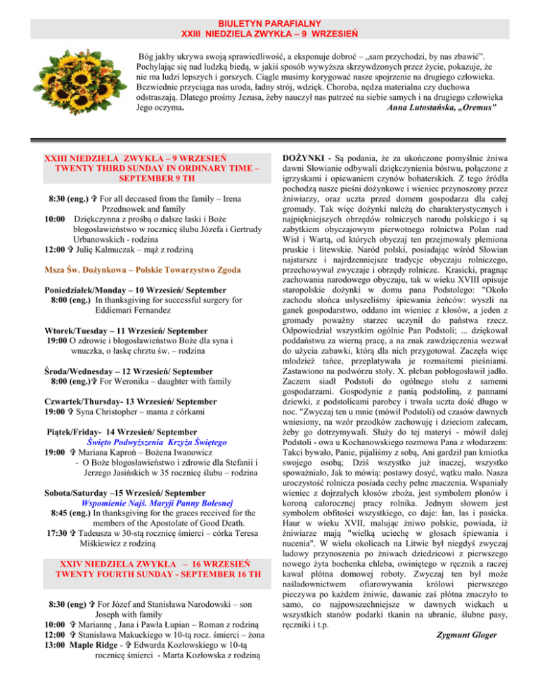 BIULETYN PARAFIALNY XXIII NIEDZIELA ZWYKŁA – 9 WRZESIEŃ Bóg jakby ukrywa swoją sprawiedliwość, a eksponuje dobroć – „sam przychodzi, by nas zbawić”. Pochylając się nad ludzką biedą, w jakiś sposób wywyższa skrzywdzonych przez życie, pokazuje, że nie ma ludzi lepszych i gorszych. Ciągle musimy korygować nasze spojrzenie na drugiego człowieka. Bezwiednie przyciąga nas uroda, ładny strój, wdzięk. Choroba, nędza materialna czy duchowa odstraszają. Dlatego prośmy Jezusa, żeby nauczył nas patrzeć na siebie samych i na drugiego człowieka Jego oczyma. Anna Lutostańska, „Oremus” XXIII NIEDZIELA ZWYKŁA – 9 WRZESIEŃ TWENTY THIRD SUNDAY IN ORDINARY TIME – SEPTEMBER 9 TH 8:30 (eng.) For all deceased from the family – Irena Przednowek and family 10:00 Dziękczynna z prośbą o dalsze łaski i Boże błogosławieństwo w rocznicę ślubu Józefa i Gertrudy Urbanowskich - rodzina 12:00 Julię Kalmuczak – mąż z rodziną Msza Św. Dożynkowa – Polskie Towarzystwo Zgoda Poniedziałek/Monday – 10 Wrzesień/ September 8:00 (eng.) In thanksgiving for successful surgery for Eddiemari Fernandez Wtorek/Tuesday – 11 Wrzesień/ September 19:00 O zdrowie i błogosławieństwo Boże dla syna i wnuczka, o łaskę chrztu św. – rodzina Środa/Wednesday – 12 Wrzesień/ September 8:00 (eng.) For Weronika – daughter with family Czwartek/Thursday- 13 Wrzesień/ September 19:00 Syna Christopher – mama z córkami Piątek/Friday- 14 Wrzesień/ September Święto Podwyższenia Krzyża Świętego 19:00 Mariana Kaproń – Bożena Iwanowicz - O Boże błogosławieństwo i zdrowie dla Stefanii i Jerzego Jasińskich w 35 rocznicę ślubu – rodzina Sobota/Saturday –15 Wrzesień/ September Wspomienie Najś. Maryji Panny Bolesnej 8:45 (eng.) In thanksgiving for the graces received for the members of the Apostolate of Good Death. 17:30 Tadeusza w 30-stą rocznicę śmierci – córka Teresa Miśkiewicz z rodziną XXIV NIEDZIELA ZWYKŁA – 16 WRZESIEŃ TWENTY FOURTH SUNDAY - SEPTEMBER 16 TH 8:30 (eng) For Józef and Stanisława Narodowski – son Joseph with family 10:00 Mariannę , Jana i Pawła Łupian – Roman z rodziną 12:00 Stanisława Makuckiego w 10-tą rocz. śmierci – żona 13:00 Maple Ridge - Edwarda Kozłowskiego w 10-tą rocznicę śmierci - Marta Kozłowska z rodziną DOŻYNKI - Są podania, że za ukończone pomyślnie żniwa dawni Słowianie odbywali dziękczynienia bóstwu, połączone z igrzyskami i opiewaniem czynów bohaterskich. Z tego źródła pochodzą nasze pieśni dożynkowe i wieniec przynoszony przez żniwiarzy, oraz uczta przed domem gospodarza dla całej gromady. Tak więc dożynki należą do charakterystycznych i najpiękniejszych obrzędów rolniczych narodu polskiego i są zabytkiem obyczajowym pierwotnego rolnictwa Polan nad Wisł i Wartą, od których obyczaj ten przejmowały plemiona pruskie i litewskie. Naród polski, posiadając wśród Słowian najstarsze i najrdzenniejsze tradycje obyczaju rolniczego, przechowywał zwyczaje i obrzędy rolnicze. Krasicki, pragnąc zachowania narodowego obyczaju, tak w wieku XVIII opisuje staropolskie dożynki w domu pana Podstolego: "Około zachodu słońca usłyszeliśmy śpiewania żeńców: wyszli na ganek gospodarstwo, oddano im wieniec z kłosów, a jeden z gromady poważny starzec uczynił do państwa rzecz. Odpowiedział wszystkim ogólnie Pan Podstoli; ... dziękował poddaństwu za wierną pracę, a na znak zawdzięczenia wezwał do użycia zabawki, którą dla nich przygotował. Zaczęła więc młodzież tańce, przeplatywała je rozmaitemi pieśniami. Zastawiono na podwórzu stoły. X. pleban pobłogosławił jadło. Zaczem siadł Podstoli do ogólnego stołu z samemi gospodarzami. Gospodynie z panią podstoliną, z pannami dziewki, z podstolicami parobcy i trwała uczta dość długo w noc. "Zwyczaj ten u mnie (mówił Podstoli) od czasów dawnych wniesiony, na wzór przodków zachowuję i dzieciom zalecam, żeby go dotrzymywali. Służy do tej materyi - mówił dalej Podstoli - owa u Kochanowskiego rozmowa Pana z włodarzem: Takci bywało, Panie, pijaliśmy z sobą, Ani gardził pan kmiotka swojego osobą; Dziś wszystko już inaczej, wszystko spoważniało, Jak to mówią: postawy dosyć, wątku malo. Nasza uroczystość rolnicza posiada cechy pełne znaczenia. Wspaniały wieniec z dojrzałych kłosów zboża, jest symbolem plonów i koroną całorocznej pracy rolnika. Jednym słowem jest symbolem obfitości wszystkiego, co daje: łan, las i pasieka. Haur w wieku XVII, malując żniwo polskie, powiada, iż żniwiarze mają "wielką uciechę w głosach śpiewania i nucenia". W wielu okolicach na Litwie był niegdyś zwyczaj ludowy przynoszenia po żniwach dziedzicowi z pierwszego nowego żyta bochenka chleba, owiniętego w ręcznik a raczej kawał płótna domowej roboty. Zwyczaj ten był może naśladownictwem ofiarowywania królowi pierwszego pieczywa po każdem żniwie, dawanie zaś płótna znaczyło to samo, co najpowszechniejsze w dawnych wiekach u wszystkich stanów podarki tkanin na ubranie, ślubne pasy, ręczniki i t.p. Zygmunt Gloger OGŁOSZENIA PARAFIALNE DOŻYNKI – Dziś w naszej parafii obchodzimy Dzień Dziękczynienia za tegoroczne zbiory. Polskie Towarzystwo Zgoda zaprasza wszystkich, po Mszy Św. o godz. 12:00, na doroczne obchody dożynkowe do Domu Polskiego „ZGODA.” PODZIĘKOWANIE – Wyrażamy naszą wdzięczność wszystkim, którzy bezinteresownie każdego roku pomagają w zorganizowaniu naszej pielgrzymki do Groty Matki Bożej Pocieszenia do Ladner oraz czuwają nad jej bezpiecznym przebiegiem. Niech Wasze starania o dobro parafii przyniosą duchowe owoce oraz ześlą Wam obfite błogosławieństwo. Pragniemy wyrażić naszą wdzięczność FEDERACJI POLEK za przygotowanie smacznego obiadu, w ubiegłą niedzielę. Dochód 1,605.60 przeznaczono na pokrycie kosztu wymiany dachu na plebani. Bóg zapłać za inicjatywę i wsparcie. NASI ZMARLI/DE