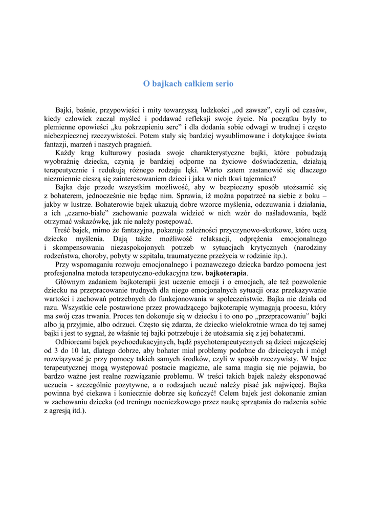 O bajkach całkiem serio Bajki, baśnie, przypowieści i mity towarzyszą ludzkości „od zawsze”, czyli od czasów, kiedy człowiek zaczął myśleć i poddawać refleksji swoje życie. Na początku były to plemienne opowieści „ku pokrzepieniu serc” i dla dodania sobie odwagi w trudnej i często niebezpiecznej rzeczywistości. Potem stały się bardziej wysublimowane i dotykające świata fantazji, marzeń i naszych pragnień. Każdy krąg kulturowy posiada swoje charakterystyczne bajki, które pobudzają wyobraźnię dziecka, czynią je bardziej odporne na życiowe doświadczenia, działają terapeutycznie i redukują różnego rodzaju lęki. Warto zatem zastanowić się dlaczego niezmiennie cieszą się zainteresowaniem dzieci i jaka w nich tkwi tajemnica? Bajka daje przede wszystkim możliwość, aby w bezpieczny sposób utożsamić się z bohaterem, jednocześnie nie będąc nim. Sprawia, iż można popatrzeć na siebie z boku – jakby w lustrze. Bohaterowie bajek ukazują dobre wzorce myślenia, odczuwania i działania, a ich „czarno-białe” zachowanie pozwala widzieć w nich wzór do naśladowania, bądź otrzymać wskazówkę, jak nie należy postępować. Treść bajek, mimo że fantazyjna, pokazuje zależności przyczynowo-skutkowe, które uczą dziecko myślenia. Dają także możliwość relaksacji, odprężenia emocjonalnego i skompensowania niezaspokojonych potrzeb w sytuacjach krytycznych (narodziny rodzeństwa, choroby, pobyty w szpitalu, traumatyczne przeżycia w rodzinie itp.). Przy wspomaganiu rozwoju emocjonalnego i poznawczego dziecka bardzo pomocna jest profesjonalna metoda terapeutyczno-edukacyjna tzw. bajkoterapia. Głównym zadaniem bajkoterapii jest uczenie emocji i o emocjach, ale też pozwolenie dziecku na przepracowanie trudnych dla niego emocjonalnych sytuacji oraz przekazywanie wartości i zachowań potrzebnych do funkcjonowania w społeczeństwie. Bajka nie działa od razu. Wszystkie cele postawione przez prowadzącego bajkoterapię wymagają procesu, który ma swój czas trwania. Proces ten dokonuje się w dziecku i to ono po „przepracowaniu” bajki albo ją przyjmie, albo odrzuci. Często się zdarza, że dziecko wielokrotnie wraca do tej samej bajki i jest to sygnał, że właśnie tej bajki potrzebuje i że utożsamia się z jej bohaterami. Odbiorcami bajek psychoedukacyjnych, bądź psychoterapeutycznych są dzieci najczęściej od 3 do 10 lat, dlatego dobrze, aby bohater miał problemy podobne do dziecięcych i mógł rozwiązywać je przy pomocy takich samych środków, czyli w sposób rzeczywisty. W bajce terapeutycznej mogą występować postacie magiczne, ale sama magia się nie pojawia, bo bardzo ważne jest realne rozwiązanie problemu. W treści takich bajek należy eksponować uczucia - szczególnie pozytywne, a o rodzajach uczuć należy pisać jak najwięcej. Bajka powinna być ciekawa i koniecznie dobrze się kończyć! Celem bajek jest dokonanie zmian w zachowaniu dziecka (od treningu nocniczkowego przez naukę sprzątania do radzenia sobie z agresją itd.). Oto kilka przykładów bajek pomocnych w przepracowaniu i oswojeniu przez dziecko różnorodnych sytuacjach życia codziennego: Maria Moklicka - „Bajki terapeutyczne”; Doris Brett – „Bajki, które leczą” Erika Meyer-Glitza – „Kiedy Pani Złość przychodzi z wizytą” Anna Kozłowska – „Zaczarowane bajki” Jan Uwe Rogge – „Krótkie opowiadania na pokonanie strachu” Linde von Keyserlingk – „I nagle zrobiło się cicho. Opowiadania o śmierci” Gerlinde Ortner – „Bajki na dobry sen” Wojciech Kołyszko – „Smok Lubomił i tajemnice złości” Barbara Cain – „Chyba jestem nieśmiały” Marcie Aboff – „Nie lubię łaskotek” Gabriele Harmanns – „33 odprężające opowiadania dla dzieci” Urszula Madejska