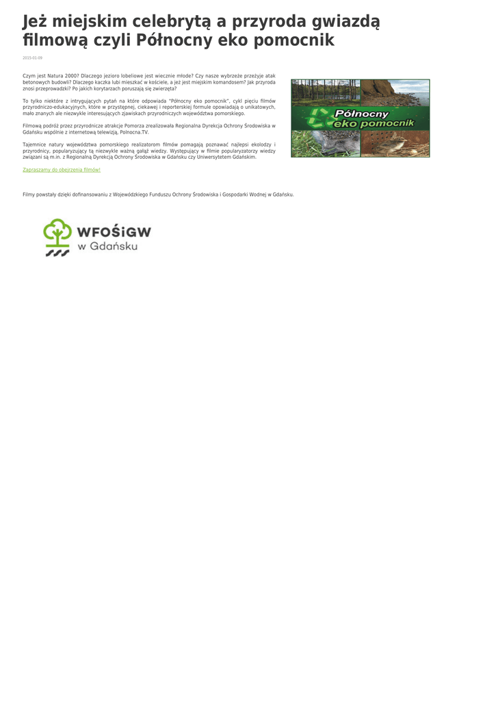 Jeż miejskim celebrytą a przyroda gwiazdą filmową czyli Północny eko pomocnik 2015-01-09 Czym jest Natura 2000? Dlaczego jezioro lobeliowe jest wiecznie młode? Czy nasze wybrzeże przeżyje atak betonowych budowli? Dlaczego kaczka lubi mieszkać w kościele, a jeż jest miejskim komandosem? Jak przyroda znosi przeprowadzki? Po jakich korytarzach poruszają się zwierzęta? To tylko niektóre z intrygujących pytań na które odpowiada "Północny eko pomocnik”, cykl pięciu filmów przyrodniczo-edukacyjnych, które w przystępnej, ciekawej i reporterskiej formule opowiadają o unikatowych, mało znanych ale niezwykle interesujących zjawiskach przyrodniczych województwa pomorskiego. Filmową podróż przez przyrodnicze atrakcje Pomorza zrealizowała Regionalna Dyrekcja Ochrony Środowiska w Gdańsku wspólnie z internetową telewizją, Polnocna.TV. Tajemnice natury województwa pomorskiego realizatorom filmów pomagają poznawać najlepsi ekolodzy i przyrodnicy, popularyzujący tą niezwykle ważną gałąź wiedzy. Występujący w filmie popularyzatorzy wiedzy związani są m.in. z Regionalną Dyrekcją Ochrony Środowiska w Gdańsku czy Uniwersytetem Gdańskim. Zapraszamy do obejrzenia filmów! Filmy powstały dzięki dofinansowaniu z Wojewódzkiego Funduszu Ochrony Środowiska i Gospodarki Wodnej w Gdańsku.
