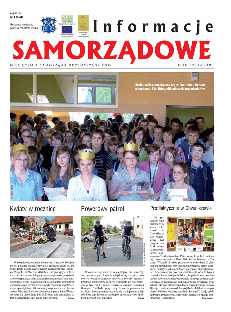 maj 2013r. www.is.krotoszyn.pl nr 4 (123) 4 (123) Redaktor wydania: Monika Menzfeld-Czubak MIESIĘCZNIK SAMORZĄDU KROTOSZYŃSKIEGO I S S N 1 7 3 2 -2 0 4 9 fot. Izabela Bartoœ Liczba osób ubiegaj¹cych siê w tym roku o koronê w konkursie Król Ortografii ucieszy³a organizatorów Profilaktycznie w Chwaliszewie W rocznicę uchwalenia Konstytucji 3 maja w kościele pw. bł. Biskupa Kozala odbyła się uroczysta msza św. Po mszy krótki program artystyczny zaprezentowali uczniowie Zespołu Szkół nr 1 z Oddziałami Integracyjnymi w Krotoszynie. Następnie delegacje samorządowców, przedstawiciele organizacji politycznych i kombatanckich oraz młodzież udali się na ul. Konstytucji 3 Maja, gdzie pod tablicą upamiętniającą wydarzenie złożyli wiązanki kwiatów. 8 maja upamiętniono 68. rocznicę zwycięstwa nad faszyzmem. Wiązanki kwiatów złożono pod pomnikiem Wolności oraz na placu Jana Pawła II oraz pod pomnikiem 6. (mm) Pułku Artylerii Lekkiej na ul. Piastowskiej. fot. Monika Menzfeld-Czubak Rowerowy patrol fot. Monika Menzfeld-Czubak Kwiaty w rocznicê Wiosenna pogoda i coraz cieplejsze dni sprawiły, że rowerowy patrol straży miejskiej wyruszył w miasto. Po jesienno-zimowej przerwie rowery przeszły przegląd techniczny, na ulice wyjechały po raz pierwszy w tym roku 8 maja. Strażnicy Janusz Lammel i Grzegorz Niedbała przyznają, że rower pozwala na szybkie i łatwe przemieszczenie się z miejsca na miejsce. Poza tym zdecydowanie lepiej sprawdza się w ulicznych korkach niż samochód. (mm) Od początku roku szkolnego w Zespole Szkół w Chwaliszewie realizowany był program profilaktyczny „Znajdź właściwe rozwiązanie” pod patronatem Państwowej Inspekcji Sanitarnej i Stowarzyszenia na Rzecz Dzieciństwa Wolnego od Tytoniu. W klasie VI szkoły podstawowej oraz klasie III gimnazjum prowadzone były zajęcia warsztatowe przez pedagoga i nauczyciela biologii, które miały na celu przybliżenie uczniom przebiegu procesu uzależnienia od nikotyny i uświadomienie młodym ludziom, że palenie okazjonalne bardzo często powoduje wkraczanie na drogę pełnego uzależnienia od papierosów. Podsumowaniem programu była szkolna akcja profilaktyczna, która zorganizowana została 16 maja. Hasłem przewodnim akcji było „Jabłko kontra papieros. Wybierz witaminy zamiast nikotyny!”. Akcję profilaktyczną przygotował Samorząd Uczniowski Szkoły Pod1 Ilona Jamry stawowej i Gimnazjum. 4 (123) Obecnoœæ obowi¹zkowa www.is.krotoszyn.pl Czwórka na wojskowo Do koñca maja mo¿na ogl¹daæ w galerii Refektarz wystawê malarstwa wroc³awskiej artystki Marty Borgosz. Finisa¿ wystawy i Honorowy Czytelnik 11 maja Szko³a Podstawowa nr 4 zamieni³a siê w najweselsz¹ jednostkê wojskow¹. W piątek 10 maja w Krotoszyńskiej Bibliotece Publicznej odbył się finisaż wystawy radioodbiorników Grzegorza Dudka „Radio-retro. Tak się zaczynało”. Kolekcjoner starych odbiorników z wielką pasją opowiadał o swoim hobby. Wykazał się dużą znajomością historii radia i szczegółów technicznych. Zbieraniem radioodbiorników pan Grzegorz zajął się na emeryturze, ale interesował się nimi już w dzieciństwie. Z zawodu jest automatykiem, skończył Policealne Studium Zawodowe przy Zakładzie Automatyki Przemysłowej w Ostrowie Wlkp. Należy do GFGF – międzynarodowego stowarzyszenia zrzeszającego 9 czerwca o godz. 12.00 na krotoszyñskim rynku odbêdzie siê uroczysta msza œwiêta w zwi¹zku z ustanowieniem b³ogos³awionego biskupa Micha³a Kozala patronem Krotoszyna. 29 czerwca odbêdzie siê czwarty Otwarty Przegl¹d Taneczny "Dance Meeting". W przegl¹dzie mog¹ wzi¹æ udzia³ amatorzy. Regulamin konkursu dostêpny na stronie Krotoszyñskiego Oœrodka Kultury. Zg³oszenia przyjmowane s¹ do 3 czerwca. Zap³aæ za alkohole Przypominamy, że 31 maja upływa termin płatności drugiej raty za pozwolenia na sprzedaż alkoholu. Opłatę można przekazać na konto bankowe BZ WBK SA Krotoszyn 21 1090 1157 0000 0001 1325 4291 lub wnieść w kasie Urzędu Miejskiego, w budynku przy ul. Kołłątaja 7. Urz¹d Miejski w Krotoszynie Centrala Faks Punkt Informacyjny Sekretariat Burmistrza Biuro Rady Miejskiej Stra¿ Miejska (62) (62) (62) (62) (62) (62) (62) 725 725 722 722 722 722 722 42 34 74 74 74 74 74 01 36 58 14 51 07 57 Burmistrz Julian Jokœ przyjmuje interesantów we wtorki w godz. 15.30 – 16.30. Przewodnicz¹ca Rady Miejskiej Zofia Jamka przyjmuje interesantów we wtorki w godz. 14.00 – 15.00. Starostwo Powiatowe (62) 725 42 56 (62) 725 42 57 Powiatowy Urz¹d Pracy (62) 725 36 84 (62) 725 44 56 Komenda Powiatowa Policji w Krotoszynie (62) 725 52 00 Komenda Powiatowa Pañstwowej Stra¿y Po¿arnej (62) 725 29 21 (62) 725 29 22 Miejsko-Gminny Oœrodek Pomocy Spo³ecznej (62) 725 36 68 (62) 725 39 96 Urz¹d Skarbowy 2 Kurs na ratownika WOPR w Krotoszynie zaprasza wszystkich zainteresowanych ukoñczeniem kursu na ratownika wodnego „MSW”. Spotkanie organizacyjne odbêdzie siê w dniu 7 czerwca br. o godz. 18 00na p³ywalni odkrytej w Krotoszynie ul.Ogrodowskiego. Telefony: Grzegorz Majchszak 660 674 352 Waldemar Wronecki 666 844 483 zbiorów militarnych i pamiątek oraz mundurów i odznaczeń wojskowych. Wystawie towarzyszyła muzyka z adapteru - przeboje z płyt winylowych Kołobrzeg 78 i 79. Boisko szkolne zapełniły wozy bojowe, którymi w tym dniu zawładnęli w pełni żołnierze z najweselszej jednostki. W organizację pikniku włączyli się krotoszyńscy policjanci, którzy znakowali rowery oraz PKP Polskie linie Kolejowe S.A., które zapewniły nagrody w postaci materiałów dydaktycznych. Nie ma poligonu bez kuchni polowej. Żołnierska strawa smakowała wybornie. Grochówka i chleb ze smalcem oraz kiszonym ogórkiem licytowały się z bigosem i fasolką po bretońsku. Całość osładzały ciasta, upieczone jak co roku przez kochane mamusie. Sztab główny serdecznie dziękuje Wszystkim, którzy w jakikolwiek sposób wspomogli inicjatywę o