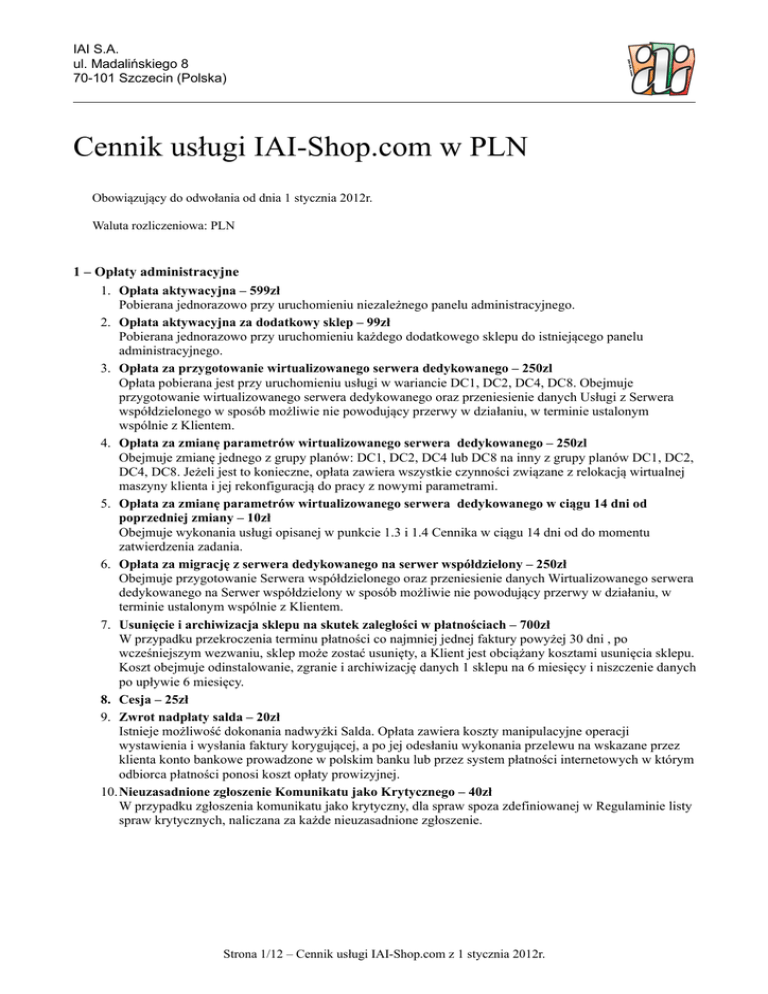 IAI S.A. ul. Madalińskiego 8 70-101 Szczecin (Polska) Cennik usługi IAI-Shop.com w PLN Obowiązujący do odwołania od dnia 1 stycznia 2012r. Waluta rozliczeniowa: PLN 1 – Opłaty administracyjne 1. Opłata aktywacyjna – 599zł Pobierana jednorazowo przy uruchomieniu niezależnego panelu administracyjnego. 2. Opłata aktywacyjna za dodatkowy sklep – 99zł Pobierana jednorazowo przy uruchomieniu każdego dodatkowego sklepu do istniejącego panelu administracyjnego. 3. Opłata za przygotowanie wirtualizowanego serwera dedykowanego – 250zl Opłata pobierana jest przy uruchomieniu usługi w wariancie DC1, DC2, DC4, DC8. Obejmuje przygotowanie wirtualizowanego serwera dedykowanego oraz przeniesienie danych Usługi z Serwera współdzielonego w sposób możliwie nie powodujący przerwy w działaniu, w terminie ustalonym wspólnie z Klientem. 4. Opłata za zmianę parametrów wirtualizowanego serwera dedykowanego – 250zl Obejmuje zmianę jednego z grupy planów: DC1, DC2, DC4 lub DC8 na inny z grupy planów DC1, DC2, DC4, DC8. Jeżeli jest to konieczne, opłata zawiera wszystkie czynności związane z relokacją wirtualnej maszyny klienta i jej rekonfiguracją do pracy z nowymi parametrami. 5. Opłata za zmianę parametrów wirtualizowanego serwera dedykowanego w ciągu 14 dni od poprzedniej zmiany – 10zł Obejmuje wykonania usługi opisanej w punkcie 1.3 i 1.4 Cennika w ciągu 14 dni od do momentu zatwierdzenia zadania. 6. Opłata za migrację z serwera dedykowanego na serwer współdzielony – 250zł Obejmuje przygotowanie Serwera współdzielonego oraz przeniesienie danych Wirtualizowanego serwera dedykowanego na Serwer współdzielony w sposób możliwie nie powodujący przerwy w działaniu, w terminie ustalonym wspólnie z Klientem. 7. Usunięcie i archiwizacja sklepu na skutek zaległości w płatnościach – 700zł W przypadku przekroczenia terminu płatności co najmniej jednej faktury powyżej 30 dni , po wcześniejszym wezwaniu, sklep może zostać usunięty, a Klient jest obciążany kosztami usunięcia sklepu. Koszt obejmuje odinstalowanie, zgranie i archiwizację danych 1 sklepu na 6 miesięcy i niszczenie danych po upływie 6 miesięcy. 8. Cesja – 25zł 9. Zwrot nadpłaty salda – 20zł Istnieje możliwość dokonania nadwyżki Salda. Opłata zawiera koszty manipulacyjne operacji wystawienia i wysłania faktury korygującej, a po jej odesłaniu wykonania przelewu na wskazane przez klienta konto bankowe prowadzone w polskim banku lub przez system płatności internetowych w którym odbiorca płatności ponosi koszt opłaty prowizyjnej. 10.Nieuzasadnione zgłoszenie Komunikatu jako Krytycznego – 40zł W przypadku zgłoszenia komunikatu jako krytyczny, dla spraw spoza zdefiniowanej w Regulaminie listy spraw krytycznych, naliczana za każde nieuzasadnione zgłoszenie. Strona 1/12 – Cennik usługi IAI-Shop.com z 1 stycznia 2012r. IAI S.A. ul. Madalińskiego 8 70-101 Szczecin (Polska) 2 – Opłaty abonamentowe 1. Plan CLOUD – 29zł Opłata miesięczna, obejmuje: Transfer w cenie: do 30GB Ilość Wizyt w cenie: do 5000 Ilość Wywołań API w cenie: do 10000 Limit objętości danych: 10GB Limit ilości towarów w cenie: do 5000 Funkcjonalność: pełna funkcjonalność IAI-Shop.com z maksymalnymi limitami ilościowymi dla serwerów współdzielonych 2. Plan DEDICATED CLOUD 1 (DC1) – 336,50zł Opłata miesięczna, obejmuje brak dopłat za Transfer, ilość Wizyt, wywołań API lub ilość towarów. Ograniczeniem jest jedynie możliwa do osiągnięcia graniczna wydajność wirtualizowanego serwera dedykowanego. Funkcjonalność: pełna funkcjonalność IAI-Shop.com bez limitów ilościowych w modułach W ramach opłaty administracja i aktualizacja wirtualizowanego serwera dedykowanego. Wirtualizowany serwer dedykowany DC1 ma: 1 rdzeń procesora Intel Xeon przypisany na stałe, 3000MB RAM, 80GB przestrzeni dyskowej, łącze o prędkości nominalnej 1Gbps bez limitu transferu 3. Plan DEDICATED CLOUD 2 (DC2) – 436,50zł Opłata miesięczna, obejmuje ten sam zakres usług co w wariancie DEDICATED CLOUD 1, oraz Wirtualizowany serwer dedykowany o parametrach: 2 rdzenie procesora Intel Xeon przypisane na stałe, 6000MB RAM, 80GB przestrzeni dyskowej, łącze o prędkości nominalnej 1Gbps bez limitu transferu 4. Plan DEDICATED CLOUD 4 (DC4) – 749zł Opłata miesięczna, obejmuje ten sam zakres usług co w wariancie DEDICATED CLOUD 1, oraz Wirtualizowany serwer dedykowany o parametrach: 4 rdzenie procesora Intel Xeon przypisane na stałe, 12000MB RAM, 80GB przestrzeni dyskowej, łącze o prędkości nominalnej 1Gbps bez limitu transferu 5. Plan DEDICATED CLOUD 8 (DC8) – 1261,50zł Opłata miesięczna, obejmuje ten sam zakres usług co w wariancie DEDICATED CLOUD 1, oraz Wirtualizowany serwer dedykowany o parametrach: 8 rdzeni procesora Intel Xeon przypisane na stałe, 24000MB RAM, 80GB przestrzeni dyskowej, łącze o prędkości nominalnej 1Gbps bez limitu transferu 6. Plan DEDICATED CLOUD 8x2 (DC8x2) – 2524zł Opłata miesięczna, obejmuje ten sam zakres usług co w wariancie DEDICATED CLOUD 8 w oparciu o transmisję wykonywaną równolegle z 2 serwerów o parametrach takich jak w planie DC8. 3 – Dopłaty 1. Dopłata za każdy rozpoczęty 1GB ruchu ponad limit w ramach abonamentu CLOUD – 0,50zł 2. Dopłata za każde rozpoczęte 1000 wizyt ponad limit w ramach abonamentu CLOUD – 12,5zł 3. Dopłata za każde rozpoczęte 10000 wywołań API ponad limit w ramach abonamentu CLOUD - 10zł 4. Dopłata za każde 5000 dodatkowych towarów ponad limit w ramach abonamentu CLOUD – 50zł 5. Dopłata za dodatkowy sklep do panelu – 25zł Opłata nie zmienia Limitu ruchu. 4 – Usługi serwisowe 1. Roboczogodzina przy imporcie danych - 80zł/h Roboczogodzina przy pracy nad edycją danych Klienta lub tworzeniu programu do importu danych z zewnętrznej bazy danych, w tym innego sklepu internetowego. Usługa dostępna w trybie Express w cenie 55zł za każde rozpoczę