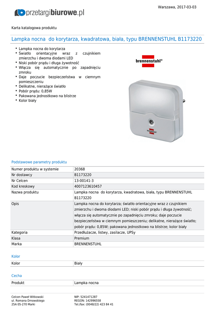 Warszawa, 2017-03-03 Karta katalogowa produktu Lampka nocna do korytarza, kwadratowa, biała, typu BRENNENSTUHL B1173220 Lampka nocna do korytarza Światło orientacyjne wraz z czujnikiem zmierzchu i dwoma diodami LED Niski pobór prądu i długa żywotność Włącza się automatycznie po zapadnięciu zmroku Daje poczucie bezpieczeństwa w ciemnym pomieszczeniu Delikatne, nierażące światło Pobór prądu: 0,85W Pakowana jednostkowo na blistrze Kolor biały Podstawowe parametry produktu Numer produktu w systemie 20368 Nr dostawcy B1173220 Nr Celcen 13-00141-3 Kod kreskowy 4007123610457 Nazwa produktu Lampka nocna do korytarza, kwadratowa, biała, typu BRENNENSTUHL B1173220 Opis Lampka nocna do korytarza; światło orientacyjne wraz z czujnikiem zmierzchu i dwoma diodami LED; niski pobór prądu i długa żywotność; włącza się automatycznie po zapadnięciu zmroku; daje poczucie bezpieczeństwa w ciemnym pomieszczeniu; delikatne, nierażące światło; pobór prądu: 0,85W; pakowana jednostkowo na blistrze; kolor biały Kategoria Przedłużacze, listwy, zasilacze, UPSy Klasa Premium Marka BRENNENSTUHL Kolor Kolor Biały Cecha Produkt Lampka nocna Celcen Paweł Witkowski ul. Romana Dmowskiego 25A 05-270 Marki NIP: 5241471287 REGON: 142996558 Tel./fax: (0048/22) 423 84 41 Warszawa, 2017-03-03 Karta katalogowa produktu cd. Lampka nocna do korytarza, kwadratowa, biała, typu BRENNENSTUHL B1173220 W ofercie od 2014-01 Typ Kwadratowa Wymiary Rozmiar B.d. Wymiary (mm) B.d. Certyfikaty Nowy produkt w ofercie Standard Hit Standard Wspólny słownik zamówień CPV 31521000-4 Lampy Jesteśmy przekonani, że z pomocą przetargibiurowe.pl usprawnicie Państwo własne procesy biznesowe związane ze żmudnym poszukiwaniem odpowiadających Państwu produktów oraz opracowaniem specyfikacjii zapytań ofertowych. Serdecznie zapraszamy do wspópracy Zespół, PrzetargiBiurowe.pl Celcen Paweł Witkowski ul. Romana Dmowskiego 25A 05-270 Marki NIP: 5241471287 REGON: 142996558 Tel./fax: (0048/22) 423 84 41