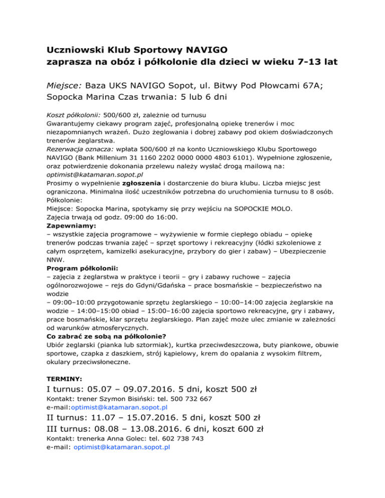 Uczniowski Klub Sportowy NAVIGO zaprasza na obóz i półkolonie dla dzieci w wieku 7-13 lat Miejsce: Baza UKS NAVIGO Sopot, ul. Bitwy Pod Płowcami 67A; Sopocka Marina Czas trwania: 5 lub 6 dni Koszt półkolonii: 500/600 zł, zależnie od turnusu Gwarantujemy ciekawy program zajęć, profesjonalną opiekę trenerów i moc niezapomnianych wrażeń. Dużo żeglowania i dobrej zabawy pod okiem doświadczonych trenerów żeglarstwa. Rezerwacja oznacza: wpłata 500/600 zł na konto Uczniowskiego Klubu Sportowego NAVIGO (Bank Millenium 31 1160 2202 0000 0000 4803 6101). Wypełnione zgłoszenie, oraz potwierdzenie dokonania przelewu należy wysłać drogą mailową na: [email protected] Prosimy o wypełnienie zgłoszenia i dostarczenie do biura klubu. Liczba miejsc jest ograniczona. Minimalna ilość uczestników potrzebna do uruchomienia turnusu to 8 osób. Półkolonie: Miejsce: Sopocka Marina, spotykamy się przy wejściu na SOPOCKIE MOLO. Zajęcia trwają od godz. 09:00 do 16:00. Zapewniamy: – wszystkie zajęcia programowe – wyżywienie w formie ciepłego obiadu – opiekę trenerów podczas trwania zajęć – sprzęt sportowy i rekreacyjny (łódki szkoleniowe z całym osprzętem, kamizelki asekuracyjne, przybory do gier i zabaw) – Ubezpieczenie NNW. Program półkolonii: – zajęcia z żeglarstwa w praktyce i teorii – gry i zabawy ruchowe – zajęcia ogólnorozwojowe – rejs do Gdyni/Gdańska – prace bosmańskie – bezpieczeństwo na wodzie – 09:00–10:00 przygotowanie sprzętu żeglarskiego – 10:00–14:00 zajęcia żeglarskie na wodzie – 14:00–15:00 obiad – 15:00–16:00 zajęcia sportowo rekreacyjne, gry i zabawy, prace bosmańskie, klar sprzętu żeglarskiego. Plan zajęć może ulec zmianie w zależności od warunków atmosferycznych. Co zabrać ze sobą na półkolonie? Ubiór żeglarski (pianka lub sztormiak), kurtka przeciwdeszczowa, buty piankowe, obuwie sportowe, czapka z daszkiem, strój kąpielowy, krem do opalania z wysokim filtrem, okulary przeciwsłoneczne. TERMINY: I turnus: 05.07 – 09.07.2016. 5 dni, koszt 500 zł Kontakt: trener Szymon Bisiński: tel. 500 732 667 e-mail:[email protected] II turnus: 11.07 – 15.07.2016. 5 dni, koszt 500 zł III turnus: 08.08 – 13.08.2016. 6 dni, koszt 600 zł Kontakt: trenerka Anna Golec: tel. 602 738 743 e-mail: [email protected]