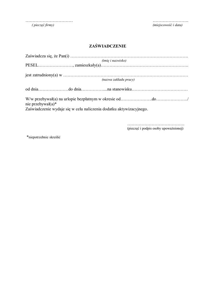 …………………………… ……………………. ( pieczęć firmy) (miejscowość i data) ZAŚWIADCZENIE Zaświadcza się, że Pan(i) ………………………………………………………………………. (imię i nazwisko) PESEL……………………, zamieszkały(a)……………………………………………………. jest zatrudniony(a) w …………………………………………………………………………… (nazwa zakładu pracy) od dnia…………………do dnia……………....na stanowisku………………………………… W/w przebywał(a) na urlopie bezpłatnym w okresie od………………….do…………………./ nie przebywał(a)* Zaświadczenie wydaje się w celu naliczenia dodatku aktywizacyjnego. …………………………………. (pieczęć i podpis osoby upoważnionej) *niepotrzebnie skreślić