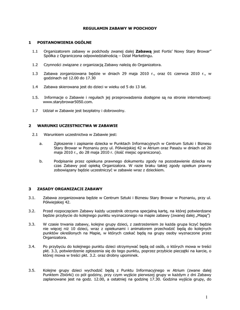 REGULAMIN ZABAWY W PODCHODY 1 POSTANOWIENIA OGÓLNE 1.1 Organizatorem zabawy w podchody zwanej dalej Zabawą jest Fortis’ Nowy Stary Browar” Spółka z Ograniczona odpowiedzialnością – Dział Marketingu. 1.2 Czynności związane z organizacją Zabawy należą do Organizatora. 1.3 Zabawa zorganizowana będzie w dniach 29 maja 2010 r., oraz 01 czerwca 2010 r., w godzinach od 12.00 do 17.30 1.4 Zabawa skierowana jest do dzieci w wieku od 5 do 13 lat. 1.5. Informacje o Zabawie i regułach jej przeprowadzenia dostępne są na stronie internetowej: www.starybrowar5050.com. 1.7 Udział w Zabawie jest bezpłatny i dobrowolny. 2 WARUNKI UCZESTNICTWA W ZABAWIE 2.1 3 Warunkiem uczestnictwa w Zabawie jest: a. Zgłoszenie i zapisanie dziecka w Punktach Informacyjnych w Centrum Sztuki i Biznesu Stary Browar w Poznaniu przy ul. Półwiejskiej 42 w Atrium oraz Pasażu w dniach od 20 maja 2010 r., do 28 maja 2010 r. (ilość miejsc ograniczona). b. Podpisanie przez opiekuna prawnego dokumentu zgody na pozostawienie dziecka na czas Zabawy pod opieką Organizatora. W razie braku takiej zgody opiekun prawny zobowiązany będzie uczestniczyć w zabawie wraz z dzieckiem. ZASADY ORGANIZACJI ZABAWY 3.1. Zabawa zorganizowana będzie w Centrum Sztuki i Biznesu Stary Browar w Poznaniu, przy ul. Półwiejskiej 42. 3.2. Przed rozpoczęciem Zabawy każdy uczestnik otrzyma specjalną kartę, na której potwierdzane będzie przybycie do kolejnego punktu wyznaczonego na mapie zabawy (zwanej dalej „Mapą”) 3.3. W czasie trwania zabawy, kolejne grupy dzieci, z zastrzeżeniem że każda grupa liczyć będzie nie więcej niż 10 dzieci, wraz z opiekunami i animatorem przechodzić będą do kolejnych punktów określonych na Mapie, w których czekać będą na grupy osoby wyznaczone przez Organizatora. 3.4. Po przybyciu do kolejnego punktu dzieci otrzymywać będą od osób, o których mowa w treści pkt. 3.3, potwierdzenie zgłoszenia się do tego punktu, poprzez przybicie pieczątki na karcie, o której mowa w treści pkt. 3.2. oraz drobny upominek. 3.5. Kolejne grupy dzieci wychodzić będą z Punktu Informacyjnego w Atrium (zwane dalej Punktem Zbiórki) co pół godziny, przy czym wyjście pierwszej grupy w każdym z dni Zabawy zaplanowane jest na godz. 12.00, a ostatniej na godzinę 17.30. Godzina wyjścia grupy, do 1 której zapisane będzie dziecko, podana będzie przez pracownika Punktu Informacyjnego w chwili zapisywania dziecka do uczestnictwa w Zabawie. 3.6. Każde dziecko wraz z opiekunem zobowiązane jest stawić się w Punkcie Zbiórki na 5 minut przed planowaną godziną wyjścia. W przypadku niestawiennictwa animator zaprosi do uczestnictwa w grupie pierwsze dziecko wpisane na listę rezerwową. W przypadku stwierdzenia nieobecności dziecka, o którym mowa z zdaniu drugim powyżej animator zaprosi do udziału w grupie kolejne dziecko z grupy rezerwowej. 3.7. Organizator zastrzega sobie prawo odwołania Zabawy w każdym czasie bez podania przyczyny. 4 NAGRODY 4.1 Każde dziecko biorące udział w Zabawie po zebraniu wszystkich pieczątek, o których mowa w treści pkt. 3.4 otrzyma od Organizatora dyplom „ODKRYWCY TAJEMNIC I SKARBÓW STAREGO BROWARU” (zwany dalej „Dyplomem”). 4.2 Każde dziecko biorące udział w Zabawie po otrzymaniu Dyplomu otrzyma od Organizatora również nagrodę rzeczową z wybranej przez dziecko skrzyni z nagrodami. Poszczególne skrzynie zawierać będą nagrody z określonej kategorii tematycznej. 5. ZASADY POSTĘPOWANIA REKLAMACYJNEGO 5.1. Reklamacje mogą być zgłaszane najpóźniej do 4 czerwiec 2010 r. 5.2. Zgłoszenie reklamacyjne, których pisemna forma zastrzeżona jest pod rygorem nieważności, należy wysłać listem poleconym za potwierdzeniem odbioru z dopiskiem "Reklamacja" pod adresem: Fortis „Nowy Stary Browar” Spółka z ograniczoną odpowiedzialnością, ul Półwiejska 32, 61-888 Poznań 5.3. Reklamacje będą rozpatrywane w terminie 7 dni od daty jej otrzymania. Do osoby składającej reklamację zostanie wysłana pisemnie informacja o decyzji dotyczącej zgłaszanej reklamacji w terminie 7 dni od daty jej rozpatrzenia. 6. PRZETWARZANIE DANYCH OSOBOWYCH 6.1. Dane osobowe uczestników Zabawy będą przetwarzane wyłącznie w celach związanych z organizacją Zabawy i nie będą udostępniane osobom trzecim. 7. POSTANOWIENIA KOŃCOWE 7.1. Niniejszy regulamin jest jawny i dostępny będzie w siedzibie Organizatora tj. Punkty Informacyjne Starego Browaru w Atrium i Pasażu oraz na stronie internetowej www.starybrowar5050.com 7.2. W kwestiach nieuregulowanych niniejszym regulaminem stosuje się przepisy Kodeksu Cywilnego. 7.3. Wszelkie spory wynikłe z tytułu wzajemnych zobowiązań związanych z niniejszym Konkursem będą rozstrzygane przez właściwy sąd powszechny. 2