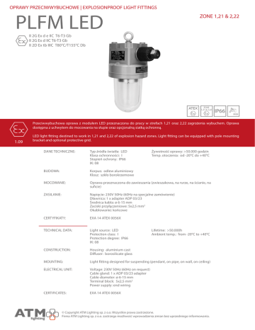 OPRAWY PRZECIWWYBUCHOWE | EXPLOSIONPROOF LIGHT FITTINGS PLFM LED ZONE 1,21 & 2,22 II 2G Ex d e IIC T6-T3 Gb II 2G Ex d IIC T6-T3 Gb II 2D Ex tb IIIC T80°C/T155°C Db ATEX ZONE 1,21 & 2,22 IP66 IK08 Przeciwwybuchowa oprawa z modułem LED przeznaczona do pracy w strefach 1,21 oraz 2,22 zagrożenia wybuchem. Oprawa dostępna z uchwytem do mocowania na słupie oraz opcjonalną siatką ochronną. 1.09 LED light fitting destined to work in 1,21 and 2,22 of explosion hazard zones. Light fitting can be equipped with pole mounting bracket and optional protective grid. DANE TECHNICZNE: Typ źródła światła: LED Żywotność oprawy: >50.000 godzin Klasa ochronności: I Temp. otoczenia: od -20°C do +40°C Stopień ochrony: IP66 IK: 08 BUDOWA: Korpus: odlew aluminiowy Klosz: szkło borokrzemowe MOCOWANIE: Oprawa przeznaczona do zawieszania (zwieszakowa, na rurze, na ścianie, na suficie) ZASILANIE: Napięcie: 230V 50Hz (60Hz na specjalne zamówienie) Dławnica: 1 x adapter ADP 03/23 Średnica kabla: ø 6-15 mm Zaciski przyłączeniowe: 5x2,5 mm2 Okablowanie: końcowe CERTYFIKATY: EXA 14 ATEX 0056X TECHNICAL DATA: Light source: LED Lifetime: >50.000h Protection class: I Ambient temp.: from -20°C to +40°C Protection degree: IP66 IK: 08 CONSTRUCTION: Housing: aluminium cast Diffuser: borosilicate glass MOUNTING: Light fitting designed for suspending (pendant, on pipe, on wall, on ceiling) ELECTRICAL UNIT: Voltage: 230V 50Hz (60Hz on request) Cable gland: 1 x ADP 03/23 adapter Cable diameter: ø 6-15 mm Terminal block: 5x2,5 mm2 Power supply: end wiring CERTIFICATES: EXA 14 ATEX 0056X © Copyright ATM Lighting sp. z o.o. Wszystkie prawa zastrzeżone. Firma ATM Lighting sp. z o.o. zastrzega możliwość wprowadzenia zmian bez uprzedniego informowania. OPRAWY PRZECIWWYBUCHOWE | EXPLOSIONPROOF LIGHT FITTINGS ZONE 1,21 & 2,22 WYMIARY | DIMENSIONS FOTOMETRIA | PHOTOMETRY H H1 cd/klm C0 - C180 TYP | TYPE PLFM LED L 175 H 320 η = 100% H1 345 1.10 TYPY | TYPES TYP TYPE PLFM 20 LED MOC WATTAGE STRUMIEŃ ŚWIETLNY [lm] LUMINOUS FLUX [lm] 20W 1300 PLFM 100/3 12W PHILIPS 1055 ŹRÓDŁO ŚWIATŁA LIGHT SOURCE KLASA TEMP. (GAZ) TEMP. CLASS (GAS) MODUŁ LED LED MODULE E27 LED T6 T6 T0MAX (PYŁ) T0MAX (DUST) 80°C 80°C AKCESORIA | ACCESSORIES TYP | TYPE Siatka ochronna Wire guard PLFM © Copyright ATM Lighting sp. z o.o. All rights reserved. Technical modification reserved without prior notice. www.atmlighting.pl [email protected] KONFIGURACJA OPRAW | LIGHT FITTING CONFIGURATION 20 10 M 20 PC PC 22 11 P AL PM 30 20 PCI GS GL 33 40 21 22 NIRO SAN SGL typ modułu LED, ich ilość oraz prąd sterowania są z góry ustalone dla danej oprawy LED module type, quantity, forward current are specified for each typ of light fitting 35E - 230V, 0/50-60Hz 34E - 230V, 50-60Hz 11E - 24VDC 20 - 2 żyły końcowe 2 wires ending 22 - 2 żyły przelotowe 2 wires through 30 - 3 żyły końcowe 3 wires ending 33 - 3 żyły przelotowe 3 wires through 40 - 4 żyły końcowe 4 wires ending 44 - 4 żyły przelotowe 4 wires through 10, 11, 20, 21, 22 - układ dławnic pokazano na rysunku poniżej cable glands entries positions are shown below 10 11 20 21 P - dławnica z tworzywa sztucznego plastic cable gland M - dławnica z metalu metal cable gland PCI - przepust kablowy o średnicy Ø20 plastic cable inlets Ø20 22 20 - dławnica M20 M20 cable gland 25 - dławnica M25 M25 cable gland PC - poliwęglan polycarbonate AL - aluminium GS - stal ocynkowana galvanized steel NIRO - stal nierdzewna stainless steel GRP - poliester wzmocniony włóknem zklanym fibre glass strengthened polyester PC - poliwęglan polycarbonate PM - PMMA GL - szkło hartowane tempered glass SAN - kopolimer styrenu i akrylonitrylu styrene acrylonitrile resin SGL - safety-glass dodatkowe opcje additional options materiał klosza materiał obudowy housing material wpusty kablowe cable inlets okablowanie wiring zasilanie power supply prąd sterowania driving current 44 ilość /quantity typ modułu LED / LED module type E przybliżona długość approximate length typ type grupa group L ED ZESTAWIENIE IKON | ICON LIST ATEX oprawa posiada certyfikat ATEX light fitting with ATEX certificate CENTRAL ZONE 1,21 & 2,22 oprawa do strefy 1,21 & 2,22 light fitting for Zone 1,21 & 2,22 LED OPTICS ZONE 2&22 oprawa do strefy 2,22 light fittingfor Zone 2,22 IP65 IP66 IP67 IP68 150J PLK LINE CONNECTION NIRO SECURE LOCK IK10 stopień IP oprawy light fitting’s IP degree oprawa wytrzymuje nacisk do 150J light fitting is able to sustain 150J pressure force oprawa posiada dopuszczenie PKP PLK light fitting with Polish Railway’s approval UV++ RESISTANT NH3 EASY CLEANING SAFETY GLASS HEAVY DUTY HIGH OUTPUT 24 VDC obudowa ze stali nierdzewnej stainless steel housing specjalne śruby zamykające special safety screws materiał odporny na działanie promieni UV UV resistant material oprawa do agresywanego chemicznie środowiska light fitting for chemically agressive environment oprawa wyposażona w dodtakową optykę light fitting with additional optics stopień odporności na udar mechaniczny mechanical shock resistance degree oprawa przeznaczona do ciężkich warunków pracy light fitting for heavy-duty environment oprawa o wysokim strumieniu świetlnym high lumen output light fitting oprawa z opcjonalnym zasilaniem 24VDC light fitting for 24VDC power supply as an option oprawa w II klasie ochronności light fitting in II protection class oprawa może być łączona w linię świetlną light fitting can be connected into trunking line oprawa dedykowana do hodowli zwierząt light fitting destined for animal husbandry CHEMICALLY BATTERY oprawa przeznaczona do współpracy z centralną baterią light fitting suitable to use with central battery NARROW BEAM oprawa o wąskiej charakterystyce strumienia światła light fitting with narrow beam photometry WIDE BEAM oprawa o szerokiej charakterystyce strumienia światła light fitting with wide beam photometry GRP obudowa ze poliestru wzmacnian