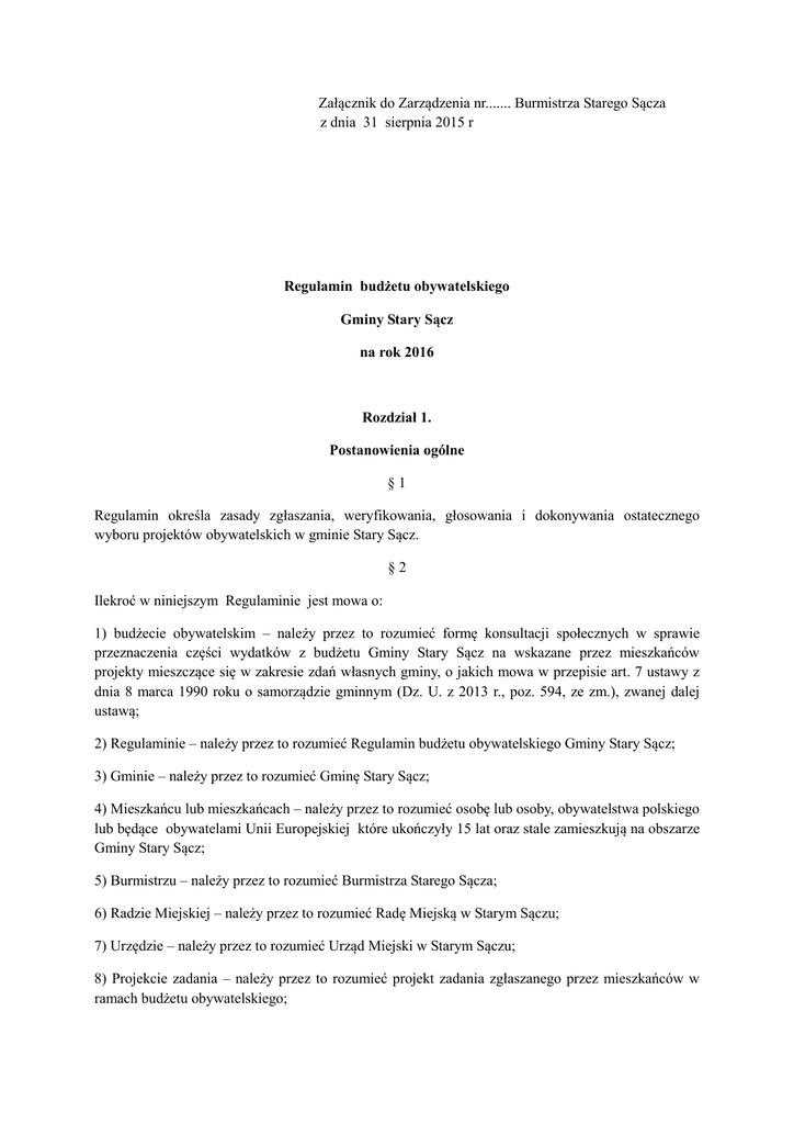 Załącznik do Zarządzenia nr....... Burmistrza Starego Sącza z dnia 31 sierpnia 2015 r Regulamin budżetu obywatelskiego Gminy Stary Sącz na rok 2016 Rozdział 1. Postanowienia ogólne §1 Regulamin określa zasady zgłaszania, weryfikowania, głosowania i dokonywania ostatecznego wyboru projektów obywatelskich w gminie Stary Sącz. §2 Ilekroć w niniejszym Regulaminie jest mowa o: 1) budżecie obywatelskim – należy przez to rozumieć formę konsultacji społecznych w sprawie przeznaczenia części wydatków z budżetu Gminy Stary Sącz na wskazane przez mieszkańców projekty mieszczące się w zakresie zdań własnych gminy, o jakich mowa w przepisie art. 7 ustawy z dnia 8 marca 1990 roku o samorządzie gminnym (Dz. U. z 2013 r., poz. 594, ze zm.), zwanej dalej ustawą; 2) Regulaminie – należy przez to rozumieć Regulamin budżetu obywatelskiego Gminy Stary Sącz; 3) Gminie – należy przez to rozumieć Gminę Stary Sącz; 4) Mieszkańcu lub mieszkańcach – należy przez to rozumieć osobę lub osoby, obywatelstwa polskiego lub będące obywatelami Unii Europejskiej które ukończyły 15 lat oraz stale zamieszkują na obszarze Gminy Stary Sącz; 5) Burmistrzu – należy przez to rozumieć Burmistrza Starego Sącza; 6) Radzie Miejskiej – należy przez to rozumieć Radę Miejską w Starym Sączu; 7) Urzędzie – należy przez to rozumieć Urząd Miejski w Starym Sączu; 8) Projekcie zadania – należy przez to rozumieć projekt zadania zgłaszanego przez mieszkańców w ramach budżetu obywatelskiego; 9) Projekcie infrastrukturalnym - należy przez to rozumieć projekty inwestycyjne polegające na budowie, rozbudowie, remoncie lub modernizacji obiektów budowlanych nie wymagających pozwolenia na prowadzenie robót budowlaqnych; 10) Projekcie "miękkim" - należy przez to rozumieć projekty dotyczące zmian szeroko rozumianej sfery społecznej, ekonomicznej i kulturowej, a także zakupu środków trwałych; 11) Zespole d/s Budżetu Obywatelskiego – należy przez to rozumieć zespół pracowników Urzędu Miejskiego w Starym Sączu powołany przez Burmistrza, do przeprowadzenia weryfikacji zgłoszonych projektów zadań, a także przeprowadzenia głosowania i ustalenia listy zadań wybranych przez mieszkańców do realizacji w ramach budżetu obywatelskiego. § 3. 1. Burmistrz uwzględnia w projekcie budżetu Gminy na rok 2016, środki finansowe przeznaczone na realizację zadań w ramach budżetu obywatelskiego w kwocie 400.000 zł; 2. Ostateczna kwota środków finansowych przeznaczona na realizację zadań w ramach budżetu obywatelskiego, zostanie określona przez Radę Miejską w uchwale budżetowej Gminy na rok 2016. § 4. Ze środków finansowych przeznaczonych na realizację zadań w ramach budżetu obywatelskiego, finansowane są zadania zgłaszane przez mieszkańców, wyłącznie w zakresie zdań własnych gminy, o jakich mowa w przepisie art. 7 ustawy o samorządzie gminnym. § 5. Realizacja zadań w ramach budżetu obywatelskiego odbywa się w ciągu jednego roku budżetowego. § 6. Realizacja budżetu obywatelskiego, odbywa się w następujących etapach: 1) kampania informacyjno-edukacyjna, 2) spotkania informacyjne z mieszkańcami, 3) zgłaszanie propozycji zadań, 4) weryfikacja zgłoszonych propozycji zadań, 5) głosowanie, 6) ogłoszenie wyników, Rozdział 2. Podział środków § 7. 1. Zadania finansowane w ramach budżetu obywatelskiego mogą mieć charakter wyłącznie lokalny, ograniczony do terenu poszczególnych sołectw i osiedli; 2. Całkowity koszt realizacji pojedynczego projektu nie może przekraczać kwoty : -60 000 złotych w przypadku projektu infrastrukturalnego, - 25 000 złotych w przypadku projektu "miękkiego", 3. Suma kosztów realizacji projektów wybranych do realizacji na terenie jednego sołectwa lub osiedla nie może przekraczać kwoty 60 000 złotych. Rozdział 3. Zgłaszanie propozycji zadań § 8. 1. Projekt zadania może składać każdy mieszkaniec za pomocą formularza interaktywnego na stronie www.stary.sacz.pl/budzet; 2. Formularz może zostać wypełniony bezpośrednio na stronie www.stary.sacz.pl/budzet lub z niej pobrany, wypełniony i odesłany w formie odrębnego pliku jako załącznik, pocztą elektroniczną na adres Urzędu Miejskiego;. 3. Do formularza projektu zadania zgłaszający dołącza listę poparcia dla projektu zadania, podpisaną przez co najmniej 15 innych mieszkańców. Lista może zostać doręczona osobiście do Urzędu lub przesłana w formie zeskanowanej za pośrednictwem formularza interaktywnego na stronie www.stary.sacz.pl/budzet . § 9. Propozycje zadań do budżetu obywatelskiego można składać w terminie od dnia 1 września 2015 r. do dnia 30 września 2015 r. włącznie. § 10. Zgłaszający projekt zadania może określić przybliżony koszt jego realizacji. Ostatecznej wyceny dokonuje Burmistrz w procesie weryfikacji zgłoszonych projektów zadań, przed ich publikacją na stronie www.stary.sacz.pl/budzet. Rozdział 4. Weryfikacja zadań zgłoszonych do budżetu obywatelskiego § 11. 1. Zgłoszone przez mieszkańców projekty zadań podlegają weryfikacji, której dokonuje Zespół d/s Budżetu Obywatelskiego. § 12. 1. W razie stwierdzenia podczas weryfikacji, że złożony wniosek nie zawiera istotnych informacji potrzebnych do analizy projektu zadania lub projekt przekracza przewidywaną wysokość środków finansowych o której mowa w § 7 ust. 1 , mieszkaniec składający formularz zostanie niezwłocznie poinformowany telefonicznie lub pocztą elektroniczną o konieczności dokonania uzupełnień lub modyfikacji złożonego projektu zadania; 2. Uzupełnienie lub modyfikacja, o której mowa w ust. 1, powinny być dokonane z zachowaniem zasady racjonalności gospodarowania środkami publicznymi; 3. Od chwili powiadomienia o brakach w projekcie zadania lub konieczności dokonania jego modyfikacji, zgłaszający powinien dokonać koniecznego uzupełnienia lub modyfikacji projek