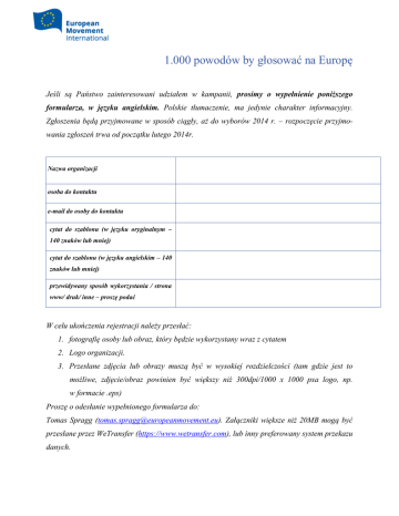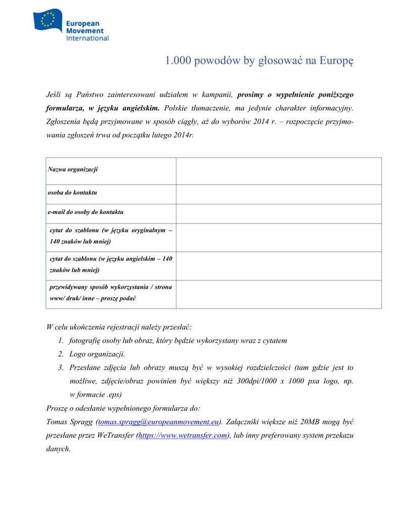 1.000 powodów by głosować na Europę Jeśli są Państwo zainteresowani udziałem w kampanii, prosimy o wypełnienie poniższego formularza, w języku angielskim. Polskie tłumaczenie, ma jedynie charakter informacyjny. Zgłoszenia będą przyjmowane w sposób ciągły, aż do wyborów 2014 r. – rozpoczęcie przyjmowania zgłoszeń trwa od początku lutego 2014r. Nazwa organizacji osoba do kontaktu e-mail do osoby do kontaktu cytat do szablonu (w języku oryginalnym – 140 znaków lub mniej) cytat do szablonu (w języku angielskim – 140 znaków lub mniej) przewidywany sposób wykorzystania / strona www/ druk/ inne – proszę podać W celu ukończenia rejestracji należy przesłać: 1. fotografię osoby lub obraz, który będzie wykorzystany wraz z cytatem 2. Logo organizacji. 3. Przesłane zdjęcia lub obrazy muszą być w wysokiej rozdzielczości (tam gdzie jest to możliwe, zdjęcie/obraz powinien być większy niż 300dpi/1000 x 1000 pxa logo, np. w formacie .eps) Proszę o odesłanie wypełnionego formularza do: Tomas Spragg ([email protected]). Załączniki większe niż 20MB mogą być przesłane przez WeTransfer (https://www.wetransfer.com), lub inny preferowany system przekazu danych.
