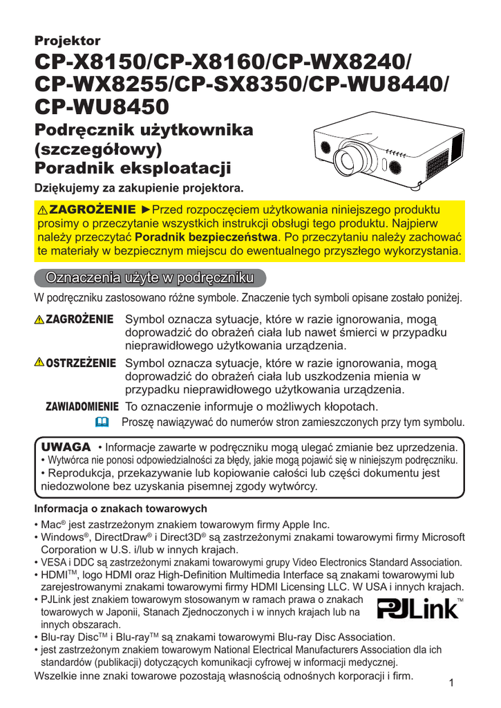 =$*52ĩ(1,( • Przed użyciem projektora przestudiuj dostarczone podręczniki