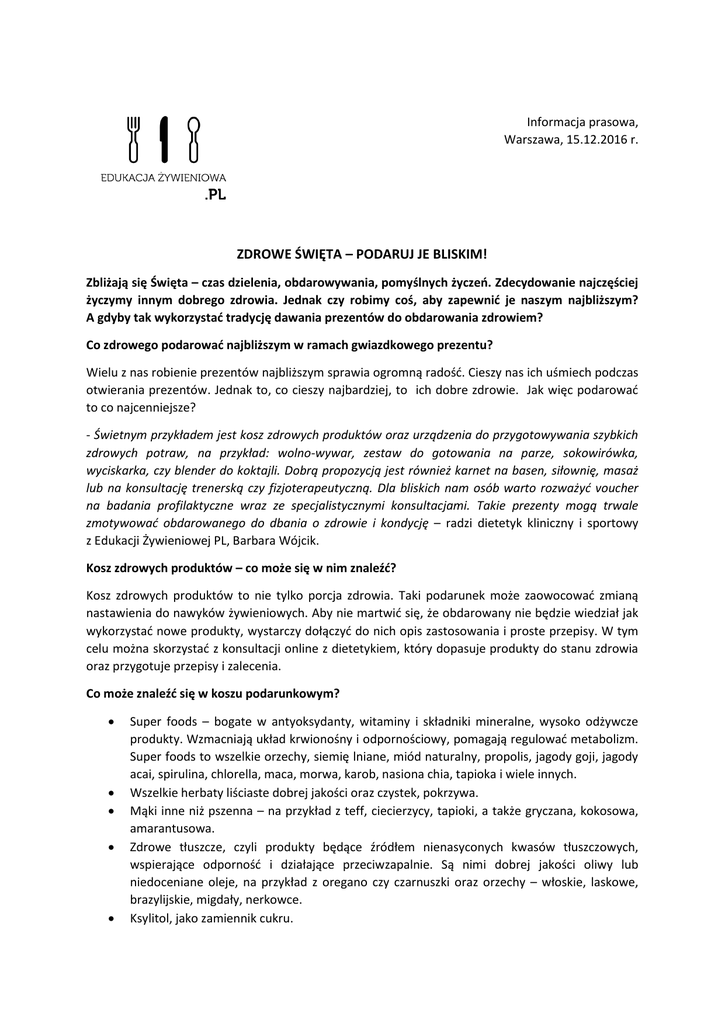 Informacja prasowa, Warszawa, 15.12.2016 r. ZDROWE ŚWIĘTA – PODARUJ JE BLISKIM! Zbliżają się Święta – czas dzielenia, obdarowywania, pomyślnych życzeo. Zdecydowanie najczęściej życzymy innym dobrego zdrowia. Jednak czy robimy coś, aby zapewnid je naszym najbliższym? A gdyby tak wykorzystad tradycję dawania prezentów do obdarowania zdrowiem? Co zdrowego podarowad najbliższym w ramach gwiazdkowego prezentu? Wielu z nas robienie prezentów najbliższym sprawia ogromną radośd. Cieszy nas ich uśmiech podczas otwierania prezentów. Jednak to, co cieszy najbardziej, to ich dobre zdrowie. Jak więc podarowad to co najcenniejsze? - Świetnym przykładem jest kosz zdrowych produktów oraz urządzenia do przygotowywania szybkich zdrowych potraw, na przykład: wolno-wywar, zestaw do gotowania na parze, sokowirówka, wyciskarka, czy blender do koktajli. Dobrą propozycją jest również karnet na basen, siłownię, masaż lub na konsultację trenerską czy fizjoterapeutyczną. Dla bliskich nam osób warto rozważyd voucher na badania profilaktyczne wraz ze specjalistycznymi konsultacjami. Takie prezenty mogą trwale zmotywowad obdarowanego do dbania o zdrowie i kondycję – radzi dietetyk kliniczny i sportowy z Edukacji Żywieniowej PL, Barbara Wójcik. Kosz zdrowych produktów – co może się w nim znaleźd? Kosz zdrowych produktów to nie tylko porcja zdrowia. Taki podarunek może zaowocowad zmianą nastawienia do nawyków żywieniowych. Aby nie martwid się, że obdarowany nie będzie wiedział jak wykorzystad nowe produkty, wystarczy dołączyd do nich opis zastosowania i proste przepisy. W tym celu można skorzystad z konsultacji online z dietetykiem, który dopasuje produkty do stanu zdrowia oraz przygotuje przepisy i zalecenia. Co może znaleźd się w koszu podarunkowym? Super foods – bogate w antyoksydanty, witaminy i składniki mineralne, wysoko odżywcze produkty. Wzmacniają układ krwionośny i odpornościowy, pomagają regulowad metabolizm. Super foods to wszelkie orzechy, siemię lniane, miód naturalny, propolis, jagody goji, jagody acai, spirulina, chlorella, maca, morwa, karob, nasiona chia, tapioka i wiele innych. Wszelkie herbaty liściaste dobrej jakości oraz czystek, pokrzywa. Mąki inne niż pszenna – na przykład z teff, ciecierzycy, tapioki, a także gryczana, kokosowa, amarantusowa. Zdrowe tłuszcze, czyli produkty będące źródłem nienasyconych kwasów tłuszczowych, wspierające odpornośd i działające przeciwzapalnie. Są nimi dobrej jakości oliwy lub niedoceniane oleje, na przykład z oregano czy czarnuszki oraz orzechy – włoskie, laskowe, brazylijskie, migdały, nerkowce. Ksylitol, jako zamiennik cukru. Kasze, na przykład amarantus i komosa ryżowa. Zielona kawa zamiast tradycyjnej. Odżywcze ciasteczka własnej roboty. Zdrowe batony typu RAW, surowa czekolada z dodatkami, surowe kakao. Zdrowy prezent dla dziecka Większośd dzieci jest negatywnie nastawiona do zdrowego jedzenia, a wszelkie posiłki zamieniłaby na słodycze. Aby uchronid pociechy przed poważnymi problemami zdrowotnymi w przyszłości powinniśmy wspierad ich edukację w kwestii zdrowego odżywiania oraz dopingowad podejmowanie wszelkich aktywności fizycznych. - Wbrew pozorom zdrowe prezenty można przygotowad również dla dzieci. Zdecydowanie lepszym i ciekawszym rozwiązaniem niż słodycze będą książeczki o warzywach i owocach, gry pokazujące jak funkcjonuje ludzki organizm czy uczące odróżnid zdrowe posiłki od tych niskowartościowych. Warto również pamiętad o codziennym angażowaniu dzieci w przygotowanie posiłków, dzięki czemu będą rozwijad swój zmysł smaku i umiejętności kulinarne – dodaje Sylwia Górzna, doradca żywieniowy z Edukacji Żywieniowej PL. Święta to czas, który spędzamy w rodzinnym gronie. Przygotowując prezenty warto zadbad o to, aby nasi najbliżsi byli zdrowi i pełni energii oraz by magią świąt cieszyli się przez długie lata. Jak się okazuje, podarowanie komuś dawki zdrowia wcale nie jest takie trudne. Często te najprostsze rozwiązania – takie jak kosz zdrowych produktów – okazują się tymi najskuteczniejszymi. Więcej świątecznych inspiracji oraz porad dotyczących zdrowia znajduje się na stronie: https://edukacjazywieniowa.pl/blog/ Więcej informacji: Sylwia Górzna +48 510 210 618 [email protected] Edukacja Żywieniowa.PL to projekt, którego celem jest upowszechnianie wiedzy o prawidłowym, zdrowym odżywianiu oraz pomoc w trwałej i skutecznej budowie postaw żywieniowych. Specjaliści opracowali autorskie programy edukacyjne przeznaczone dla osób w różnym wieku i o różnych potrzebach żywieniowych. Pozwalają one w krótkim czasie zdobyd zarówno teoretyczną wiedzę o odżywianiu, jak i praktyczne umiejętności związane z samodzielnym komponowaniem zdrowych, zbilansowanych posiłków. Więcej informacji: www.edukacjazywieniowa.pl