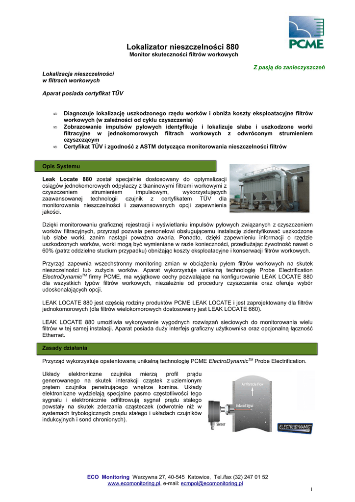 Lokalizator nieszczelności 880 Monitor skuteczności filtrów workowych Z pasją do zanieczyszczeń Lokalizacja nieszczelności w filtrach workowych Aparat posiada certyfikat TÜV • • • Diagnozuje lokalizację uszkodzonego rzędu worków i obniża koszty eksploatacyjne filtrów workowych (w zależności od cyklu czyszczenia) Zobrazowanie impulsów pyłowych identyfikuje i lokalizuje słabe i uszkodzone worki filtracyjne w jednokomorowych filtrach workowych z odwróconym strumieniem czyszczącym Certyfikat TÜV i zgodność z ASTM dotycząca monitorowania nieszczelności filtrów Opis Systemu Leak Locate 880 został specjalnie dostosowany do optymalizacji osiągów jednokomorowych odpylaczy z tkaninowymi filtrami workowymi z czyszczeniem strumieniem impulsowym, wykorzystujących zaawansowanej technologii czujnik z certyfikatem TÜV dla monitorowania nieszczelności i zaawansowanych opcji zapewnienia jakości. Dzięki monitorowaniu graficznej rejestracji i wyświetlaniu impulsów pyłowych związanych z czyszczeniem worków filtracyjnych, przyrząd pozwala personelowi obsługującemu instalację zidentyfikować uszkodzone lub słabe worki, zanim nastąpi poważna awaria. Ponadto, dzięki zapewnieniu informacji o rzędzie uszkodzonych worków, worki mogą być wymieniane w razie konieczności, przedłużając żywotność nawet o 60% (patrz oddzielne studium przypadku) obniżając koszty eksploatacyjne i konserwacji filtrów workowych. Przyrząd zapewnia wszechstronny monitoring zmian w obciążeniu pyłem filtrów workowych na skutek nieszczelności lub zużycia worków. Aparat wykorzystuje unikalną technologię Probe Electrification ElectroDynamicTM firmy PCME, ma wyjątkowe cechy pozwalające na konfigurowanie LEAK LOCATE 880 dla wszystkich typów filtrów workowych, niezależnie od procedury czyszczenia oraz oferuje wybór udoskonalających opcji. LEAK LOCATE 880 jest częścią rodziny produktów PCME LEAK LOCATE i jest zaprojektowany dla filtrów jednokomorowych (dla filtrów wielokomorowych dostosowany jest LEAK LOCATE 660). LEAK LOCATE 880 umożliwia wykonywanie wygodnych rozwiązań sieciowych do monitorowania wielu filtrów w tej samej instalacji. Aparat posiada duży interfejs graficzny użytkownika oraz opcjonalną łączność Ethernet. Zasady działania Przyrząd wykorzystuje opatentowaną unikalną technologię PCME ElectroDynamicTM Probe Electrification. Układy elektroniczne czujnika mierzą profil prądu generowanego na skutek interakcji cząstek z uziemionym prętem czujnika penetrującego wnętrze komina. Układy elektroniczne wydzielają specjalne pasmo częstotliwości tego sygnału i elektronicznie odfiltrowują sygnał prądu stałego powstały na skutek zderzania cząsteczek (odwrotnie niż w systemach trybologicznych prądu stałego i układach czujników indukcyjnych i sond chronionych). ECO Monitoring Warzywna 27, 40-545 Katowice, Tel./fax (32) 247 01 52 www.ecomonitoring.pl, e-mail: [email protected] 1 Korzyści wynikające z technologii PCME ElectroDynamicTM Probe Electrification: • • • Generowany sygnał jest niezniekształcony zanieczyszczeniem pręta czujnika (stwarzającym problemy dryftu sygnału w innych systemach). Generowany sygnał jest niezniekształcony prędkością zmian w zakresie występującym w typowym filtrze workowym ( patrz oddzielny certyfikat TÜV dla technologii PCME Ltd) Generowany sygnał jest stały, pewny i nie wykazujący dryftu na skutek występowania elektryczności statycznej, która może występować w systemach z chronioną sondą w zastosowaniach do suchych spalin. Zalety dodatkowe Systemy ElectroDynamicTM Probe Electrification posiadają ponadto następujące zalety: • • • • Optymalne widmo częstotliwości dla poszerzenia zakresu prędkości przy którym układ nie wykazuje czułości skrośnej do zmian prędkości (patrz certyfikaty TÜV). Opcje podnoszące zapewnienie jakości (patrz wyżej). Unikalne cyfrowe algorytmy przetwarzania sygnału dające szeroki zakres dynamiki wymagany dla dokładności pomiarów w trakcie wstrzymania ruchu instalacji w trakcie procedury czyszczenia i wysoką powtarzalność śledzenia sygnału (patrz oddzielny raport TÜV). Wykorzystanie identycznej technologii jak w przypadku CEMS (Continuous Emission Monitoring PCME zatwierdzonej przez MCERTS i TÜV. Zatwierdzenia parametrów przyrządu Oprócz zdolności lokalizowania nieszczelności, LEAK LOCATE 880 jest zaprojektowany dla spełnienia wymogów certyfikatu jako Monitor nieszczelności flitra i powiązanych certyfikatów produktowych dla lokalizatorów nieszczelności zgodnie ze standardami europejskimi i ASTM. Pyłomierz posiada zatwierdzenia TÜV jako monitor nieszczelności filtra i spełnia wymagania ASTM D 6026- 03 dla monitorów nieszczelności worków filtracyjnych. Przyrząd posiada automatyczne wewnętrzne zerowanie i odnośne cechy zapewnienia jakości wymagane dla spełnienia tych norm oszczędzając użytkownikowi znaczące ilości czasu w stosunku do przeprowadzenia alternatywnych procedur manualnych. Funkcje zaawansowane LEAK LOCATE 880 zapewnia wszechstronne lokalizowanie nieszczelności i zdolność do wykrywania nieszczelności w oparciu o następujące standardowe własności, dzięki zdalnemu interfejsowi użytkownika: • • • • • • Wielojęzyczną opcję wspomagania operatora Wyświetlacz graficzny rejestracji impulsu dla łatwej identyfikacji rzędu uszkodzonych worków Jednogodzinny rejestr impulsu zgodny z wydłużonym cyklem czyszczenia Układ kontrolny z graficznym menu z ikonami z zabezpieczeniem za pomocą hasła Rejestr sygnałów alarmowych, ekran zapewnienia jakości, wykresy słupkowe, wyświetlacz graficzny, rejestr impulsów oraz funkcje ustawiania przyrządu Układ sterujący dostosowany do pracy w sieci (LEAK LOCATE 880 PLUS) dostosowany do jednoczesnej kontroli 12 czujników pracujących w pojedynczej sieci ECO Monitoring Warzywna 27, 40-545 Katowice, Tel./fax (32) 247 01 5