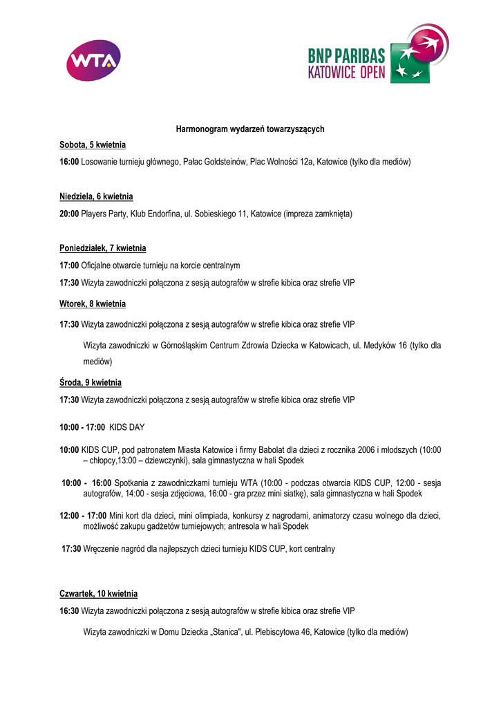Harmonogram wydarzeń towarzyszących Sobota, 5 kwietnia 16:00 Losowanie turnieju głównego, Pałac Goldsteinów, Plac Wolności 12a, Katowice (tylko dla mediów) Niedziela, 6 kwietnia 20:00 Players Party, Klub Endorfina, ul. Sobieskiego 11, Katowice (impreza zamknięta) Poniedziałek, 7 kwietnia 17:00 Oficjalne otwarcie turnieju na korcie centralnym 17:30 Wizyta zawodniczki połączona z sesją autografów w strefie kibica oraz strefie VIP Wtorek, 8 kwietnia 17:30 Wizyta zawodniczki połączona z sesją autografów w strefie kibica oraz strefie VIP Wizyta zawodniczki w Górnośląskim Centrum Zdrowia Dziecka w Katowicach, ul. Medyków 16 (tylko dla mediów) Środa, 9 kwietnia 17:30 Wizyta zawodniczki połączona z sesją autografów w strefie kibica oraz strefie VIP 10:00 - 17:00 KIDS DAY 10:00 KIDS CUP, pod patronatem Miasta Katowice i firmy Babolat dla dzieci z rocznika 2006 i młodszych (10:00 – chłopcy,13:00 – dziewczynki), sala gimnastyczna w hali Spodek 10:00 - 16:00 Spotkania z zawodniczkami turnieju WTA (10:00 - podczas otwarcia KIDS CUP, 12:00 - sesja autografów, 14:00 - sesja zdjęciowa, 16:00 - gra przez mini siatkę), sala gimnastyczna w hali Spodek 12:00 - 17:00 Mini kort dla dzieci, mini olimpiada, konkursy z nagrodami, animatorzy czasu wolnego dla dzieci, możliwość zakupu gadżetów turniejowych; antresola w hali Spodek 17:30 Wręczenie nagród dla najlepszych dzieci turnieju KIDS CUP, kort centralny Czwartek, 10 kwietnia 16:30 Wizyta zawodniczki połączona z sesją autografów w strefie kibica oraz strefie VIP Wizyta zawodniczki w Domu Dziecka „Stanica", ul. Plebiscytowa 46, Katowice (tylko dla mediów) Czwartek, 10 kwietnia – Piątek, 11 kwietnia Konferencja trenerów tenisa organizowana przez Babolat, sala gimnastyczna w hali Spodek. Czwartek, 10 kwietnia – Niedziela, 13 kwietnia Turniej amatorski i tenisa na wózkach, pod patronatem Miasta Katowice i firmy Babolat, Bażantowo Sport, ul. Pijarska 3, Katowice, otwarcie turniejów z udziałem zawodniczki WTA, czwartek, 10 kwietnia, godz. 17.00 Piątek, 11.04 kwietnia 18:30 Wizyta zawodniczki połączona z sesją autografów w strefie kibica oraz strefie VIP 22:30 Players Party dla uczestników turnieju amatorskiego i na wózkach, Klub Endorfina, ul. Sobieskiego 11, Katowice (impreza otwarta) Sobota, 12 kwietnia 7:00 - 11:00 turniej VIP BNP Paribas (turniej zamknięty) 20:00 Turniej tenisa dla dziennikarzy pod patronatem Miasta Katowice 20:00 Oficjalny bankiet BNP Paribas Katowice Open, Pałac Goldsteinów, Plac Wolności 12a, Katowice (impreza zamknięta) Po meczu półfinałowym gry podwójnej: prezentacja Babolat PLAY – europejska premiera pierwszej na świecie rakiety gromadzącej dane na temat gry, prezentacji rakiety dokona Marcin Daniec Po pierwszym meczu półfinałowym gry pojedynczej: prezentacja Akademii Tenisowej Karoliny Woźniackiej, prowadzi Maciej Wściubiak – trener Kamila Majchrzaka Niedziela, 13 kwietnia 12:00 Finał turnieju tenisa na wózkach na korcie centralnym 15:00 Finał gry podwójnej, ceremonia wręczenia nagród dla zawodniczek oraz dla najlepszych zawodników turnieju amatorskiego i turnieju tenisa na wózkach 17:30 Finał gry pojedynczej, ceremonia wręczenia nagród dla zawodniczek oraz zakończenie turnieju