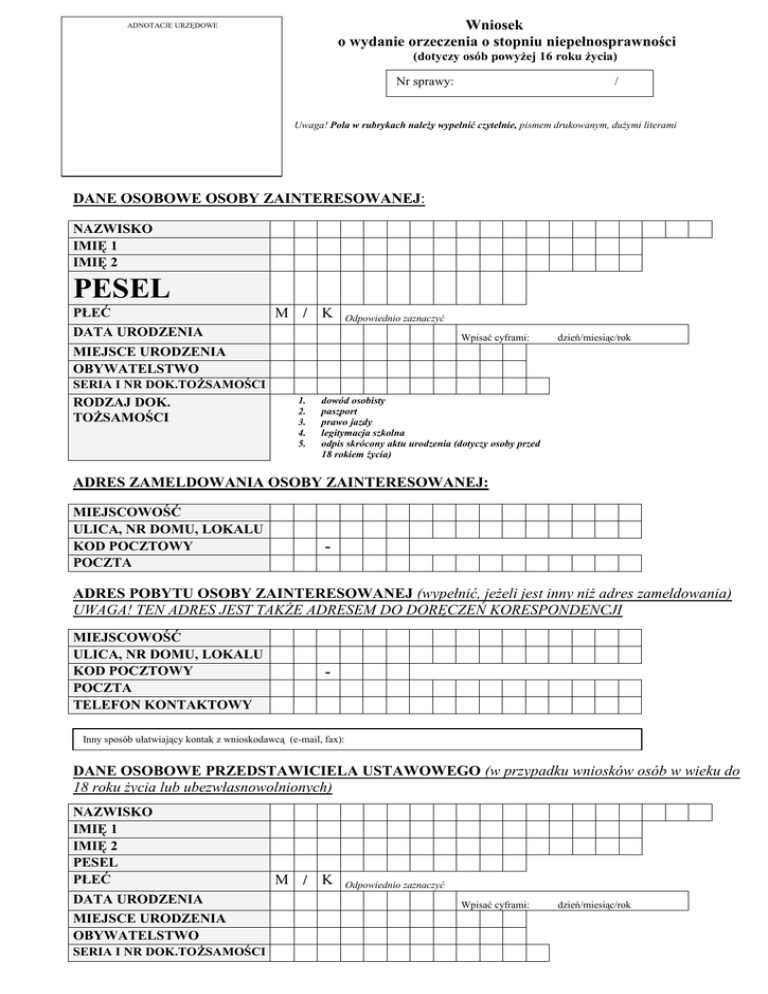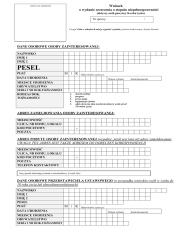 Wniosek o wydanie orzeczenia o stopniu niepełnosprawności ADNOTACJE URZĘDOWE (dotyczy osób powyżej 16 roku życia) Nr sprawy: / Uwaga! Pola w rubrykach należy wypełnić czytelnie, pismem drukowanym, dużymi literami DANE OSOBOWE OSOBY ZAINTERESOWANEJ: NAZWISKO IMIĘ 1 IMIĘ 2 PESEL PŁEĆ M // K Odpowiednio zaznaczyć DATA URODZENIA Wpisać cyframi: dzień/miesiąc/rok MIEJSCE URODZENIA OBYWATELSTWO SERIA I NR DOK.TOŻSAMOŚCI RODZAJ DOK. TOŻSAMOŚCI 1. 2. 3. 4. 5. dowód osobisty paszport prawo jazdy legitymacja szkolna odpis skrócony aktu urodzenia (dotyczy osoby przed 18 rokiem życia) ADRES ZAMELDOWANIA OSOBY ZAINTERESOWANEJ: MIEJSCOWOŚĆ ULICA, NR DOMU, LOKALU KOD POCZTOWY POCZTA - ADRES POBYTU OSOBY ZAINTERESOWANEJ (wypełnić, jeżeli jest inny niż adres zameldowania) UWAGA! TEN ADRES JEST TAKŻE ADRESEM DO DORĘCZEŃ KORESPONDENCJI MIEJSCOWOŚĆ ULICA, NR DOMU, LOKALU KOD POCZTOWY POCZTA TELEFON KONTAKTOWY - Inny sposób ułatwiający kontak z wnioskodawcą (e-mail, fax): DANE OSOBOWE PRZEDSTAWICIELA USTAWOWEGO (w przypadku wniosków osób w wieku do 18 roku życia lub ubezwłasnowolnionych) NAZWISKO IMIĘ 1 IMIĘ 2 PESEL PŁEĆ DATA URODZENIA MIEJSCE URODZENIA OBYWATELSTWO SERIA I NR DOK.TOŻSAMOŚCI M // K Odpowiednio zaznaczyć Wpisać cyframi: dzień/miesiąc/rok RODZAJ DOK. TOŻSAMOŚCI 1. 2. 3. 4. 5. dowód osobisty paszport prawo jazdy legitymacja szkolna odpis skrócony aktu urodzenia ADRES ZAMELDOWANIA/POBYTU PRZEDSTAWICIELA USTAWOWEGO / (w przypadku wniosków osób w wieku do 18 roku życia lub ubezwłasnowolnionych) MIEJSCOWOŚĆ ULICA, NR DOMU, LOKALU KOD POCZTOWY POCZTA TELEFON KONTAKTOWY - ZWRACAM SIĘ Z PROŚBĄ O WYDANIE ORZECZENIA O STOPNIU NIEPEŁNOSPRAWNOŚCI DLA CELÓW: X Zaznaczyć Odpowiedniego zatrudnienia Szkolenia Uczestnictwa w terapii zajęciowej Konieczność zaopatrzenia w przedmioty ortopedyczne i środki pomocnicze Korzystania z systemu środowiskowego wsparcia w samodzielnej egzystencji Korzystania z uprawnień na podstawie art. 8 ust. z 20.06.1977 r. Prawo o ruchu drogowym (Dz.U. Z 2005 R., Nr 108, poz. 908) Karta parkingowa Korzystania ze świadczeń pomocy społecznej Uzyskania zasiłku pielęgnacyjnego Uzyskania przez opiekuna świadczenia pielęgnacyjnego Zamieszkiwania w oddzielnym pokoju Uzyskania przez opiekuna urlopu wychowawczego w dodatkowym wymiarze Korzystania z innych ulg i uprawnień na podstawie odrębnych przepisów Inne-wymienić jakich: np. korzystanie z rehabilitacji DANE DOTYCZACE SYTUACJI SPOŁECZNEJ I ZAWODOWEJ: Zaznaczyć X STAN CYWILNY: WYKONYWANIE CZYNNOŚCI SAMOOBSŁUGOWYCH PORUSZANIE SIĘ PROWADZENIE GOSPODARSTWA DOMOWEGO WYKSZTAŁCENIE kawaler / panna żonaty / zamężna separowany / separowana wdowiec / wdowa rozwiedziony / rozwiedziona samodzielnie z pomocą opieka samodzielnie z pomocą opieka samodzielnie z pomocą opieka wyższe średnie zasadnicze podstawowe podstawowe nieukończone i bez wykształcenia szkolnego ZAWÓD WYUCZONY CZY AKTUALNIE WYKONUJE PRACĘ ? ZAWÓD WYKONYWANY OŚWIADCZENIA: Zaznaczyć X CZY POBIERA ŚWIADCZENIE RENTOWE ? renta szkoleniowa renta z tytułu częściowej niezdolności do pracy NAZWA POBIERANEGO ŚWIADCZENIA renta z tytułu całkowitej niezdolności RENTOWEGO do pracy renta z tytułu całkowitej niezdolności do pracy i do samodzielnej egzystencji renta rolnicza z tytułu niezdolności do pracy renta rolnicza szkoleniowa wojskowa renta inwalidzka policyjna renta inwalidzka renta inwalidzka z powodu inwalidztwa I gr renta inwalidzka z powodu inwalidztwa II gr renta inwalidzka z powodu inwalidztwa III gr CZY OSOBA BYŁA / JEST ZALICZONA DO STOPNIA była jest NIEPEŁNOSPRAWNOŚCI LUB NIEPEŁNOSPRAWNOŚCI ? CZY ZE WZGLĘDU NA STAN ZDROWIA, ZAINTERESOWANY (A) może POSIEDZENIE SKŁADU ORZEKAJACEGO? CZY ZE WZGLĘDU NA STAN ZDROWIA, ZAINTERESOWANY (A) nie może POSIEDZENIE SKŁADU ORZEKAJACEGO? PRZYBYĆ NA Zaznaczyć X PRZYBYĆ NA Zaznaczyć X Wniosek składam ze względu na: Zaznaczyć X Pierwszy wniosek Zmiana stanu zdrowia w trakcie ważności dotychczasowego orzeczenia Ponowne wydanie orzeczenia po upływie ważności dotychczasowego OŚWIADCZAM, ŻE DANE ZAWARTE WE WNIOSKU SĄ ZGODNE ZE STANEM FAKTYCZNYM I PRAWNYM ORAZ JESTEM ŚWIADOMY/A ODPOWIEDZIALNOŚCI KARNEJ ZA ZEZNANIE LUB ZATAJENIE PRAWDY. ........................................., dnia ................................ ............................................................ (podpis z imienia i nazwiska osoby zainteresowanej) INFORMACJE DODATKOWE: 3. 4. składając wniosek należy okazać dokument potwierdzający tożsamość osoby zainteresowanej, wymieniony we wniosku, do wniosku dołącza się dokumentację medyczną i inne dokumenty medyczne mogące mieć wpływ na ustalenie wskazań do ulg i uprawnień (przyjmujemy wyłącznie kserokopie tych dokumentów potwierdzone za zgodność z oryginałem przez placówkę służby zdrowia lub należy okazać oryginały przy składaniu wniosku), jeżeli wniosek składa opiekun prawny, to należy załączyć postanowienie sądu o ustanowieniu opiekuna prawnego, właściwość miejscową zespołu orzekającego ustala się według miejsca pobytu w przypadku osób: bezdomnych, przebywających poza miejscem stałego pobytu ponad dwa miesiące ze względów zdrowotnych lub rodzinnych, przebywających w zakładach karnych i poprawczych, przebywających w domach pomocy społecznej i ośrodkach wsparcia w rozumieniu przepisów o pomocy społecznej. 5. właściwość miejscową zespołu orzekającego ustala się według miejsca stałego pobytu w rozumieniu przepisów o ewidencji ludności i dowodach osobistych. 1. 2. Spis dokumentów medycznych załączonych do wniosku ( ułożyć według daty sporządzenia) L.p. Nazwa dokumentu medycznego Data sporządzenia ………………., dnia ......................... ................................. (podpis) Nie przyjmujemy oryginałów dokumentów medycznych wyłącznie kserokopie potwierdzone za zgodność z oryginałem. Kserokopię po
