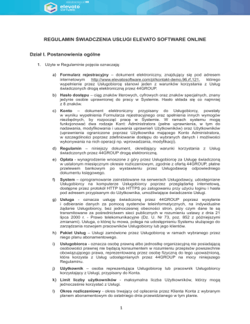 REGULAMIN ŚWIADCZENIA USŁUGI ELEVATO SOFTWARE ONLINE Dział I. Postanowienia ogólne 1. Użyte w Regulaminie pojęcia oznaczają: a) Formularz rejestracyjny – dokument elektroniczny, znajdujący się pod adresem internetowym http://www.elevatosoftware.com/pl/kontakt-demo,96,rf,121, którego wypełnienie przez Usługobiorcę stanowi jeden z warunków korzystania z Usług świadczonych drogą elektroniczną przez 44GROUP. b) Hasło dostępu – ciąg znaków literowych, cyfrowych oraz znaków specjalnych, znany jedynie osobie uprawnionej do pracy w Systemie. Hasło składa się co najmniej z 8 znaków. c) Konto – dokument elektroniczny przypisany do Usługobiorcy, powstały w wyniku wypełnienia Formularza rejestracyjnego oraz spełnienia innych wymogów niezbędnych, by rozpocząć pracę w Systemie. W ramach systemu mogą funkcjonować dwa rodzaje Kont: Administratora (pełne uprawnienia, w tym do nadawania, modyfikowania i usuwania uprawnień Użytkowników) oraz Użytkowników (uprawnienia ograniczone poprzez Użytkownika mającego Konto Administratora, w szczególności poprzez zdefiniowanie dostępu do wybranych danych i możliwości wykonywania na nich operacji np. wprowadzania, modyfikacji). d) Regulamin – niniejszy dokument, określający warunki korzystania z Usług świadczonych przez 44GROUP drogą elektroniczną. e) Opłata - wynagrodzenie wnoszone z góry przez Usługobiorcę za Usługę świadczoną w ustalonym miesięcznym okresie rozliczeniowym, zgodnie z ofertą 44GROUP, płatne przelewem bankowym po wystawieniu przez Usługodawcę odpowiedniego dokumentu księgowego. f) System – oprogramowanie zainstalowane na serwerach Usługodawcy, udostępniane Usługobiorcy na komputerze Usługobiorcy poprzez przeglądarkę internetową, dostępne przez protokół HTTP lub HTTPS po zalogowaniu przy użyciu loginu i hasła pod adresem przypisanym do Użytkownika, umożliwiające świadczenie Usługi. g) Usługa - oznacza usługę świadczoną przez 44GROUP poprzez wysyłanie i odbieranie danych za pomocą systemów teleinformatycznych, na indywidualne żądanie Usługobiorcy, bez jednoczesnej obecności stron, przy czym dane te są transmitowane za pośrednictwem sieci publicznych w rozumieniu ustawy z dnia 21 lipca 2000 r. - Prawo telekomunikacyjne (Dz. U. Nr 73, poz. 852 z późniejszymi zmianami). Usługa, o której tu mowa, polega na udostępnieniu Systemu służącego do zarządzania rozwojem pracowników Usługobiorcy lub jego klientów. h) Pakiet Usług – Usługi zamówione przez Usługobiorcę w ramach wybranego przez niego planu abonamentowego. i) Usługobiorca - oznacza osobę prawną albo jednostkę organizacyjną nie posiadającą osobowości prawnej nie będącą konsumentem w rozumieniu przepisów powszechnie obowiązującego prawa, reprezentowaną przez osobę fizyczną do tego upoważnioną, która korzysta z Usług udostępnianych przez 44GROUP na mocy niniejszego Regulaminu. j) Użytkownik – osoba reprezentująca Usługobiorcę lub pracownik Usługobiorcy korzystający z Usługi, przypisany do Konta. k) Limit liczby użytkowników - maksymalna liczba Użytkowników, którzy mogą jednocześnie korzystać z Usługi. l) Okres rozliczeniowy - okres trwający od opłacenia przez Klienta Konta z wybranym planem abonamentowym do ostatniego dnia przewidzianego w tym planie. 1 m) Usługodawca, 44GROUP - oznacza 44GROUP Sp. z o.o. z siedzibą w Rybniku przy ul. 1 Maja 86a, wpisaną do rejestru przedsiębiorców prowadzonego przez Sąd Rejonowy w Gliwicach, X Wydział Gospodarczy Krajowego Rejestru Sądowego pod numerem KRS 0000351970, NIP 6423123747, nr REGON 241539117, o kapitale zakładowym 6250 zł. n) Ustawa - ustawa z dnia 29 sierpnia 1997 r. o ochronie danych osobowych (tekst jednolity: Dz.U. z 2014 r., poz. 1182 z późn. zm.). 2. Niniejszy Regulamin określa zasady i warunki techniczne świadczenia przez 44GROUP Usług drogą elektroniczną, o których mowa w Dziale II. 3. Podczas korzystania z usług Usługodawcy w komputerze albo urządzeniu przenośnym Użytkownika instalowane są pliki typu "cookies". Instalacja plików jest konieczna do prawidłowego świadczenia usług. Szczegóły instalowania plików zawiera Polityka prywatności. 4. Projekt Elevato Software jest współfinansowany ze środków Europejskiego Funduszu Rozwoju Regionalnego w ramach Programu Operacyjnego Innowacyjna Gospodarka. Dział II. Rodzaje i zakres usług świadczonych w oparciu o Regulamin 1. 44GROUP świadczy Usługi dostępu do Systemu, za pośrednictwem którego możliwy jest: a) Moduł Pracownicy - Gromadzenie dokumentacji pracowników, w tym: i. danych pracowników, ii. dokumentów i innych plików dotyczących pracowników, iii. informacji o wykonywanych przez pracowników zadaniach na stanowisku pracy oraz o pozycji i. ii. iii. iv. v. vi. vii. i. ii. iii. iv. v. vi. i. ii. iii. iv. w strukturze organizacji. b) Moduł Oceny - Organizowanie kampanii oceny online, w tym: ocen okresowych pracowników, ocen 360 stopni, ocen 270 stopni ocen 180 stopni (w tym ocen z rozmową oceniającą), przeglądów kompetencji, generowanie raportów z ocen, tworzenie planów rozwoju pracowników. c) Moduł Rekrutacja - Zarządzanie projektami rekrutacyjnymi, w tym: zarządzanie rekrutacjami, zarządzanie ofertami pracy, tworzenie formularzy aplikacji, umożliwienie aplikowania online użytkownikom Internetu, przeglądanie danych kandydatów i ich przeszukiwanie, dodawanie kandydatów do bazy za pomocą dodatku do programu Microsoft Outlook. d) Moduł Szkolenia - Zarządzanie katalogiem szkoleń, w tym: zarządzanie bazą szkoleń, zarządzanie budżetami szkoleń, monitorowanie planów rozwoju pracowników, monitorowanie i zatwierdzanie szkoleń pracowników. e) Moduł Narzędzia HR - Tworzenie opisów stanowisk. f) Moduł Narzędzia HR - Zarządzanie biblioteką dokumentów. g) Moduł Narzędzia HR - Zgłaszanie i obsługa zgłoszeń od użytkowników systemu, h) Wysyłaniu za pośredni