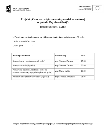 Projekt „Czas na zwiększenie aktywności zawodowej w gminie Krynica-Zdrój”. HARMONOGRAM ZAJĘĆ I. Pozytywne myślenie szansą na efektywny start – kurs podstawowy – 32 godz. Liczba uczestników: 9 os. Liczba grup: 1 Nazwa przedmiotu Prowadzący Data Komunikacja i asertywność. (8 godz.) mgr Tomasz Zacłona 13.03 Autoprezentacja (8 godz.) mgr Tomasz Zacłona 20.03 Pozytywne myślenie. Radzenie sobie ze stresem – warsztaty z psychologiem. (8 godz.) mgr Maria Lelito 10.03 Poszukiwanie pracy w zawodzie (8 godz.) mgr Tomasz Jabłoński 06.03 Projekt współfinansowany przez Unię Europejską w ramach Europejskiego Funduszu Społecznego