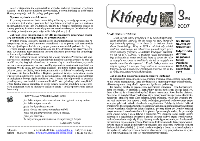 Jeżeli w ciągu dnia, i w jakimś ciężkim wypadku zachodzi poważna i wyjątkowa sytuacja – to nie należy modlitwą zarywać nocy, a to tym bardziej, że dość często Siostry je zarywają i tak dla posługi podopiecznych. Sprawa czytania w refektarzu. Przy małej stosunkowo ilości czasu, którym Siostry dysponują, sprawa czytania w refektarzu jest ważną i powinna być dopełniana pod kątem potrzeb zarówno duchowych Sióstr jak i ich wiadomości. Trudno tu o receptę, narzucenie czegoś, tę sprawę powinny Przełożone rozwiązywać na zasadzie własnych doświadczeń wymieniając je i wzajemnie pożyczając sobie dobrą lekturę. […] Jak jest lepiej postępować: czy dla interesantów przerywać modlitwę czy ustalić pewną godzinę ich przyjmowania? Problem trudny i złożony. Jednak cechą charakterystyczną Zgromadzenia Albertyńskiego jest to, że nikt nie musi wyczekiwać – co na pewno robi bardzo wiele dobrego i jest lepsze. Ludzie odczytują w tym uszanowanie ich godności ludzkiej. Trzeba jednak dużej roztropności, aby dla byle drobiazgu nie przerywać ćwiczeń. Ale pomimo tego zasadnicza postawa służebnej gotowości dla potrzebujących winna być zadeklarowana. Pod tym też kątem trzeba formować tak własną modlitwę Przełożonej jak i postawę Sióstr. Punktem wyjścia na modlitwie musi być takie ustawienie, że chce się modlić tak, aby Bóg był zadowolony i to zawsze. Czy to modlitwa łatwa, czy trudna, czy z roztargnieniami, czy bez – co Bóg daje należy przyjmować i spełniać jak najlepiej. Wtedy także, gdy wywołają z kaplicy i modlitwa zostaje przerwaną, jest tylko to: „teraz tak Ciebie, Panie Boże, mam czcić – to dobrze” – za chwilę się wraca i rzecz nie burzy kontaktu z Bogiem, ponieważ istnieje nastawienie stania w gotowości do dyspozycji Bożej, do dawania siebie. I jak długo ta postawa istnieje to teologicznie biorąc ciągle modlitwa trwa. Tomasz dał odpowiedź na pytanie: „jak długo w życiu człowiek trwa na modlitwie?” taką: „jak długo pełni wolę Bożą”. O tym trzeba bardzo pamiętać, bo wtedy wbrew pozorom modlitwa się nie przerywa. Natomiast jeżeli na modlitwie szuka się siebie – to takie przerywania bardzo denerwują. ======================================================== PRZYWRACAĆ NADZIEJĘ SAMYM SOBIE Jest takie miejsce, niekoniecznie na ziemi, gdzieś za horyzontem. Jest takie miejsce we mnie: gdzie lew i jagnię leżą razem gdzie słabość ma szansę na większa miłość, gdzie ból już nie przesłania piękna i radości, gdzie jest iskierka... To miejsce mojej nowej nadziei ze zwycięskiego Krzyża s. Agnieszka Konefał ======================================================== Odpowies. Agnieszka Koteja, [email protected] [0-18/20-125-49] dzialni br. Marek Bartoś, [email protected] [0-12/42-95-664] Któredy ? 3 (15 ) 2007 SPAĆ BEZ KOŁYSANKI „Pan Bóg na pewno przyjmie i to, że na modlitwie umęczone zakonnice usypiają, ale nie będzie rad tym, którzy do tego kołysankę śpiewają” – to słowa śp. ks. biskupa Stanisława Smoleńskiego, który w 1978 r. udzielał odpowiedzi siostrom przełożonym na zakończenie prowadzonych przez siebie rekolekcji (fragment „o ludziach trudnych” drukowany był już w n. 9/2006). W Wielkim Poście zamieszczamy jego wskazania na temat modlitwy, które są cenne nie tylko ze względu na pomoc w modlitwie, ale też ze względu na sposób poszukiwania odpowiedzi. Ksiądz Biskup szuka rozwiązań zgodnych z naszym charyzmatem, w poszanowaniu tradycji, ale też z wolnością powalającą otworzyć się na to, co nowe, inne, lepsze na dzień dzisiejszy. KS. BISKUP STANISŁAW SMOLEŃSKI Odpowiedzi dawane na pytania Sióstr Przełożonych (cz. II) Kalatówki 1978 Jak może być dziś zrealizowana sprawa Pustelni? W dzisiejszych czasach to sprawa ogromnie trudna, a równocześnie taka, z której nie wolno zrezygnować. Teraz chodzi raczej o moment pewnego odosobnienia, niż o stronę materialną, choć i ta powinna być brana pod uwagę. Im bardziej Siostry są przemęczone psychicznie i fizycznie – tym bardziej problem jest palący. W pismach S. Bernardyny uderza myśl Sługi Bożego [czyli św. Brata Alberta], że w Pustelni winny być Siostry rezerwowe. Rzecz bardzo ciekawa. Znaczy to, ze mają być Siostry oddające się w pewnym okresie specjalnie skupieniu, modlitwie i stanowić mają jakby rezerwę, grupę awaryjną, wtedy gdy w jakimś Domu ktoś zachoruje. Dziś sprawa o wiele trudniejsza, ponieważ trudno tworzyć grupy awaryjne, gdy brak osób do obsadzenia w ogóle etatów. Dałoby się jednak i dziś coś zrobić: przy dzisiejszych stosunkowo dobrych warunkach komunikacyjnych istnieje łatwość wysyłania choćby na dzień skupienia, po parę Sióstr do Domów bardziej przystosowanych do odosobnienia i skupienia. Sprawa o tyle ważna, że poza miejscem własnej pracy o wiele łatwiej o skupienie. We własnym Domu ciągle Siostry ocierają się o zagadnienia związane z pracą i te same osoby i często w tych warunkach odosobnienie staje się fikcją. Sprawą władz Zgromadzenia jest konieczność zatroszczenia się o samą instytucję Pustelni w dostosowaniu do dzisiejszych warunków: to musi się ocalić, ponieważ było pomyślane jako konieczny warunek i element duchowości albertyńskiej. [...] Jeżeli chodzi o wyjazdy z Domu na dzień skupienia nie wydaje się to być sprzeczne z duchem ubóstwa, bo ceny przejazdów nie są wysokie, a dobro wynikające z tego jest niewspółmiernie większe. Jaka powinna być pobożność albertyńska? Znawcy pobożności albertyńskiej uważali ją za wybitnie ludową i byli zdania, że taką powinna pozostać. Wyrażała się ona w długich pacierzach ustnych odmawianych bardzo ofiarnie – dziś zrobiono pewne ustępstwa na rzecz modlitwy liturgicznej, którą jednak raczej „doczepiono” do dawnych modlitw uważając, że zmiana byłaby odstępstwem od tradycji. Tymczasem dz