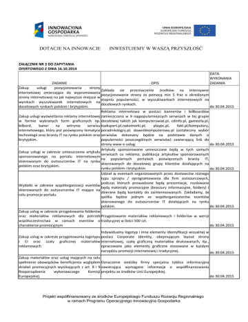 DOTACJE NA INNOWACJE INWESTUJEMY W WASZĄ PRZYSZŁOŚĆ ZAŁĄCZNIK NR 2 DO ZAPYTANIA OFERTOWEGO Z DNIA 16.10.2014 DATA WYKONANIA ZADANIA ZADANIE OPIS Zakup usługi pozycjonowania strony Zakłada sie przeznaczenie środków na intensywne internetowej zmierzające do wypromowania pozycjonowanie strony za pomocą min 5 fraz o określonym strony internetowej na jak najwyższe miejsce w stopniu popularności, w wyszukiwarkach internetowych na wynikach wyszukiwarek internetowych na docelowych rynkach. docelowych rynkach polskim i brytyjskim. do 30.04.2015 Reklama internetowa w postaci bannerów i billboardów Zakup usługi wyświetlania reklamy internetowej zamieszczana w 9 najpopularniejszych serwisach w tej grupie w formie wybranych form graficznych np. docelowej takich jak komputerswiat.pl, cdinfo.pl, gamezila.pl, bilbord, baner na witrynie serwisu ksekspert.pl,nakomorki.pl; playpc.pl, fakt.pl/komputery, internetowego, który jest poświęcony tematyce poradnikdogry.pl; slownikkomputerowy.pl (ostateczny wybór technologii oraz branży IT na rynku polskim oraz serwisów dokonany będzie na podstawie danych o brytyjskim. popularności poszczególnych serwisów) zawierającą link do strony www e-usług. do 30.04.2015 Artykuły sponsorowane umieszczane będą w tych samych Zakup usługi w zakresie umieszczenia artykułu serwisach co reklama; publikacja artykułów sponsorowanych sponsorowanego na portalu internetowym na popularnych portalach poświęconych branży IT, skierowanym do outsourcerów IT na rynku skierowanych do docelowej grupy klientów działających na polskim oraz brytyjskim. rynku polskim i brytyjskim. do 30.04.2015 Udział w eventach organizowanych przez dostawców różnego typu sprzętu / oprogramowania dla firm outsourcowych, podczas których prowadzone będą prezentacje, rozdawane Wydatki w zakresie współorganizacji eventów będą materiały promocyjne (broszury informacyjne, foldery) i skierowanych do outsourcerów IT mające na zbierane będą kontakty do zainteresowanych. Zakładamy, że celu promocje portalu. spółka będzie jednym ze współorganizatorów eventów skierowanego do outsourcerów IT działających na rynku polskim. do 30.04.2015 Zakup usług w zakresie przygotowania folderów oraz materiałów reklamowych dla potrzeb Przygotowanie materiałów reklamowych i folderów w wersji współuczestnictwa w ramach eventów o tradycyjnej w ilości 500 szt. charakterze promocyjnym do 30.04.2015 Indywidualny logotyp i inne elementy identyfikacji wizualnej w Zakup usług w zakresie przygotowania logotypu postaci Corporate Identity, obejmującym layout strony i CI oraz szaty graficznej materiałów internetowej, szatę graficzną materiałów drukowanych, itp., reklamowych opracowane jako elementy graficzne stosowane w każdym narzędziu promocji internetowej i tradycyjnej. do 30.04.2015 Zakup materiałów oraz usług mających na celu spełnienie obowiązków beneficjenta względem Oznaczenie siedziby firmy specjalna tablica informacyjna działań promocyjnych wynikających z art. 8 i 9 zawierająca wymagane informacje o współfinansowaniu Rozporządzenia wykonawczego Komisji projektu ze środków Unii Europejskiej. Europejskiej. do 30.04.2015 Projekt współfinansowany ze środków Europejskiego Funduszu Rozwoju Regionalnego w ramach Programu Operacyjnego Innowacyjna Gospodarka DOTACJE NA INNOWACJE INWESTUJEMY W WASZĄ PRZYSZŁOŚĆ Zakup usług w zakresie zaprojektowania oraz W ramach tego zadania zostanie wykorzystany wcześniej przygotowania form graficznych przygotowany logotyp (CI), jak również fakt iż będzie to wykorzystywanych w ramach reklamy reklama graficzna w formie banerów lub bilbordów. internetowej np. bilbordy, banery do 30.04.2015 Zakup usługi w zakresie zaprojektowania oraz Zakładamy przygotowanie strony w dwóch wersjach budowy strony internetowej mającej na celu językowych polskiej i angielskiej, oraz fakt, iż niniejsza strona promocje portalu oraz dostarczenie będzie miała głównie charakter informacyjny, co warunkuje jej podstawowych informacji w zakresie prostą budowę w ograniczonych funkcjonalnościach. proponowanych rozwiązań w 2 wersjach językowych (polska i brytyjska) do 30.04.2015 Blog będzie prowadzony przy wykorzystaniu narzędzi mixx.com Zakup usługi budowy oraz prowadzenia blogu oraz zostanie skierowany do docelowej grupy odbiorców tematycznego na narzędziach mixxcom, który działających na rynku polskim oraz brytyjskim. Blog tematyczny ma na celu realizację działań w zakresie skierowany będzie do outsourcerów, gdzie będzie forum promocji oraz informacji w zakresie doradcze serwisantów, prowadzonego w jednym z dostępnych oferowanych e-usług na rynku polskim i narzędzi darmowych do kreowania własnej społeczności brytyjskim. zainteresowanych tematyka e-usług potencjalnych i rzeczywistych klientów. do 30.04.2015 Projekt współfinansowany ze środków Europejskiego Funduszu Rozwoju Regionalnego w ramach Programu Operacyjnego Innowacyjna Gospodarka