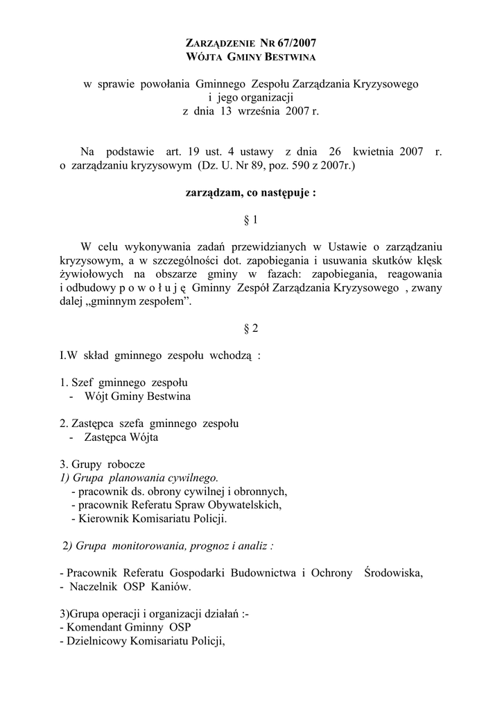 ZARZĄDZENIE NR 67/2007 WÓJTA GMINY BESTWINA w sprawie powołania Gminnego Zespołu Zarządzania Kryzysowego i jego organizacji z dnia 13 września 2007 r. Na podstawie art. 19 ust. 4 ustawy z dnia 26 kwietnia 2007 o zarządzaniu kryzysowym (Dz. U. Nr 89, poz. 590 z 2007r.) r. zarządzam, co następuje : §1 W celu wykonywania zadań przewidzianych w Ustawie o zarządzaniu kryzysowym, a w szczególności dot. zapobiegania i usuwania skutków klęsk żywiołowych na obszarze gminy w fazach: zapobiegania, reagowania i odbudowy p o w o ł u j ę Gminny Zespół Zarządzania Kryzysowego , zwany dalej „gminnym zespołem”. §2 I.W skład gminnego zespołu wchodzą : 1. Szef gminnego zespołu - Wójt Gminy Bestwina 2. Zastępca szefa gminnego zespołu - Zastępca Wójta 3. Grupy robocze 1) Grupa planowania cywilnego. - pracownik ds. obrony cywilnej i obronnych, - pracownik Referatu Spraw Obywatelskich, - Kierownik Komisariatu Policji. 2) Grupa monitorowania, prognoz i analiz : - Pracownik Referatu Gospodarki Budownictwa i Ochrony Środowiska, - Naczelnik OSP Kaniów. 3)Grupa operacji i organizacji działań :- Komendant Gminny OSP - Dzielnicowy Komisariatu Policji, - Pracownik Referatu Służb Technicznych 4)Grupa zabezpieczenia logistycznego : - Kierownik Referatu Gospodarki Budownictwa i Ochrony Środowiska - Kierownik Referatu Służb Technicznych, - Pracownik Referatu Spraw Obywatelskich. 5)Grupa opieki zdrowotnej i pomocy socjalno-bytowej - Kierownik SP ZOZ Bestwina, - Kierownik Gminnego Ośrodka Pomocy Społecznej. II. Wykaz imienny osób funkcyjnych gminnego zespołu określa Załącznik Nr 1 do zarządzenia . III. Wójt Gminy w zależności od uzasadnionych potrzeb, do składu wyżej wymienionych grup może powołać specjalistów, ekspertów, osoby zaufania społecznego, a także przedstawicieli organów administracji publicznej lub społecznych organizacji ratowniczych. §3 Siedzibą Gminnego Zespołu Zarządzania Kryzysowego jest Urząd Gminy w Bestwinie ul. Krakowska 111. §4 Zasady funkcjonowania i działania gminnego zespołu określa regulamin prac gminnego zespołu oraz działań w sytuacjach zagrożeń katastrofą naturalną lub awarią techniczną noszącą znamiona klęski żywiołowej, stanowiący załącznik nr 2 do zarządzenia. §5 1. Pracami gminnego zespołu kieruje jego szef. 2. Do zadań szefa gminnego zespołu należy : a) przygotowanie rocznego planu pracy zespołu ; b) opracowanie regulaminu bieżących prac zespołu oraz działań w sytuacjach zagrożenia katastrofą naturalną lub awarią techniczną noszącą znamiona klęski żywiołowej; c) ustalenie przedmiotu i terminu posiedzeń; d) zawiadomienie o terminie posiedzeń; e) przewodniczenie posiedzeniom ; f) zapraszanie na posiedzenie osób nie będących członkami zespołu; g) inicjowanie i organizowanie prac zespołu. §6 Obsługę kancelaryjno -biurową Gminnego Zespołu Reagowania zapewni pracownik ds. OC. §7 Traci moc Zarządzenie Nr 1 Wójta Gminy Bestwina z dnia 21 lutego 2003 r. w sprawie powołania Gminnego Zespołu Reagowania. § 8 Zarządzenie wchodzi w życie z dniem podpisania. Załącznik Nr 1 do Zarządzenia Nr 67/2007 Wójta Gminy Bestwina w sprawie powołania Gminnego Zespołu Zarządzania Kryzysowego z dnia 13 września 2007 r. Wykaz imienny osób funkcyjnych Gminnego Zespołu Reagowania I. Szef gminnego zespołu Wójta Gminy II. - Stefan Wodniak - Artur Beniowski Zastępca szefa gminnego zespołu - Zastępca Wójta III. Grupy robocze 1. Grupa planowania cywilnego: - Inspektor ds. OC - Halina Grygierzec - Kierownik Referatu Spraw Obywatelskich - Urszula Smalcerz - Kierownik Komisariatu Policji - Krzysztof Przybyła 2. Grupa monitorowania, prognoz i analiz : - Inspektor Referatu Gospodarki Budownictwa i Ochrony Środowiska - Adam Wróbel - Naczelnik OSP Kaniów - Andrzej Satława 3.Grupa operacji i organizacji działań : - Komendant Gminny OSP - Dzielnicowy Komisariatu Policji - Grzegorz - Marek Owczarz Biernot 2. Grupa zabezpieczenia logistycznego : - Kierownik Referatu Gospodarki Budownictwa i Ochrony Środowiska - Alicja Grygierzec - Kierownik Referatu Służb Technicznych - Bożena Stankiewicz - Pracownik Referatu Spraw Obywatelskich - Bożena Jaromin 3. Grupa opieki zdrowotnej i pomocy socjalno-bytowej - Kierownik SP ZOZ - Kierownik Gminnego Ośrodka Pomocy Społecznej - Bożena - Beata Kaźmierczak Szypka Załącznik nr 2 do zarządzenia nr 67/2007 Wójta Gminy Bestwina w sprawie powołania Gminnego Zespołu Zarządzania Kryzysowego z dnia 13 września 2007 r. REGULAMIN BIEŻĄCYCH PRAC GMINNEGO ZESPOŁU ZARZĄDZANIA KRYZYSOWEGO ORAZ DZIAŁAŃ W SYTUACJACH ZAGROŻEŃ KATASTROFĄ NATURALNĄ LUB AWARIĄ TECHNICZNĄ NOSZĄCĄ ZNAMIONA KLĘSKI ŻYWIOŁOWEJ Stosownie do zarządzenia nr 1/2007 Wójta Gminy Bestwina w sprawie powołania Gminnego Zespołu Zarządzania Kryzysowego z dnia 12 września 2007 r. zwanego dalej zarządzeniem , postanawiam, co następuje : §1 Gminny Zespół Zarządzania Kryzysowego realizuje następujące zadania określone w § 3 zarządzenia , a w szczególności : 1. W sprawie zapobiegania gminny zespół podejmuje działania, które redukują lub eliminują prawdopodobieństwo wystąpienia klęski żywiołowej albo w znacznym stopniu ograniczają jej skutki. 2. W fazie przygotowania gminny zespół podejmuje działania planistyczne dotyczące sposobów reagowania na czas wystąpienia klęski żywiołowej, a także działania mające na celu powiększenie zasobów sił i środków niezbędnych do efektywnego reagowania . 3. W fazie reagowania gminny zespół podejmuje działania polegające na dostarczaniu pomocy poszkodowanym, zahamowaniu rozwoju występujących zagrożeń oraz ograniczenia strat i zniszczeń. 4. W fazie odbudowy zespół podejmuje działania mające na celu przywrócenie zdolności reagowania, odbudowę zapasów służb ratowniczych oraz odtwarzania kluczowej dla funkcjonowania państwa infrastruktury telekomunikacyjnej, energetycznej, pa