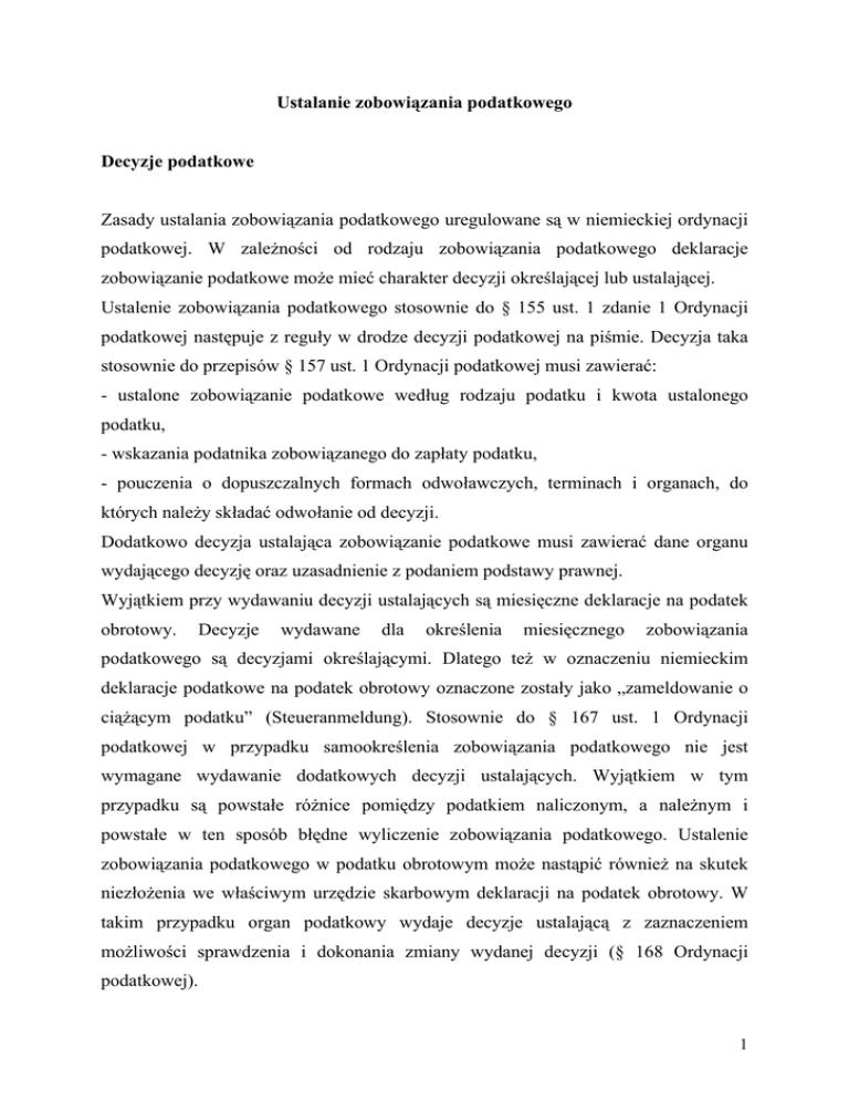 Ustalanie zobowiązania podatkowego Decyzje podatkowe Zasady ustalania zobowiązania podatkowego uregulowane są w niemieckiej ordynacji podatkowej. W zależności od rodzaju zobowiązania podatkowego deklaracje zobowiązanie podatkowe może mieć charakter decyzji określającej lub ustalającej. Ustalenie zobowiązania podatkowego stosownie do § 155 ust. 1 zdanie 1 Ordynacji podatkowej następuje z reguły w drodze decyzji podatkowej na piśmie. Decyzja taka stosownie do przepisów § 157 ust. 1 Ordynacji podatkowej musi zawierać: - ustalone zobowiązanie podatkowe według rodzaju podatku i kwota ustalonego podatku, - wskazania podatnika zobowiązanego do zapłaty podatku, - pouczenia o dopuszczalnych formach odwoławczych, terminach i organach, do których należy składać odwołanie od decyzji. Dodatkowo decyzja ustalająca zobowiązanie podatkowe musi zawierać dane organu wydającego decyzję oraz uzasadnienie z podaniem podstawy prawnej. Wyjątkiem przy wydawaniu decyzji ustalających są miesięczne deklaracje na podatek obrotowy. Decyzje wydawane dla określenia miesięcznego zobowiązania podatkowego są decyzjami określającymi. Dlatego też w oznaczeniu niemieckim deklaracje podatkowe na podatek obrotowy oznaczone zostały jako „zameldowanie o ciążącym podatku” (Steueranmeldung). Stosownie do § 167 ust. 1 Ordynacji podatkowej w przypadku samookreślenia zobowiązania podatkowego nie jest wymagane wydawanie dodatkowych decyzji ustalających. Wyjątkiem w tym przypadku są powstałe różnice pomiędzy podatkiem naliczonym, a należnym i powstałe w ten sposób błędne wyliczenie zobowiązania podatkowego. Ustalenie zobowiązania podatkowego w podatku obrotowym może nastąpić również na skutek niezłożenia we właściwym urzędzie skarbowym deklaracji na podatek obrotowy. W takim przypadku organ podatkowy wydaje decyzje ustalającą z zaznaczeniem możliwości sprawdzenia i dokonania zmiany wydanej decyzji (§ 168 Ordynacji podatkowej). 1 W zależności od okresu rozliczeniowego wydanej decyzji ustalającej decyzje te niemiecka ordynacja podatkowa dzieli na: - ustalenia przejściowe § 165, - ustalenia ostateczne § 168, Decyzje ustalające przejściowe wydawane są w trakcie roku podatkowego lub na początku roku podatkowego (podatek od wynagrodzenia) i mogą w trakcie roku podatkowego ulec zmianie. Ustalenia te dokonywane są na podstawie okresowych miesięcznych raportów. Ustalenie przejściowe zobowiązania podatkowego następuje również, gdy: - nie ma dokładnej pewności wejścia w życie umów o unikaniu podwójnego opodatkowania z innymi państwami, które będą korzystniej wpływały na zobowiązanie podatkowe podatnika, - Niemiecki Trybunał Konstytucyjny stwierdzi niezgodność ustawy podatkowej z ustawą zasadniczą, a ustawodawca zobowiązany został do dokonania nowelizacji ustawy podatkowej zgodnej z Konstytucją, - uzgodnienia ustaw podatkowych prawa wyższego są przedmiotem postępowania przed Europejskim Sądem Wspólnotowym, Trybunałem Konstytucyjnym lub Najwyższym Sądem Federalnym. W decyzjach tych podawany jest zakres i powód wydania decyzji przejściowej. Tak długo jak ustalenie zobowiązania podatkowego następuje w drodze decyzji przejściowej, może zostać ona unieważniona lub zmieniona Decyzje ustalające ostateczne wydawane są przy ustalaniu zobowiązania podatkowego ostatecznego, w którym podany zostaje ostateczny termin uiszczenia podatku. Korekty decyzji podatkowych Stosownie do postanowień § 129 i 169 ust. 1 ordynacji podatkowej organ podatkowy uprawniony jest do skorygowania pomyłek językowych, obliczeniowych i innych podobnych nieprawidłowości wydanej decyzji ustalającej, które pojawiły się przy wystawianiu decyzji podatkowej, przed upływem ustalonego terminu zapłaty 2 zobowiązania podatkowego. Korekty, jak i poprawki, w wydanej decyzji podatkowej mogą nastąpić w przypadku błędu popełnionego przez organ podatkowy. W przypadku błędu popełnionego przez podatnika korekty decyzji podatkowych mogą zostać dokonane w postępowaniu odwoławczym. Jeżeli na podstawie złożonej deklaracji podatkowej, w której widoczny był błąd podatnika, organ podatkowy wydał decyzję ustalającą zobowiązanie podatkowe, decyzja taka została wydana wadliwie z winy leżącej po stronie organu podatkowego. W takim przypadku organ podatkowy zobowiązany był skorygowania błędu podatnika. Korekty wydanych decyzji podatkowych ostatecznych mogą zostać wydane przed upływem terminu ich przedawnienia. Terminy ustalenia zobowiązania podatkowego wynoszą: 1. dla ceł i akcyzy - 1 rok 2. dla pozostałych podatków - 4 lata 3. w przypadku drobnych błędów powodujących zmniejszenie obciążenia podatkowego – 5 lat 4. w przypadkach zaliczanych do przestępstw podatkowych – 10 lat W trakcie obowiązujących terminów do skorygowania decyzji podatkowych ostatecznych mogą zostać one zmienione stosownie do § 172 ordynacji podatkowej na wniosek lub za zgodą podatnika w przypadku, gdy: - przed upływem terminu do wniesienia odwołania na korzyść lub niekorzyść podatnika, - po upływie terminu do wniesienia odwołania przez podatnika korekty decyzji mogą być dokonane tylko i wyłącznie na korzyść podatnika. Decyzje podatkowe ustalające mogą zostać uchylone lub zmienione, jeżeli zachodzą okoliczności określone w § 173 ordynacji podatkowej, czyli po wydaniu decyzji ustalającej pojawiły się nowe fakty i dowody mające wpływ na wysokość zobowiązania podatkowego, które doprowadziły do zaniżenia podatku, a podatnik ujawniając nowe okoliczności nie ponosi kary, lub zawyżenia obciążenia 3 podatkowego. Jako duże przewinienie podatnika organa podatkowe wskazują: błędne prowadzenie ksiąg rachunkowych, nieprzestrzeganie lub błędne interpretowanie wydanych przez organa podatkowe okólników zawierających informację o stosowaniu prawa podatkowego, nie stosowanie się do wskazówek i pole