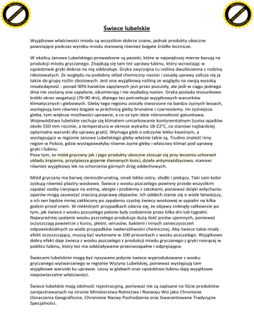 F -X C h a n ge F -X C h a n ge c u -tr a c k N y bu to k lic wiece lubelskie Wyj tkowe w ciwo ci miodu s wszystkim dobrze znane, jednak produkty uboczne powstaj ce podczas wyrobu miodu stanowi równie bogate ród o lecznicze. W okolicy Janowa Lubelskiego prowadzone s pasieki, które w najwi kszej mierze bazuj na produkcji miodu gryczanego. Znajduj si tam te uprawy ubinu, który wzrastaj c w siedztwie gryki dobrze na ni oddzia uje. Gryka zwyczajna tu ro lina dwuli cienna z rodziny rdestowatych. Ze wzgl du na podobny sk ad chemiczny nasion i zasad uprawy zalicza si ja tak e do grupy ro lin zbo owych. Jest ona wyj tkow ro lin ze wzgl du na swoj wysok miododajno - ponad 90% kwiatów zapylanych jest przez pszczo y, ale je li w ci gu jednego dnia nie zostan one zapylone, obumieraj i nie wydadz nasion. Gryka posiada stosunkowo krótki okres wegetacji (70-90 dni), dlatego tez potrzebuje wyj tkowych warunków klimatycznych i glebowych. Gleby tego regionu zosta y stworzone na bardzo yznych lessach, wyst puj tam równie bogate w próchnic gleby brunatne i czarnoziemy. Im niejsza gleba, tym wi ksze mo liwo ci uprawne, a co za tym idzie ró norodno gatunkowa. Województwo lubelskie cechuje si klimatem umiarkowanie kontynentalnym (suma opadów oko o 550 mm rocznie, a temperatura w okresie wykwitu 18-22°C, co stanowi najbardziej optymalne warunki dla uprawy gryki). Wymaga gleb o odczynie lekko kwa nym, a wyst puj ce w regionie Janowa Lubelskiego gleby w nie takie s . Trudno znale inny region w Polsce, gdzie wyst powa yby równie yzne gleby i w ciwy klimat pod upraw gryki i ubinu. Poza tym, e miód gryczany jak i jego produkty uboczne stosuje si przy leczeniu schorze uk adu kr enia, przy piesza gojenie z amanych ko ci, dzia a antymia ycowo, stanowi równie wyj tkowy lek na schorzenia górnych dróg oddechowych. Miód gryczany ma barw ciemnobrunatn , smak lekko ostry, s odki i piek cy. Taki sam kolor zyskuj równie plastry woskowe. wiece z wosku pszczelego powinny przede wszystkim zapala osoby cierpi ce na astm , alergie i problemy z zatokami, poniewa dzi ki wdychaniu oparów mog zauwa znaczn popraw objawów. Ich oddech stanie si o wiele atwiejszy, a ich sen b dzie mniej zak ócony po zapaleniu czystej wiecy woskowej w sypialni na kilka godzin przed snem. W niektórych przypadkach zdarza si , e objawy znikn y ca kowicie po tym, jak wiece z wosku pszczelego palone by y codziennie przez kilka dni lub tygodni. Najwyra niej spalanie wosku pszczelego produkuje du ilo jonów ujemnych, poniewa oczyszczaj powietrze z kurzu, ple ni, wirusów, bakterii i innych zanieczyszcze odpowiedzialnych za wiele przypadków nadwra liwo ci chemicznej. Aby wiece takie mia y efekt oczyszczaj cy, musz by wykonane w 100 procentach z wosku pszczelego. Wyj tkowo dobry efekt daje wieca z wosku pszczelego z produkcji miodu gryczanego z gryki rosn cej w pobli u ubinu, który te ma oddzia ywanie przeciwzapalne i odpr aj ce. wiecami lubelskimi mog by nazywane jedynie wiece wyprodukowane z wosku gryczanego wytwarzanego w regionie Wy yny Lubelskiej, poniewa wyst puj tam wyj tkowe warunki ku uprawie. Lessy w glebach oraz s siedztwo ubinu daj wyj tkowe niepowtarzalne w ciwo ci. wiece lubelskie maj zdolno rejestracyjn , poniewa nie s zapisane na li cie produktów zarejestrowanych na stronie Ministerstwa Rolnictwa i Rozwoju Wsi jako Chronione Oznaczenia Geograficzne, Chronione Nazwy Pochodzenia oraz Gwarantowane Tradycyjne Specjalno ci. .d o o .c m C m w o .d o w w w w w C lic k to bu y N O W ! PD O W ! PD c u -tr a c k .c