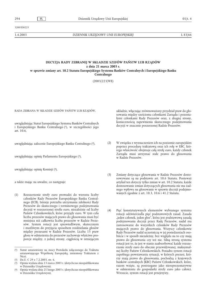 294 PL Dziennik Urzędowy Unii Europejskiej 01/t. 4 DZIENNIK URZĘDOWY UNII EUROPEJSKIEJ L 83/66 32003D0223 1.4.2003 DECYZJA RADY ZEBRANEJ W SKŁADZIE SZEFÓW PAŃSTW LUB RZĄDÓW z dnia 21 marca 2003 r. w sprawie zmiany art. 10.2 Statutu Europejskiego Systemu Banków Centralnych i Europejskiego Banku Centralnego (2003/223/WE) układzie, włączając zrównoważony przydział praw do głosowania między sześcioma członkami Zarządu i pozostałymi członkami Rady Prezesów oraz, z drugiej strony, koniecznością zapewnienia skutecznego podejmowania decyzji w znacznie poszerzonej Radzie Prezesów. RADA ZEBRANA W SKŁADZIE SZEFÓW PAŃSTW LUB RZĄDÓW, uwzględniając Statut Europejskiego Systemu Banków Centralnych i Europejskiego Banku Centralnego (1), w szczególności jego art. 10.6, uwzględniając zalecenie Europejskiego Banku Centralnego (2), (2) W związku z wyznaczeniem ich na poziomie europejskim poprzez procedurę traktatową oraz ich rolę w EBC, którego właściwość obejmuje całą strefę euro, każdy członek Zarządu musi utrzymać stałe prawo do głosowania w Radzie Prezesów. (3) Zmiany dotyczące głosowania w Radzie Prezesów dostosowywane są na podstawie art. 10.6 Statutu. Ponieważ artykuł ten dotyczy tylko zmian w art. 10.2 Statutu, każde dostosowanie zmian dotyczących głosowania nie ma żadnego wpływu na głosowanie w sprawie decyzji podejmowanych zgodnie z art. 10.3, 10.6 i 41.2 Statutu. (4) Pięć konstytutywnych elementów wybranego systemu rotacji odzwierciedla pięć podstawowych zasad. Zasada „jeden członek, jeden głos”, która jest podstawową zasadą podejmowania decyzji przez Radę Prezesów, nadal ma zastosowanie do wszystkich członków Rady Prezesów mających prawo do głosowania. Wszyscy członkowie Rady Prezesów nadal uczestniczą w jej posiedzeniach osobiście i w sposób niezależny, bez względu na to czy mają prawo do głosowania czy też nie. Silną stroną systemu rotacji jest to, że jest w stanie zaabsorbować każde rozszerzenie strefy euro do obecnie przewidywanej, maksymalnej liczby Państw Członkowskich. Ponadto system rotacji zapobiega powstawaniu sytuacji, w których prezesi, którzy mają prawo do głosowania, pochodzą z krajowych banków centralnych (KBC) Państw Członkowskich, które, razem wzięte, są postrzegane jako niereprezentatywne w odniesieniu do gospodarki strefy euro jako całości. Wreszcie, system rotacji jest przejrzysty. uwzględniając opinię Parlamentu Europejskiego (3), uwzględniając opinię Komisji (4), a także mając na uwadze, co następuje: (1) Rozszerzenie strefy euro prowadzi do wzrostu liczby członków Rady Prezesów Europejskiego Banku Centralnego (ECB). Istnieje potrzeba utrzymania zdolności Rady Prezesów do skutecznego i terminowego podejmowania decyzji w rozszerzonej strefie euro, niezależnie od liczby Państw Członkowskich, które przyjęły euro. W tym celu liczba prezesów mających prawo do głosowania musi być mniejsza niż całkowita liczba prezesów w Radzie Prezesów. System rotacji jest sprawiedliwym, skutecznym i możliwym do przyjęcia sposobem rozdzielania głosów między prezesami w Radzie Prezesów. Liczba 15 praw głosu w odniesieniu do prezesów zachowuje właściwe proporcje między, z jednej strony, ciągłością w istniejącym (1) Statut ustanowiony na mocy Protokołu załączonego do Traktatu ustanawiającego Wspólnotę Europejską, zmieniony Traktatem z Nicei. (2) Dz.U. C 29 z 7.2.2003, str. 6. (3) Opinia wydana dnia 13 marca 2003 r. (dotychczas nieopublikowana w Dzienniku Urzędowym). (4) Opinia wydana dnia 21 lutego 2003 r. (dotychczas nieopublikowana w Dzienniku Urzędowym). 01/t. 4 (5) PL Dziennik Urzędowy Unii Europejskiej Przydzielenie prezesów do grup i przyznanie określonej liczby praw do głosowania tym grupom zostało zaplanowane w celu zapewnienia, aby prezesi, którzy mają prawo do głosowania, pochodzący z KBC Państw Członkowskich, razem wzięci, stanowili reprezentację gospodarki strefy euro jako całości. Prezesi wykonują swoje prawo do głosowania z różną częstotliwością, w zależności od odpowiedniej wielkości gospodarki Państwa Członkowskiego danego KBC, w ramach strefy euro. Przydzielenie prezesów do grup jest więc uzależnione od uszeregowania Państw Członkowskich danego KBC, na podstawie wskaźników złożonych z dwóch części składowych: wielkości udziału Państwa Członkowskiego danego KBC i) w całkowitym produkcie krajowym brutto w cenach rynkowych (zwanego dalej „PKB cr”) Państw Członkowskich, które przyjęły euro; oraz ii) w łącznym zagregowanym bilansie pieniężnym instytucji finansowych Państw Członkowskich, które przyjęły euro. Gospodarcza waga głosu Państwa Członkowskiego odzwierciedlona w jego PKB cr, jest właściwym składnikiem, jako że wpływ decyzji banku centralnego jest większy w Państwach Członkowskich mających bardziej rozwinięte gospodarki niż w tych, których gospodarki są mniej rozwinięte. Jednocześnie wielkość sektora finansowego Państwa Członkowskiego również ma szczególne znaczenie dla decyzji banku centralnego, ponieważ kontrahenci działań banków centralnych należą do tego sektora. 5/6 wagi przyznane jest PKB cr, a 1/6 łącznemu zagregowanemu bilansowi pieniężnemu instytucji finansowych. Ten wybór wag jest odpowiedni, jako że oznacza to, że sektor finansowy jest wystarczająco i znacząco reprezentowany. 295 każdym przypadku gdy całkowity PKB cr zostanie dostosowany zgodnie z art. 29.3 Statutu lub w każdym przypadku gdy zwiększy się liczba prezesów w Radzie Prezesów. Nowe udziały wynikające z regularnych dostosowań stosują się od pierwszego dnia następnego roku. W odniesieniu do jednego lub więcej prezesów stających się członkami Rady Prezesów, okresy odniesienia, które mają być stosowane do obliczenia udziałów odpowiednich Państw Członkowskich danych KBC, w łącznym PKB cr i w łącznym zagregowanym 