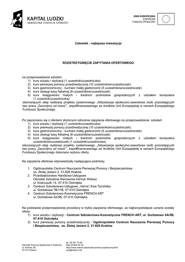 Człowiek - najlepsza inwestycja ROZSTRZYGNIĘCIE ZAPYTANIA OFERTOWEGO na przeprowadzenie szkoleń: 1) kurs wizażu i stylizacji (1 uczestnik/uczestniczka) 2) kurs pierwszej pomocy przedmedycznej (10 uczestników/uczestniczek) 3) kurs gastronomiczny - kucharz małej gastronomii (5 uczestników/uczestniczek) 4) kurs obsługi kasy fiskalnej (8 uczestników/uczestniczek) 5) kurs księgowości małych i średnich podmiotów gospodarczych z udziałem komputera (1 uczestnik/uczestniczka) stanowiących etap realizacji projektu systemowego „Aktywizacja społeczno-zawodowa osób pozostających bez pracy „Zacznijmy od nowa””, współfinansowanego ze środków Unii Europejskiej w ramach Europejskiego Funduszu Społecznego. Po zapoznaniu się z ofertami złożonymi odnośnie zapytania ofertowego na przeprowadzenie szkoleń: 1) kurs wizażu i stylizacji (1 uczestnik/uczestniczka) 2) kurs pierwszej pomocy przedmedycznej (10 uczestników/uczestniczek) 3) kurs gastronomiczny - kucharz małej gastronomii (5 uczestników/uczestniczek) 4) kurs obsługi kasy fiskalnej (8 uczestników/uczestniczek) 5) kurs księgowości małych i średnich podmiotów gospodarczych z udziałem komputera uczestników/uczestniczek (1 uczestnik/uczestniczka) stanowiących etap realizacji projektu systemowego „Aktywizacja społeczno-zawodowa osób pozostających bez pracy „Zacznijmy od nowa””, współfinansowanego ze środków Unii Europejskiej w ramach Europejskiego Funduszu Społecznego dokonano wyboru oferty. Na zapytania ofertowe odpowiedziały następujące podmioty: 1. Ogólnopolskie Centrum Nauczania Pierwszej Pomocy i Bezpieczeństwa os. Złotej Jesieni 2, 31-826 Kraków 2. Przedsiębiorstwo Handlowo-Usługowe Ośrodek Szkolenia Kierowców Henryk Wołosz ul. Kościuszki 14, 07-410 Ostrołęka 3. Centrum Szkoleniowo-Usługowo „Vernis” Ewa Tymińska ul. Gorbatowa 7B/11B, 07-410 Ostrołęka 4. Centrum Szkoleniowo-Kosmetyczne FRENCH ART ul. Gorbatowa 5A/5B, 07-410 Ostrołęka Na podstawie przeprowadzonej procedury w trybie zapytania ofertowego, za najkorzystniejsze uznane zostały oferty: 1) kurs wizażu i stylizacji - Centrum Szkoleniowo-Kosmetyczne FRENCH ART, ul. Gorbatowa 5A/5B, 07-410 Ostrołęka 2) kurs pierwszej pomocy przedmedycznej - Ogólnopolskie Centrum Nauczania Pierwszej Pomocy i Bezpieczeństwa, os. Złotej Jesieni 2, 31-826 Kraków Ośrodek Pomocy Społecznej w Rzekuniu ul. Kolonia 1B 07-411 Rzekuń tel. 29 761 73 95 faks 29 643 24 22 http://www.rzekun.pl/osrodek-pomocy-spolecznej.html [email protected] 3) kurs gastronomiczny - kucharz małej gastronomii - Przedsiębiorstwo Handlowo-Usługowe Ośrodek Szkolenia Kierowców Henryk Wołosz, ul. Kościuszki 14, 07-410 Ostrołęka 4) kurs obsługi kasy fiskalnej - Przedsiębiorstwo Handlowo-Usługowe Ośrodek Szkolenia Kierowców Henryk Wołosz, ul. Kościuszki 14, 07-410 Ostrołęka 5) kurs księgowości małych i średnich podmiotów gospodarczych z udziałem komputera Przedsiębiorstwo Handlowo-Usługowe Ośrodek Szkolenia Kierowców Henryk Wołosz, ul. Kościuszki 14, 07-410 Ostrołęka Firma przedstawiły najkorzystniejsze oferty tj.: 1. kurs wizażu i stylizacji – 1500,00 zł (brutto) 2. kurs pierwszej pomocy przedmedycznej – 890,00 zł (brutto) 3. kurs gastronomiczny - kucharz małej gastronomii – 8500,00 zł (brutto) 4. kurs obsługi kasy fiskalnej – 2960,00 zł (brutto) 5. kurs księgowości małych i średnich podmiotów gospodarczych z udziałem komputera – 1250,00 zł (brutto) i spełniły wszystkie wymagania stawiane przez Zamawiającego. Danuta Orzołek Rzekuń, dn. 15.07.2011 r. Kierownik Ośrodka Pomocy Społecznej w Rzekuniu Projekt współfinansowany ze środków Unii Europejskiej w ramach Europejskiego Funduszu Społecznego Ośrodek Pomocy Społecznej w Rzekuniu ul. Kolonia 1B 07-411 Rzekuń tel. 29 761 73 95 faks 29 643 24 22 http://www.rzekun.pl/osrodek-pomocy-spolecznej.html [email protected]