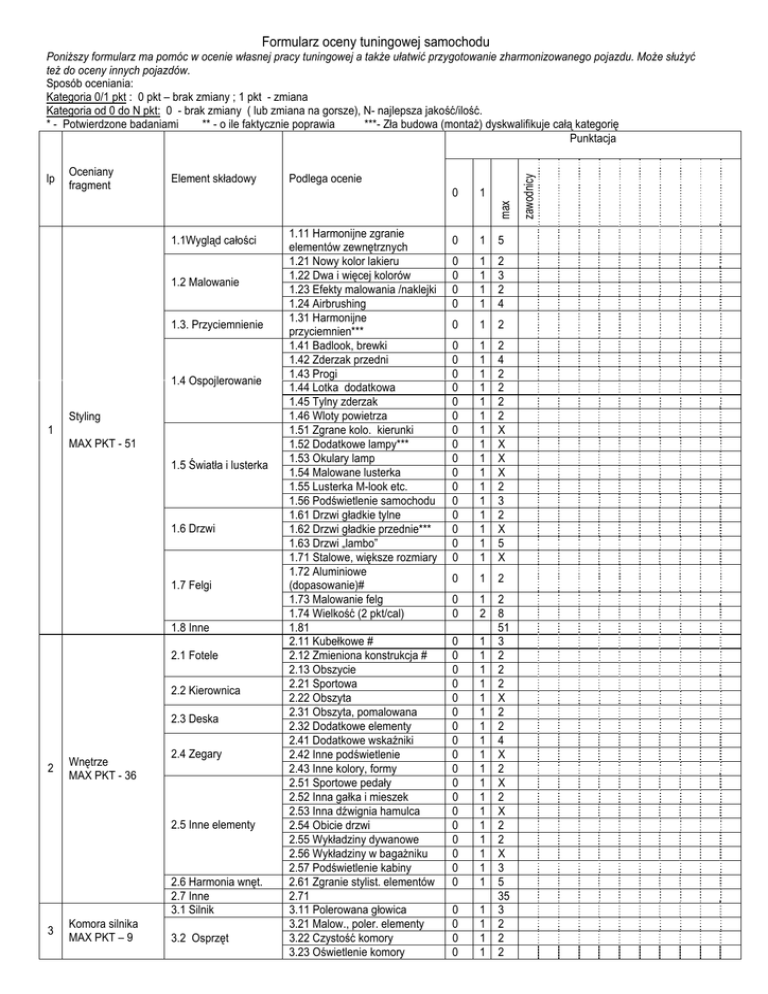 Formularz oceny tuningowej samochodu Oceniany fragment Element składowy Podlega ocenie 0 1 0 1 5 0 0 0 0 1 1 1 1 0 1 2 0 0 0 0 0 0 0 0 0 0 0 0 0 0 0 0 1 1 1 1 1 1 1 1 1 1 1 1 1 1 1 1 0 1 2 0 0 1 2 2 8 51 1 3 1 2 1 2 1 2 1 X 1 2 1 2 1 4 1 X 1 2 1 X 1 2 1 X 1 2 1 2 1 X 1 3 1 5 35 1 3 1 2 1 2 1 2 max lp 1.1Wygląd całości 1.2 Malowanie 1.3. Przyciemnienie 1.4 Ospojlerowanie 1 Styling MAX PKT - 51 1.5 Światła i lusterka 1.6 Drzwi 1.7 Felgi 1.8 Inne 2.1 Fotele 2.2 Kierownica 2.3 Deska 2 Wnętrze MAX PKT - 36 2.4 Zegary 2.5 Inne elementy 2.6 Harmonia wnęt. 2.7 Inne 3.1 Silnik 3 Komora silnika MAX PKT – 9 3.2 Osprzęt 1.11 Harmonijne zgranie elementów zewnętrznych 1.21 Nowy kolor lakieru 1.22 Dwa i więcej kolorów 1.23 Efekty malowania /naklejki 1.24 Airbrushing 1.31 Harmonijne przyciemnien*** 1.41 Badlook, brewki 1.42 Zderzak przedni 1.43 Progi 1.44 Lotka dodatkowa 1.45 Tylny zderzak 1.46 Wloty powietrza 1.51 Zgrane kolo. kierunki 1.52 Dodatkowe lampy*** 1.53 Okulary lamp 1.54 Malowane lusterka 1.55 Lusterka M-look etc. 1.56 Podświetlenie samochodu 1.61 Drzwi gładkie tylne 1.62 Drzwi gładkie przednie*** 1.63 Drzwi „lambo” 1.71 Stalowe, większe rozmiary 1.72 Aluminiowe (dopasowanie)# 1.73 Malowanie felg 1.74 Wielkość (2 pkt/cal) 1.81 2.11 Kubełkowe # 2.12 Zmieniona konstrukcja # 2.13 Obszycie 2.21 Sportowa 2.22 Obszyta 2.31 Obszyta, pomalowana 2.32 Dodatkowe elementy 2.41 Dodatkowe wskaźniki 2.42 Inne podświetlenie 2.43 Inne kolory, formy 2.51 Sportowe pedały 2.52 Inna gałka i mieszek 2.53 Inna dźwignia hamulca 2.54 Obicie drzwi 2.55 Wykładziny dywanowe 2.56 Wykładziny w bagażniku 2.57 Podświetlenie kabiny 2.61 Zgranie stylist. elementów 2.71 3.11 Polerowana głowica 3.21 Malow., poler. elementy 3.22 Czystość komory 3.23 Oświetlenie komory 0 0 0 0 0 0 0 0 0 0 0 0 0 0 0 0 0 0 0 0 0 0 2 3 2 4 2 4 2 2 2 2 X X X X 2 3 2 X 5 X zawodnicy Poniższy formularz ma pomóc w ocenie własnej pracy tuningowej a także ułatwić przygotowanie zharmonizowanego pojazdu. Może służyć też do oceny innych pojazdów. Sposób oceniania: Kategoria 0/1 pkt : 0 pkt – brak zmiany ; 1 pkt - zmiana Kategoria od 0 do N pkt: 0 - brak zmiany ( lub zmiana na gorsze), N- najlepsza jakość/ilość. * - Potwierdzone badaniami ** - o ile faktycznie poprawia ***- Zła budowa (montaż) dyskwalifikuje całą kategorię Punktacja 4 4.1 Oznaczenia klubu Przygotowanie samochodu MAX PKT - 4.2 Czystość 4.3 Inne 4.11 Oznaczenia zewnętrzne 4.12 Oznaczenia wewnętrzne 4.21 Czystość zewnętrzna 4.22 Czystość wewnętrzna 4.31 0 0 0 0 1 1 1 1 9 2 X 2 2 7 RAZEM # Albo jeden albo drugi Zaleca się dodawanie punktów za użycie produktów tuningowych renomowanych firm ( np. Brembo, Ferodo, Sparco, Bosch, itd.) Należy wziąć pod uwagę oryginalność pomysłu ( np. zewnętrze i wnętrze) i niepowtarzalność, jakość wykonania oraz wkład własny. Przy ocenie samochodu i jego elementów szczególnie bierzemy pod uwagę harmonijne zgranie elementów, pasujące do charakteru i kolorystyki pojazdu. Autorem karty oceny jest Basenji (FUREL) KARTA OCENY SAMOCHODU - INNE MARKI 1 2 3 4 5 6 7 8 9 10 11 12 13 14 15 16 17 18 19 20 Samochód Spojlery Światła Drzwi Felgi Fotele Kierownica Deska Zegary Inne Harmonia Silnik Osprzęt Oznaczenia Czystość Przygot. Przyciemnianie Komora Malowanie Lp. Wnętrze – 35 pkt Całość Zewnętrze -51pkt Pkt max 5 11 2 13 9 8 3 5 3 4 5 12 5 3 6 3 4 RAZEM 101
