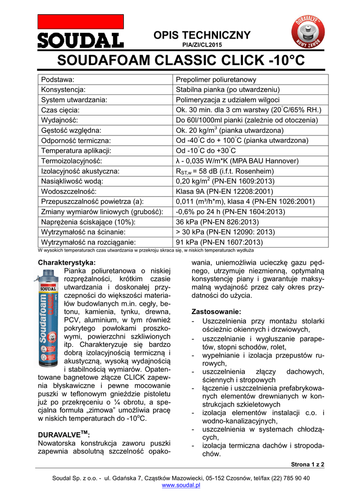 OPIS TECHNICZNY PIA/ZI/CL2015 SOUDAFOAM CLASSIC CLICK -10°C Podstawa: Konsystencja: System utwardzania: Czas cięcia: Wydajność: Gęstość względna: Odporność termiczna: Temperatura aplikacji: Termoizolacyjność: Izolacyjność akustyczna: Nasiąkliwość wodą: Wodoszczelność: Przepuszczalność powietrza (a): Zmiany wymiarów liniowych (grubość): Naprężenia ściskające (10%): Wytrzymałość na ścinanie: Wytrzymałość na rozciąganie: Prepolimer poliuretanowy Stabilna pianka (po utwardzeniu) Polimeryzacja z udziałem wilgoci Ok. 30 min. dla 3 cm warstwy (20°C/65% RH.) Do 60l/1000ml pianki (zależnie od otoczenia) Ok. 20 kg/m3 (pianka utwardzona) Od -40°C do + 100°C (pianka utwardzona) Od -10°C do +30°C λ - 0,035 W/m*K (MPA BAU Hannover) RST,w = 58 dB (i.f.t. Rosenheim) 0,20 kg/m2 (PN-EN 1609:2013) Klasa 9A (PN-EN 12208:2001) 0,011 (m³/h*m), klasa 4 (PN-EN 1026:2001) -0,6% po 24 h (PN-EN 1604:2013) 36 kPa (PN-EN 826:2013) > 30 kPa (PN-EN 12090: 2013) 91 kPa (PN-EN 1607:2013) W wysokich temperaturach czas utwardzania w przekroju skraca się, w niskich temperaturach wydłuża Charakterystyka: Pianka poliuretanowa o niskiej rozprężalności, krótkim czasie utwardzania i doskonałej przyczepności do większości materiałów budowlanych m.in. cegły, betonu, kamienia, tynku, drewna, PCV, aluminium, w tym również pokrytego powłokami proszkowymi, powierzchni szkliwionych itp. Charakteryzuje się bardzo dobrą izolacyjnością termiczną i akustyczną, wysoką wydajnością i stabilnością wymiarów. Opatentowane bagnetowe złącze CLICK zapewnia błyskawiczne i pewne mocowanie puszki w teflonowym gnieździe pistoletu już po przekręceniu o ¼ obrotu, a specjalna formuła „zimowa” umożliwia pracę w niskich temperaturach do -10oC. DURAVALVETM: Nowatorska konstrukcja zaworu puszki zapewnia absolutną szczelność opako- wania, uniemożliwia ucieczkę gazu pędnego, utrzymuje niezmienną, optymalną konsystencję piany i gwarantuje maksymalną wydajność przez cały okres przydatności do użycia. Zastosowanie: - Uszczelnienia przy montażu stolarki ościeżnic okiennych i drzwiowych, - uszczelnianie i wygłuszanie parapetów, stopni schodów, rolet, - wypełnianie i izolacja przepustów rurowych, - uszczelnienia złączy dachowych, ściennych i stropowych - łączenie i uszczelnienia prefabrykowanych elementów drewnianych w konstrukcjach szkieletowych - izolacja elementów instalacji c.o. i wodno-kanalizacyjnych, - uszczelnienia w systemach chłodzących, - izolacja termiczna dachów i stropodachów. Strona 1 z 2 Soudal Sp. z o.o. - ul. Gdańska 7, Cząstków Mazowiecki, 05-152 Czosnów, tel/fax (22) 785 90 40 www.soudal.pl OPIS TECHNICZNY PIA/ZI/CL/2015 Opakowanie: Puszki aerozolowe: 750ml, 12 sztuk w kartonie Przechowywanie: 24 miesiące w fabrycznym, zamkniętym opakowaniu, w chłodnym i suchym miejscu, w temperaturze od + 5°C do + 25°C. Normy i certyfikaty: Produkt wytwarzany przez firmę SOUDAL NV w Turnhout w Belgii, zgodnie z systemem ISO 9001. Posiada aprobatę techniczną ITB: AT-15-2815/2015. Sposób użycia: - podłoże musi być czyste, wolne od tłuszczu i luźnych zanieczyszczeń (kurz, stare szczeliwa itp.), - bezpośrednio przed nałożeniem pianki podłoże obficie zwilżyć wodą (tylko w temperaturach > 0°C), - puszka powinna mieć temperaturę pokojową, - bezpośrednio przed rozpoczęciem pracy energicznie wstrząsnąć puszką około 30 razy, - przekręcić puszkę w gnieździe pistoletu o ¼ obrotu do usłyszenia kliknięcia i wyregulować dyszę dozującą, - przestrzeń roboczą wypełniać od dołu powolnym, jednostajnym ruchem, zapełniając ją tylko częściowo i pozostawiając miejsce na rozprężającą się piankę, - warstwa pianki nie powinna być grubsza niż 3 cm przed utwardzeniem. Większe szczeliny wypełniać stopniowo warstwami, - następną warstwę nakładać dopiero po utwardzeniu poprzedniej i zwilżeniu jej wodą (tylko w temperaturach > 0°C), - po całkowitym utwardzeniu usunąć elementy usztywniające, obciąć ostrym nożem nadmiar pianki i zabezpieczyć przed działaniem promieni słonecznych. - świeże zabrudzenia i narzędzia czyścić płynem czyszczącym do pianki poliuretanowej Soudal lub ściereczkami SWIPEX, - utwardzoną piankę usuwać tylko mechanicznie lub przy pomocy preparatu PU REMOVER. Zalecenia: - Pozostawienie niezabezpieczonej utwardzonej pianki spowoduje utratę jej właściwości izolacyjnych. - Pistolet z prawidłowo zamocowaną puszką i zakręconą śrubą dozującą może być przechowywany nawet przez kilka tygodni bez ryzyka zablokowania zaworu. Ale przed każdą dłuższą przerwą w pracy zalecamy demontaż zestawu i dokładne czyszczenie pistoletu aplikacyjnego oraz gwintu i zaworu puszki. - Zawór DuravalveTM jest odporny na wpływ chemikaliów i niewrażliwy na przechowywanie i przewożenie w pozycji poziomej. Jednak ze względów bezpieczeństwa (opakowanie pod ciśnieniem) wszystkie opakowania zbiorcze zalecamy składować i transportować w pozycji pionowej. Zalecenia BHP: Przy użyciu pianki przestrzegać zwykłych zasad higieny pracy: - nie wdychać gazu/rozpylonej cieczy, - nosić odpowiednią odzież ochronną, odpowiednie rękawice ochronne i okulary lub ochronę twarzy, - stosować wyłącznie w dobrze wentylowanych pomieszczeniach, - w przypadku zatrucia drogą oddechową wyprowadzić lub wynieść poszkodowanego na świeże powietrze i zapewnić warunki do odpoczynku, - chronić przed dziećmi. Uwaga: Wskazówki zawarte w tym dokumencie są wynikami naszych doświadczeń i praktyki. Ze względu na różnorodność materiałów i podłoży oraz wielorakość możliwych zastosowań, które pozostają poza naszą kontrolą, nie możemy przyjmować jakiejkolwiek odpowiedzialności za otrzymane rezultaty. We wszystkich przypadkach zaleca się przeprowadzenie próby. Strona 2 z 2 Soudal Sp. z o.o. - ul. Gdańska 7, Cząstków Mazowiecki, 05-152 Czosnów, tel./fax (