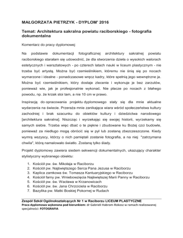 MAŁGORZATA PIETRZYK - DYPLOM' 2016 Temat: Architektura sakralna powiatu raciborskiego - fotografia dokumentalna Komentarz do pracy dyplomowej Na podstawie dokumentacji fotograficznej architektury sakralnej powiatu raciborskiego starałam się udowodnić, że dla stworzenia dzieła o wysokich walorach estetycznych i warsztatowych - po czterech latach nauki w liceum plastycznym - nie trzeba być artystą. Można być rzemieślnikiem, któremu nie śnią się po nocach wymarzone i idealne - ponadczasowe wręcz kadry, które spełnią jego wewnętrzne ja. Można być rzemieślnikiem, który dostaje zlecenie i wykonuje je bez zarzutów, ponieważ wie, jak je profesjonalnie wykonać. Nie płacze po nocach z błahego powodu, np. że krzak stoi tam, a nie 10 cm w prawo. Inspiracją do opracowania projektu dyplomowego stały się dla mnie aktualne wydarzenia na świecie. Przeraża mnie zanikająca wiara wśród społeczeństwa kultury zachodniej i brak szacunku do obiektów kultury i dziedzictwa narodowego [architektura sakralna]. Niszcząc i wyrzekając się swojej historii, wyrzekamy się samych siebie. Trzeba więc dbać o te piękne i zbudowane ku Bożej czci budowle, ponieważ za niedługo mogą obrócić się w pył lub zostaną zbezczeszczone. Kiedy wymrą wszyscy, którzy o nich pamiętali zostanie fotografia, a na niej "zatrzymana chwila", którą namalowało światło. Zostaną tylko ślady. Projekt dyplomowy zawiera siedem sekwencji dokumentalnych, ukazujący charakter stylistyczny wybranego obiektu: 1. 2. 3. 4. 5. 6. 7. Kościół pw. św. Mikołaja w Raciborzu Kościół pw. Najświętszego Serca Pana Jezusa w Raciborzu Kaplica zamkowa św. Tomasza Kantuaryjskiego w Raciborzu Kościół farny pw. Wniebowzięcia Najświętszej Marii Panny w Raciborzu Kościół pw. św. Wacława w Krzanowicach Kościół pw. św. Jana Chrzciciela w Raciborzu Bazylika pw. Matki Boskiej Pokornej w Rudach Zespół Szkół Ogólnokształcących Nr 1 w Raciborzu LICEUM PLASTYCZNE Praca dyplomowa wykonana pod kierunkiem: dr Gabrieli Habrom-Rokosz w ramach realizowanej specjalności: FOTOGRAFIA