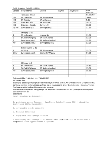 Or lik Skawina. Dnia 07.11.2014. Lp/poz Gospodarze Goście Wynik Zwycięzca Data Godz.zaw. 07.11.2014 I /1 I /2 II/1 II/2 III/ mf Chłopcy –U-12 SP Libertów SP Rzozów Zwyc.Poz 1/1 Skawina –Korab. Zwycięzca II/2 SP Wrząsowice SP Jaśkowice SP Rusocice Zwyc. 1/2 Zwycięzca II/1 9.00 9.30 10.00 10.30 11.30 1 2 3 mf Chłopcy U-10 SP Jaśkowice Sk.Zwirki/Wigury Zwycięzca poz 1 Zwycięzca poz.2 Liszczanka SP Skaw.Korab SP Radziszów Zad. Zwycięzca poz.3 11.00 12.00 12.30 13.30 1 2/mf Dziewczynki U-12 UKS Gaj Zwycięzca poz 1 SP Wrzasowice Sk.Zwirki/Wigury 13.00 14.00 1 2 mf Chłopcy U-8 SP Jaśkowice Sk.Zwirki/Wigury Zwycięzca poz 1 SP Skaw.Korab SP Radziszów Zad. Zwycięzca poz2 14.30 15.00 15.30 Opiekun Orlika P . Wróbel tel; 784n031 283 Mf – mały finał. Zwycięzcy poszczególnych grup oraz Dziewczyn 10 Wola Zachar, AP-SP Krzeszowice U-8 przechodzą do finału powiatu krakowskiego spotkają się ze zwycięzcami grupy Sieciechowice i Skawina. Termin finałowy powiatu krakowskiego zostanie podany. Z ramienia koordynatora okręgowego kol. Krzysztof Gacek tel504761931 ,koordynator Małopolski Stanisław Dańda tel 693741746 Nadal obowiązują dokumenty: 1. podpisana przez Trenera + Dyrektora Szkoły/Prezesa UKS + pieczątka instytucji LISTA Zawodników 2. oryginalne zgody rodziców 3. badania lekarskie 4. oryginale legitymacje szkolne - honorujemy DWA rodzaje list zawodników: Odręcznie ALE na formularzu z załącznika oraz wygenerowaną z systemu.