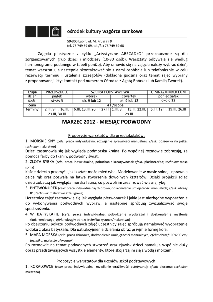 Zajęcia plastyczne z cyklu „Artystyczne ABECADŁO” przeznaczone są dla zorganizowanych grup dzieci i młodzieży (10‐30 osób). Warsztaty odbywają się według harmonogramu podanego w tabeli poniżej. Aby umówić się na zajęcia należy wybrać dzień, temat warsztatu, a następnie skontaktować się z nami osobiście lub telefonicznie w celu rezerwacji terminu i ustalenia szczegółów (dokładna godzina oraz temat zajęć wybrany z proponowanej listy; kontakt pod numerem Ośrodka z Agatą Bończak lub Kamilą Tworek). grupa dzień godz. cena terminy PRZEDSZKOLE piątek około 9 SZKOŁA PODSTAWOWA GIMNAZJUM/LICEUM wtorek czwartek poniedziałek około 12 ok. 9 lub 12 ok. 9 lub 12 4 zł/osoba 2.III, 9.III, 16.III, 6.III, 13.III, 20.III, 27.III 1.III, 8.III, 15.III, 22.III, 5.III, 12.III, 19.III, 26.III 23.III, 30.III 29.III MARZEC 2012 ‐ MIESIĄC PODWODNY Propozycje warsztatów dla przedszkolaków: 1. MORSKIE SNY (cele: praca indywidualna, rozwijanie sprawności manualnej; efekt: poszewka na jaśka; technika: malarstwo) Dzieci zastanowią się jak wygląda podmorska kraina. Po wspólnej rozmowie zobrazują, za pomocą farby do tkanin, podwodny świat. 2. ZŁOTA RYBKA (cele: praca indywidualna, pobudzanie kreatywności; efekt: płaskorzeźba; technika: masa solna) Każde dziecko przemyśli jaki kształt może mieć ryba. Modelowanie w masie solnej usprawnia palce rąk oraz pozwala na łatwe stworzenie dowolnych kształtów. Dzięki projekcji zdjęć dzieci zobaczą jak wygląda morska fauna, co pozwoli im zrealizować własną rybę. 3. PŁETWONUREK (cele: praca indywidualna/zbiorowa, doskonalenie umiejętności manualych; efekt: obraz/ B1; technika: malarstwo sztalugowe) Uczestnicy zajęć zastanowią się jak wygląda płetwonurek i jakie jest niezbędne wyposażenie do wykonywania podwodnych wypraw, a następnie spróbują zwizualizować swoje spostrzeżenia. 4. W BATYSKAFIE (cele: praca indywidualna, pobudzenie wyobraźni i doskonalenie myślenia skojarzeniowego; efekt: okrągły obraz; technika: rysunek/malarstwo) Po obejrzeniu pokazu podwodnych zdjęć uczestnicy zajęć spróbują namalować wyobrażenie widoku z okna batyskafu. Dla uatrakcyjnienia działania obraz przyjmie formę koła. 5. MAPA MORSKA (cele: praca zbiorowa, doskonalenie umiejętności manualnych; efekt: obraz/100x200 cm; technika: malarstwo/rysunek) Po rozmowie na temat podwodnych stworzeń oraz zjawisk dzieci namalują wspólnie duży obraz przedstawiających wszystkie elementy, które skojarzą im się z wodą i morzem. Propozycje warsztatów dla uczniów szkół podstawowych: 1. KORALOWCE (cele: praca indywidualna, rozwijanie wrażliwości estetycznej; efekt: diorama; technika: mieszana) Uczestnicy zajęć przeniosą się w krainę rafy koralowej. Dzięki projekcji zdjęć dowiedzą się jak wygląda świat fauny i flory żyjącej pod wodą. Szczególną uwagę zwrócimy na barwy i kształty podwodnego środowiska. 2. KUTER RYBACKI (cele: praca indywidualna, pobudzenie twórczego myślenia; efekt: obraz/B3; technika: mieszana) Czy kuter rybacki może być inspirujący? Każdy uczestnik zastanowi się jak wygląda praca rybaka na pełnym morzu. Dzięki folii bąbelkowej dzieci stworzą nietypowe fale, w które wkomponowanują zaprojektowany kuter rybacki. 3. RYBI TEATR I ZŁOTA KURTYNA (cele: praca grupowa/indywidualna, doskonalenie sprawności psycho‐ ruchowych; efekt: obraz/150x100 cm; technika: rysunek/malarstwo) Każdy z uczestników pozna możliwości i rodzaje papieru. Po stworzeniu nietypowej własnej ryby dzieci dobiorą się w 3 osobowe grupy, by zaprezentować publiczności krótki epizod z życia podwodnych zwierząt. 4. ŁÓDŹ PODWODNA (cele: praca indywidualna, pobudzenie wyobraźni i doskonalenie myślenia skojarzeniowego; efekt: okrągły obraz; technika: rysunek/malarstwo) Po obejrzeniu pokazu podwodnych zdjęć uczestnicy zajęć spróbują namalować wyobrażenie widoku z okna batyskafu. Dla uatrakcyjnienia działania obraz przyjmie formę koła. 5. STATEK (cele: praca indywidualna, doskonalenie umiejętności manualnych; efekt: rafandynka; technika: plastelina) Statek w butelce to ciekawa ozdoba oraz miła pamiątka z podróży związanych z żeglowaniem. Uczestnicy zajęć wykonają własne statki w nieco prostszej od tradycyjnej technice ‐ wykorzystując słoiki oraz plastelinę. Propozycje warsztatów dla młodzieży gimnazjalnej i licealnej: 1. MOŻE ‐ MORZE (cel: praca indywidualna/zbiorowa, trening kreatywności; efekt: książka artystyczna; technika: grafika) Zadaniem młodzieży będzie zilustrowanie książki o tematyce świata wodnego. Wspólnie zastanowimy się jak może wyglądać życie ludzi oraz zwierząt żyjących w środowisku wodnym. Wszystkie kreacje plastyczne będą zobrazowane za pomocą liter. Przeskalowane litery mają ciekawe kształty, które można wykorzystać w budowaniu kompozycji. 2. POD I NAD (cel: praca indywidualna, próba samoanalizy pozytywnych i negatywnych cech charakteru; efekt: książka artystyczna; technika: mieszana) Zdarza się, że nasze myśli i czyny nie są spójne. Niekiedy wynika to z zaskakujących sytuacji, a czasami z indywidualnych cech charakteru. Spróbujemy zastanowić się nad tym zagadnieniem i zwizualizować swoje przemyślenia w formie książki artystycznej. Prosimy o przygotowanie ubrań roboczych. REZERWACJA: 76 749 69 69, 728 93 42 62, 728 98 04 53 ‐ Agata Bończak, Kamila Tworek