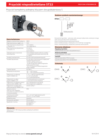 Przyciski niepodświetlane ST22 PRZYCISKI STEROWNICZE Przycisk kompletny pokrętny kluczem dwupołożeniowy S Budowa symbolu zamówieniowego ST22- Łączniki 10, 20, 30 01, 02, 03 11, 12 21 Rodzaj przycisku SAA SAV SAC Dane techniczne Napięcie znamionowe izolacji Ui Prąd znamionowy ciągły Iu=Ith Prąd znamionowy łączeniowy Ie w kat.AC-15 Prąd znamionowy łączeniowy Ie w kat.DC-13 Zabezpieczenie zwarciowe torów łącznika Trwałość mechaniczna Trwałość łączeniowa Częstość łączeń Temperatura otoczenia Odporność na wibrację (wg IEC 60068-2-6) Odporność na udary (wg IEC 60068-2-27) Odporność na wilgotne gorąco cykliczne (IEC 60068-2-30) Odporność na mgłę solną cykliczną (wg IEC 60068-2-52) Stopień ochrony (Publ. IEC529) napędów przycisków po zamontowaniu w otworze pulpitu Przekrój przewodów przyłączeniowych Położenie pracy Oznaczenie zacisków Zgodność z normą 500 V 10 A 2,5 A (230 V) 1,6 A (400/500 V) 4 A (24 V) 1 A (110 V) 0,25 A (220 V) 10 A (wkładka bezpiecznikowa szybka) 1 kA (spodziewany prąd zwarciowy dla Ue=500 V) 0,3 mln (cykli przestawieniowych) 0,2 mln (przy znamionowych napięciach i prądach łączeniowych) 1,0 mln (cykli łączeniowych) - do 80 VA (łączenie elektromagnesów prądu przemiennego) - do 10 W (łączenie elektromagnesów prądu stałego) do 360 h-1 -40 ... +70°C (pracy) -40 ... +70°C (przechowywania) 2...13, 2...100 Hz (częstotliwość) ± 1 mm (amplituda) ± 0,7 g (przyspieszenie) 15 g (przyspieszenie szczytowe) 11 ms (czas trwania impulsu) 55°C (temperatura otoczenia) 95% (wilgotność względna) ostrość próby 1 Oznaczenie łączników - pierwsza cyfra oznacza liczbę torów zwiernych, druga cyfra oznacza liczbę torów rozwiernych. Litera A określa pozycję wyjmowania klucza Litera V określa pozycję, w której klucz nie może być wyciągnięty Litera C określa pozycję, z której klucz powraca samoczynnie Elementy składowe Napędy przycisków Napęd pokrętny kluczem dwupołożeniowy S Korpusy pośrednie Korpus pośredni ST22-6609 Łączniki Łączniki przycisków ST22 na szynę Łączniki przycisków ST22 standardowe Schematy (SAA) (SAC) 0 I 0 I (SAV) 0 I IP65 2× 1...2,5 mm² (jednodrutowych) 2× 0,75...1,5 mm² (linek) dowolne PN-EN 50013 PN-EN 60947-5-1 IEC 60947-5-1 IEC 60947-1 Akcesoria Tabliczka ST22-1901 dla przycisków pokrętnych piórkiem lub kluczem Więcej informacji na stronie www.spamel.com.pl 18-4-2014 Przyciski niepodświetlane ST22 PRZYCISKI STEROWNICZE Wymiary 90˚ 0 0 I Ø 29 I ST22-SAA ST22-SAC ST22-SAV 29 52 54,5 50 60,5 Więcej informacji na stronie www.spamel.com.pl 10 30 30 10 max 4 18-4-2014