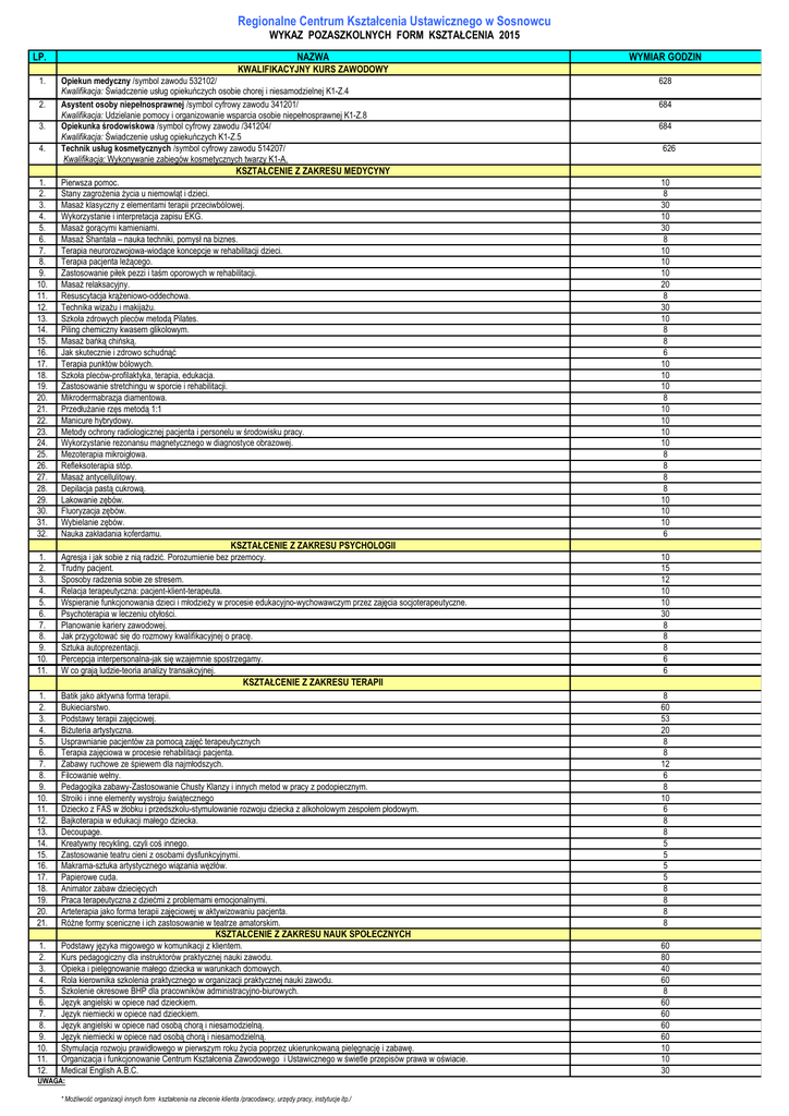 Regionalne Centrum Kształcenia Ustawicznego w Sosnowcu WYKAZ POZASZKOLNYCH FORM KSZTAŁCENIA 2015 LP. NAZWA WYMIAR GODZIN KWALIFIKACYJNY KURS ZAWODOWY 1. 2. 3. 4. Opiekun medyczny /symbol zawodu 532102/ Kwalifikacja: Świadczenie usług opiekuńczych osobie chorej i niesamodzielnej K1-Z.4 Asystent osoby niepełnosprawnej /symbol cyfrowy zawodu 341201/ Kwalifikacja: Udzielanie pomocy i organizowanie wsparcia osobie niepełnosprawnej K1-Z.8 Opiekunka środowiskowa /symbol cyfrowy zawodu /341204/ Kwalifikacja: Świadczenie usług opiekuńczych K1-Z.5 Technik usług kosmetycznych /symbol cyfrowy zawodu 514207/ Kwalifikacja: Wykonywanie zabiegów kosmetycznych twarzy K1-A. 628 684 684 626 KSZTAŁCENIE Z ZAKRESU MEDYCYNY 1. 2. 3. 4. 5. 6. 7. 8. 9. 10. 11. 12. 13. 14. 15. 16. 17. 18. 19. 20. 21. 22. 23. 24. 25. 26. 27. 28. 29. 30. 31. 32. Pierwsza pomoc. Stany zagrożenia życia u niemowląt i dzieci. Masaż klasyczny z elementami terapii przeciwbólowej. Wykorzystanie i interpretacja zapisu EKG. Masaż gorącymi kamieniami. Masaż Shantala – nauka techniki, pomysł na biznes. Terapia neurorozwojowa-wiodące koncepcje w rehabilitacji dzieci. Terapia pacjenta leżącego. Zastosowanie piłek pezzi i taśm oporowych w rehabilitacji. Masaż relaksacyjny. Resuscytacja krążeniowo-oddechowa. Technika wizażu i makijażu. Szkoła zdrowych pleców metodą Pilates. Piling chemiczny kwasem glikolowym. Masaż bańką chińską. Jak skutecznie i zdrowo schudnąć Terapia punktów bólowych. Szkoła pleców-profilaktyka, terapia, edukacja. Zastosowanie stretchingu w sporcie i rehabilitacji. Mikrodermabrazja diamentowa. Przedłużanie rzęs metodą 1:1 Manicure hybrydowy. Metody ochrony radiologicznej pacjenta i personelu w środowisku pracy. Wykorzystanie rezonansu magnetycznego w diagnostyce obrazowej. Mezoterapia mikroigłowa. Refleksoterapia stóp. Masaż antycellulitowy. Depilacja pastą cukrową. Lakowanie zębów. Fluoryzacja zębów. Wybielanie zębów. Nauka zakładania koferdamu. 1. 2. 3. 4. 5. 6. 7. 8. 9. 10. 11. Agresja i jak sobie z nią radzić. Porozumienie bez przemocy. Trudny pacjent. Sposoby radzenia sobie ze stresem. Relacja terapeutyczna: pacjent-klient-terapeuta. Wspieranie funkcjonowania dzieci i młodzieży w procesie edukacyjno-wychowawczym przez zajęcia socjoterapeutyczne. Psychoterapia w leczeniu otyłości. Planowanie kariery zawodowej. Jak przygotować się do rozmowy kwalifikacyjnej o pracę. Sztuka autoprezentacji. Percepcja interpersonalna-jak się wzajemnie spostrzegamy. W co grają ludzie-teoria analizy transakcyjnej. 1. 2. 3. 4. 5. 6. 7. 8. 9. 10. 11. 12. 13. 14. 15. 16. 17. 18. 19. 20. 21. Batik jako aktywna forma terapii. Bukieciarstwo. Podstawy terapii zajęciowej. Biżuteria artystyczna. Usprawnianie pacjentów za pomocą zajęć terapeutycznych Terapia zajęciowa w procesie rehabilitacji pacjenta. Zabawy ruchowe ze śpiewem dla najmłodszych. Filcowanie wełny. Pedagogika zabawy-Zastosowanie Chusty Klanzy i innych metod w pracy z podopiecznym. Stroiki i inne elementy wystroju świątecznego Dziecko z FAS w żłobku i przedszkolu-stymulowanie rozwoju dziecka z alkoholowym zespołem płodowym. Bajkoterapia w edukacji małego dziecka. Decoupage. Kreatywny recykling, czyli coś innego. Zastosowanie teatru cieni z osobami dysfunkcyjnymi. Makrama-sztuka artystycznego wiązania węzłów. Papierowe cuda. Animator zabaw dziecięcych Praca terapeutyczna z dziećmi z problemami emocjonalnymi. Arteterapia jako forma terapii zajęciowej w aktywizowaniu pacjenta. Różne formy sceniczne i ich zastosowanie w teatrze amatorskim. 1. 2. 3. 4. 5. 6. 7. 8. 9. 10. 11. 12. Podstawy języka migowego w komunikacji z klientem. Kurs pedagogiczny dla instruktorów praktycznej nauki zawodu. Opieka i pielęgnowanie małego dziecka w warunkach domowych. Rola kierownika szkolenia praktycznego w organizacji praktycznej nauki zawodu. Szkolenie okresowe BHP dla pracowników administracyjno-biurowych. Język angielski w opiece nad dzieckiem. Język niemiecki w opiece nad dzieckiem. Język angielski w opiece nad osobą chorą i niesamodzielną. Język niemiecki w opiece nad osobą chorą i niesamodzielną. Stymulacja rozwoju prawidłowego w pierwszym roku życia poprzez ukierunkowaną pielęgnację i zabawę. Organizacja i funkcjonowanie Centrum Kształcenia Zawodowego i Ustawicznego w świetle przepisów prawa w oświacie. Medical English A.B.C. 10 8 30 10 30 8 10 10 10 20 8 30 10 8 8 6 10 10 10 8 10 10 10 10 8 8 8 8 10 10 10 6 KSZTAŁCENIE Z ZAKRESU PSYCHOLOGII 10 15 12 10 10 30 8 8 8 6 6 KSZTAŁCENIE Z ZAKRESU TERAPII 8 60 53 20 8 8 12 6 8 10 6 8 8 5 5 5 5 8 8 8 8 KSZTAŁCENIE Z ZAKRESU NAUK SPOŁECZNYCH UWAGA: * Możliwość organizacji innych form kształcenia na zlecenie klienta /pracodawcy, urzędy pracy, instytucje itp./ 60 80 40 60 8 60 60 60 60 10 10 30