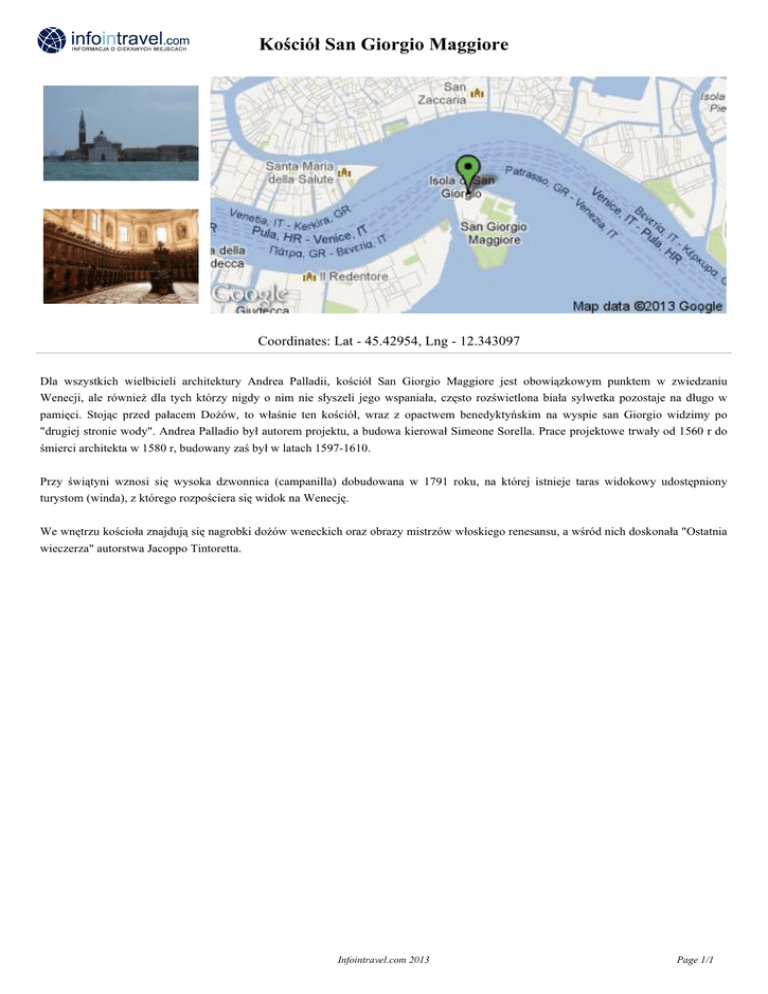 Kościół San Giorgio Maggiore Coordinates: Lat - 45.42954, Lng - 12.343097 Dla wszystkich wielbicieli architektury Andrea Palladii, kościół San Giorgio Maggiore jest obowiązkowym punktem w zwiedzaniu Wenecji, ale również dla tych którzy nigdy o nim nie słyszeli jego wspaniała, często rozświetlona biała sylwetka pozostaje na długo w pamięci. Stojąc przed pałacem Dożów, to właśnie ten kościół, wraz z opactwem benedyktyńskim na wyspie san Giorgio widzimy po "drugiej stronie wody". Andrea Palladio był autorem projektu, a budowa kierował Simeone Sorella. Prace projektowe trwały od 1560 r do śmierci architekta w 1580 r, budowany zaś był w latach 1597-1610. Przy świątyni wznosi się wysoka dzwonnica (campanilla) dobudowana w 1791 roku, na której istnieje taras widokowy udostępniony turystom (winda), z którego rozpościera się widok na Wenecję. We wnętrzu kościoła znajdują się nagrobki dożów weneckich oraz obrazy mistrzów włoskiego renesansu, a wśród nich doskonała "Ostatnia wieczerza" autorstwa Jacoppo Tintoretta. Infointravel.com 2013 Page 1/1