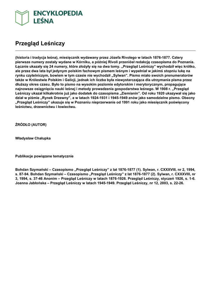 Przegląd Leśniczy (historia i tradycja leśna), miesięcznik wydawany przez Józefa Rivolego w latach 1876-1877. Cztery pierwsze numery zostały wydane w Kórniku, a później Rivoli przeniósł redakcję czasopisma do Poznania. Łącznie ukazały się 24 numery, które złożyły się na dwa tomy. „Przegląd Leśniczy” wychodził więc krótko, ale przez dwa lata był jedynym polskim fachowym pismem leśnym i wypełniał w jakimś stopniu lukę na rynku czytelniczym, bowiem w tym czasie nie wychodził „Sylwan”. Pismo miało swoich prenumeratorów także w Królestwie Polskim i Galicji, jednak ich liczba była niewystarczająca dla utrzymania pisma przez dłuższy okres czasu. Było to pismo na wysokim poziomie edytorskim i merytorycznym, propagujące najnowsze osiągnięcia nauki leśnej i metody prowadzenia gospodarstwa leśnego. W 1908 r. „Przegląd Leśniczy ukazał kilkakrotnie już jako dodatek do czasopisma „Ziemianin”. Od roku 1920 ukazywał się jako dział w piśmie „Rynek Drzewny”, a w latach 1924-1931 i 1945-1949 znów jako samodzielne pismo. Obecny „Przegląd Leśniczy” ukazuje się w Poznaniu nieprzerwanie od 1991 roku jako miesięcznik poświęcony leśnictwu, drzewnictwu i łowiectwu. ŹRÓDŁO (AUTOR) Władysław Chałupka Publikacje powiązane tematycznie Bohdan Szymański – Czasopismo „Przegląd Leśniczy” z lat 1876-1877 (1). Sylwan, r. CXXXVIII, nr 2, 1994, s. 87-94. Bohdan Szymański – Czasopismo „Przegląd Leśniczy” z lat 1876-1877 (2). Sylwan, r. CXXXVIII, nr 3, 1994, s. 37-46 Anonim – Przegląd Leśniczy w latach 1876-1926. Przegląd Leśniczy, styczeń 1926, s. 1-6. Joanna Jabłońska – Przegląd Leśniczy w latach 1945-1949. Przegląd Leśniczy, nr 12, 2003, s. 22-26.