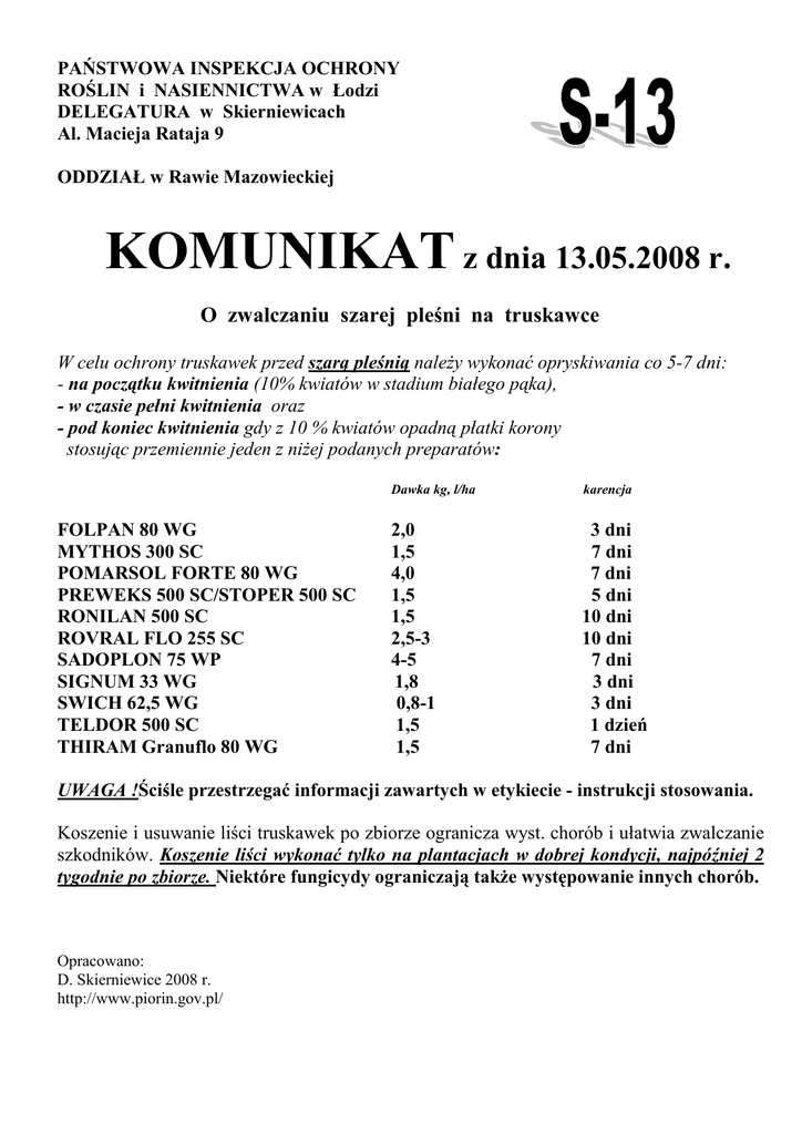 Komunikat z dnia 13.05.2008 r. S-13 o zwalczaniu szarej pleśni na