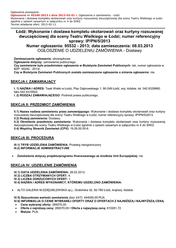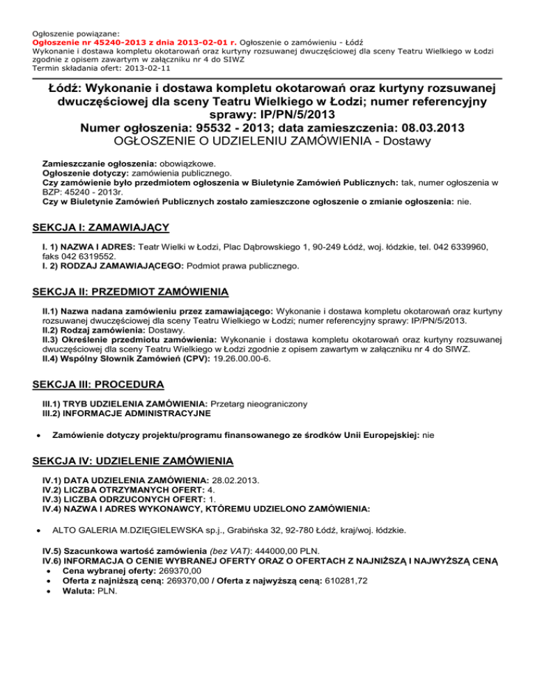Ogłoszenie powiązane: Ogłoszenie nr 45240-2013 z dnia 2013-02-01 r. Ogłoszenie o zamówieniu - Łódź Wykonanie i dostawa kompletu okotarowań oraz kurtyny rozsuwanej dwuczęściowej dla sceny Teatru Wielkiego w Łodzi zgodnie z opisem zawartym w załączniku nr 4 do SIWZ Termin składania ofert: 2013-02-11 Łódź: Wykonanie i dostawa kompletu okotarowań oraz kurtyny rozsuwanej dwuczęściowej dla sceny Teatru Wielkiego w Łodzi; numer referencyjny sprawy: IP/PN/5/2013 Numer ogłoszenia: 95532 - 2013; data zamieszczenia: 08.03.2013 OGŁOSZENIE O UDZIELENIU ZAMÓWIENIA - Dostawy Zamieszczanie ogłoszenia: obowiązkowe. Ogłoszenie dotyczy: zamówienia publicznego. Czy zamówienie było przedmiotem ogłoszenia w Biuletynie Zamówień Publicznych: tak, numer ogłoszenia w BZP: 45240 - 2013r. Czy w Biuletynie Zamówień Publicznych zostało zamieszczone ogłoszenie o zmianie ogłoszenia: nie. SEKCJA I: ZAMAWIAJĄCY I. 1) NAZWA I ADRES: Teatr Wielki w Łodzi, Plac Dąbrowskiego 1, 90-249 Łódź, woj. łódzkie, tel. 042 6339960, faks 042 6319552. I. 2) RODZAJ ZAMAWIAJĄCEGO: Podmiot prawa publicznego. SEKCJA II: PRZEDMIOT ZAMÓWIENIA II.1) Nazwa nadana zamówieniu przez zamawiającego: Wykonanie i dostawa kompletu okotarowań oraz kurtyny rozsuwanej dwuczęściowej dla sceny Teatru Wielkiego w Łodzi; numer referencyjny sprawy: IP/PN/5/2013. II.2) Rodzaj zamówienia: Dostawy. II.3) Określenie przedmiotu zamówienia: Wykonanie i dostawa kompletu okotarowań oraz kurtyny rozsuwanej dwuczęściowej dla sceny Teatru Wielkiego w Łodzi zgodnie z opisem zawartym w załączniku nr 4 do SIWZ. II.4) Wspólny Słownik Zamówień (CPV): 19.26.00.00-6. SEKCJA III: PROCEDURA III.1) TRYB UDZIELENIA ZAMÓWIENIA: Przetarg nieograniczony III.2) INFORMACJE ADMINISTRACYJNE Zamówienie dotyczy projektu/programu finansowanego ze środków Unii Europejskiej: nie SEKCJA IV: UDZIELENIE ZAMÓWIENIA IV.1) DATA UDZIELENIA ZAMÓWIENIA: 28.02.2013. IV.2) LICZBA OTRZYMANYCH OFERT: 4. IV.3) LICZBA ODRZUCONYCH OFERT: 1. IV.4) NAZWA I ADRES WYKONAWCY, KTÓREMU UDZIELONO ZAMÓWIENIA: ALTO GALERIA M.DZIĘGIELEWSKA sp.j., Grabińska 32, 92-780 Łódź, kraj/woj. łódzkie. IV.5) Szacunkowa wartość zamówienia (bez VAT): 444000,00 PLN. IV.6) INFORMACJA O CENIE WYBRANEJ OFERTY ORAZ O OFERTACH Z NAJNIŻSZĄ I NAJWYŻSZĄ CENĄ Cena wybranej oferty: 269370,00 Oferta z najniższą ceną: 269370,00 / Oferta z najwyższą ceną: 610281,72 Waluta: PLN.