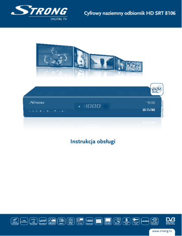 Symulacja obrazu Cyfrowy naziemny odbiornik HD SRT 8106 Instrukcja obsługi Spis treści 14 Mar 2012 18:16 1.0 Wprowadzenie 1.1 Instrukcje bezpieczeństwa 1.2 Przechowywanie 1.3 Ustawienia sprzętu 1.4 Akcesoria 1.5 Zastosowanie zewnętrznych urządzeń USB 2.0 Państwa odbiornik 2.1 DOMYŚLNY KOD PIN: 0000 2.2 Panel przedni 2.3 Panel tylny 2.4 Pilot 3.0 Podłączenie 3.1 Podłączanie do anteny naziemnej 3.2 Podłączanie do TV przy pomocy kabla HDMI 3.3 Podłączanie do TV przy pomocy kabla SCART 3.4 Podłączanie do TV przy pomocy kabla Cinch 3.5 Podłączanie do cyfrowego wzmacniacza audio przy pomocy S / PDIF 3.6 Podłączanie do cyfrowego wzmacniacza audio i TV przy pomocy HDMI 3.7 Podłączanie urządzenia pamięci masowej USB 3.8 Podłączenie do telewizora za pomocą wyjścia modulatora 4.0 Uruchomienie po raz pierwszy 5.0 Szybki przewodnik po użytkowaniu odbiornika 6.0 Działanie 6.1 Zmiana kanałów 6.2 Baner informacyjny 6.3 Wybór języka audio 6.4 Teletekst 6.5 Podtytuły 6.6 Time Shift (odtwarzanie przesunięte w czasie) 6.7 EPG (elektroniczny przewodnik po programach) 6.8 Instant Recording (natychmiastowe nagrywanie) 7.0 Menu Główne 7.1 Edytuj kanał 7.2 Instalacja 7.3 Ustawienia systemu 7.4 Narzędzia 7.5 Gry 7.6 Media+ 8.0 Usuwanie problemów 9.0 Specyfikacje Techniczne 2 2 2 3 3 3 4 4 4 4 4 5 5 5 5 6 6 6 6 6 7 8 8 8 9 9 9 9 9 9 10 10 10 12 13 16 17 17 20 21 STRONG oświadcza, że niniejszy produkt jest zgodny z podstawowymi wymaganiami i innymi właściwymi przepisami dyrektyw CE 2004/108/EC i 73/23/EC, RoHS 2002/95/EC Z zastrzeżeniem zmian. W wyniku ciągłych czynności R&D, specyfikacje techniczne, projekt i wygląd produktów mogą ulec zmianie. Wszystkie nazwy produktów lub znaki towarowe lub zarejestrowane znaki towarowe są własnością ich odpowiednichwłaścicieli. © STRONG 2012. Wszelkie prawa zastrzeżone. 1 Polska PART 7 • Polska PART 7 • Polska 1.0 Wprowadzenie 1.1 Instrukcje bezpieczeństwa PROSZĘ NIE INSTALOWAĆ ODBIORNIKA: W zamkniętej lub słabo wentylowanej szafce; bezpośrednio na lub pod jakimkolwiek innym sprzętem; na powierzchni, która może blokować szczeliny wentylacyjne. PROSZĘ NIE NARAŻAĆ ODBIORNIKA LUB JEGO AKCESORIÓW: Na bezpośrednie nasłonecznienie lub inny sprzęt, który generuje ciepło; na deszcz lub intensywną wilgoć; intensywne wibracje oraz jakikolwiek wstrząs, który może spowodować permanentne uszkodzenie odbiornika lub na jakiekolwiek obiekty magnetyczne, takie jak głośniki, transformatory, itp. Proszę nie stosować uszkodzonego kabla zasilania. Może to spowodować pożar lub porażenie prądem. Proszę nie dotykać kabla zasilania mokrymi rękoma. Może to spowodować porażenie prądem. W przypadku, gdy odbiornik nie jest używany przez długi okres czasu, proszę odłączyć kabel zasilania od gniazdka. Do czyszczenia nie wolno stosować cieczy opartych na alkoholu lub amoniaku. Mogą Państwo czyścić odbiornik miękką, nie zawierającą surowej bawełny szmatką, lekko zwilżoną roztworem łagodnego mydła, tylko po odłączeniu od napięcia. Proszę upewnić się, że przez szczeliny wentylacyjne nie będą wpadać obce przedmioty, ponieważ może spowodować to pożar lub porażenie prądem. Nie wolno umieszczać jakichkolwiek obiektów na wierzchu odbiornika, ponieważ może to uniemożliwić właściwe schładzanie komponentów wewnątrz. Środki ostrożności Nigdy nie należy otwierać wieczka odbiornika. Taka czynność unieważnia gwarancję. Dotykanie wnętrza odbiornika jest niebezpieczne ze względu na prąd wysokiego napięcia i możliwie zagrożenia porażenia prądem. Proszę zlecić konserwacje lub serwisowanie wykwalifikowanemu personelowi. Podczas podłączania kabli, proszę upewnić się, że odbiornik jest odłączony od zasilania sieciowego. Proszę odczekać kilka sekund po wyłączeniu odbiornika przed jego przesunięciem lub odłączeniem jakiegokolwiek sprzętu. Proszę stosować wyłącznie zatwierdzone przedłużacze z kompatybilnymi przewodami, które są odpowiednie dla zużycia energii elektrycznej zainstalowanego sprzętu. Proszę upewnić się, że dostarczana energia elektryczna odpowiada napięciu na tabliczce znamionowej z tyłu odbiornika. Jeżeli odbiornik nie działa normalnie nawet w przypadku bezwzględnego przestrzegania zaleceń zawartych w tej instrukcji użytkownika, proszę skonsultować się z dealerem. 1.2 Przechowywanie Odbiornik i jego akcesoria są przechowywane i dostarczone w opakowaniach mających na celu ochronę przed porażeniami prądem elektrycznym i wilgocią. W trakcie rozpakowywania proszę upewnić się, że wszystkie części są uwzględnione oraz proszę chronić opakowanie przed dziećmi. 2 PART 7 • Polska W celu przetransportowania odbiornika z jednego miejsca na drugie lub w przypadku jego zwrotu na warunkach gwarancji, proszę upewnić się, że odbiornik został przepakowany do oryginalnego opakowania wraz z akcesoriami. Nieprzestrzeganie powyższych procedur dotyczących opakowania może unieważnić gwarancję. 1.3 Ustawienia sprzętu Zalecamy konsultacje z profesjonalnym instalatorem w celu ustawienia sprzętu. W przeciwnym razie, proszę stosować się do poniższych zaleceń: Proszę sprawdzić instrukcję obsługi TV i anteny. Należy upewnić się, że kabel HDMI i komponenty zewnętrzne są w odpowiednim stanie. W celu uzyskania maksymalnej wydajności proszę zastosować kabel HDMI 1.3 lub lepszy. Jeśli korzystają Państwo z łącza TV SCART, proszę zastosować dobrze osłonięty kabel SCART. Jeśli korzystasz z połączenia modulatora, użyj dobrej jakości kabla koncentrycznego RF. Niniejsza instrukcja zapewnia kompletne wskazówki dotyczące zainstalowania i użytkowania tego odbiornika. Poniższe symbole są wykorzystywane następująco. OstrzeżenieWskazuje informację ostrzegawczą. Porady Wskazuje jakiekolwiek inne dodatkowe ważne lub pomocne informacje. MENUReprezentuje przycisk na pilocie odbiornika.