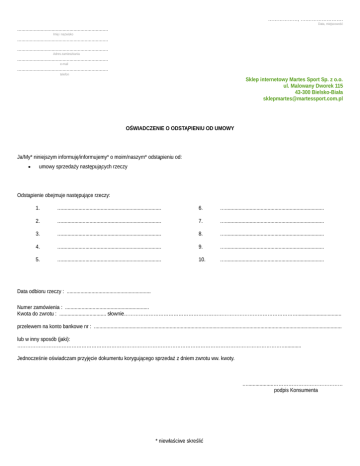 ………………, ….…………………. Data, miejscowość .................................................................. Imię i nazwisko .................................................................. .................................................................. Adres zamieszkania .................................................................. e-mail .................................................................. telefon Sklep internetowy Martes Sport Sp. z o.o. ul. Malowany Dworek 115 43-300 Bielsko-Biała [email protected] OŚWIADCZENIE O ODSTĄPIENIU OD UMOWY Ja/My* niniejszym informuję/informujemy* o moim/naszym* odstąpieniu od: umowy sprzedaży następujących rzeczy Odstąpienie obejmuje następujące rzeczy: 1. …........................................................................ 6. …........................................................................ 2. …........................................................................ 7. …........................................................................ 3. …........................................................................ 8. …........................................................................ 4. …........................................................................ 9. …........................................................................ 5. …........................................................................ 10. …........................................................................ Data odbioru rzeczy : ............................................................. Numer zamówienia : ............................................................. Kwota do zwrotu : .................................. słownie……………………………………………………………………………………………................................ przelewem na konto bankowe nr : .................................................................................................................................................................................... lub w inny sposób (jaki): ………………………………………………………………………………………………………………………………………………............ Jednocześnie oświadczam przyjęcie dokumentu korygującego sprzedaż z dniem zwrotu ww. kwoty. …...................…………………………………… podpis Konsumenta * niewłaściwe skreślić INFORMACJE DOTYCZĄCE KORZYSTANIA Z PRAWA ODSTĄPIENIA OD UMOWY Zgodnie z aktualnymi przepisami prawnymi, mają Państwo prawo odstąpić od niniejszej umowy w terminie 14 dni bez podania jakiejkolwiek przyczyny. Termin do odstąpienia od umowy wygasa po upływie 14 dni od dnia w którym weszli Państwo w posiadanie rzeczy lub w którym osoba trzecia inna niż przewoźnik i wskazana przez Państwa weszła w posiadanie rzeczy. Aby skorzystać z prawa odstąpienia od umowy, muszą Państwo poinformować nas (Martes Sport Sp. z o.o. Sklep Internetowy ul. Malowany Dworek 115 43-300 Bielsko-Biała, numer faksu: 033 828-17-41 / adres poczty elektronicznej: [email protected]) o swojej decyzji o odstąpieniu od niniejszej umowy w drodze jednoznacznego oświadczenia (na przykład pismo wysłane pocztą, faksem lub pocztą elektroniczną). Mogą Państwo skorzystać z wzoru formularza odstąpienia od umowy, jednak nie jest to obowiązkowe. Aby zachować termin do odstąpienia od umowy, wystarczy, aby wysłali Państwo informację dotyczącą wykonania przysługującego Państwu prawa odstąpienia od umowy przed upływem terminu do odstąpienia od umowy. W przypadku odstąpienia od niniejszej umowy zwracamy Państwu wszystkie otrzymane od Państwa płatności, w tym koszty dostarczenia rzeczy (z wyjątkiem dodatkowych kosztów wynikających z wybranego przez Państwa sposobu dostarczenia innego niż najtańszy zwykły sposób dostarczenia oferowany przez nas), niezwłocznie, a w każdym przypadku nie później niż 14 dni od dnia, w którym zostaliśmy poinformowani o Państwa decyzji o wykonaniu prawa odstąpienia od niniejszej umowy. Zwrotu płatności dokonamy przy użyciu takich samych sposobów płatności, jakie zostały przez Państwa użyte w pierwotnej transakcji, chyba że wyraźnie zgodziliście się Państwo na inne rozwiązanie - w każdym przypadku nie poniosą Państwo żadnych opłat w związku z tym zwrotem. Możemy wstrzymać się ze zwrotem płatności do czasu otrzymania rzeczy lub do czasu dostarczenia nam dowodu jej odesłania, w zależności od tego, które zdarzenie nastąpi wcześniej. Proszę odesłać lub przekazać nam rzecz niezwłocznie, a w każdym razie nie później niż 14 dni od dnia, w którym poinformowali nas Państwo o odstąpieniu od niniejszej umowy. Termin jest zachowany, jeżeli odeślą Państwo rzecz przed upływem terminu 14 dni. Będą Państwo musieli ponieść bezpośrednie koszty zwrotu rzeczy. Odpowiadają Państwo tylko za zmniejszenie wartości rzeczy wynikające z korzystania z niej w sposób inny niż było to konieczne do stwierdzenia charakteru, cech i funkcjonowania rzeczy.
