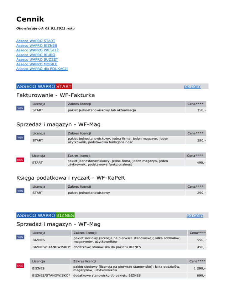 Cennik Obowiązuje od: 01.01.2011 roku Asseco Asseco Asseco Asseco Asseco Asseco Asseco WAPRO WAPRO WAPRO WAPRO WAPRO WAPRO WAPRO START BIZNES PRESTIŻ BIURO BUDŻET MOBILE dla EDUKACJI ASSECO WAPRO START DO GÓRY Fakturowanie - WF-Fakturka WIN Licencja Zakres licencji START pakiet jednostanowiskowy lub aktualizacja Cena**** 150,- Sprzedaż i magazyn - WF-Mag Licencja Zakres licencji START pakiet jednostanowiskowy, jedna firma, jeden magazyn, jeden użytkownik, podstawowa funkcjonalność Licencja Zakres licencji START pakiet jednostanowiskowy, jedna firma, jeden magazyn, jeden użytkownik, podstawowa funkcjonalność WIN DOS Cena**** 290,- Cena**** 490,- Księga podatkowa i ryczałt - WF-KaPeR WIN Licencja Zakres licencji START pakiet jednostanowiskowy ASSECO WAPRO BIZNES Cena**** 290,- DO GÓRY Sprzedaż i magazyn - WF-Mag Licencja Zakres licencji BIZNES pakiet sieciowy (licencja na pierwsze stanowisko); kilka oddziałów, magazynów, użytkowników WIN BIZNES/STANOWISKO* dodatkowe stanowisko do pakietu BIZNES Licencja Zakres licencji BIZNES pakiet sieciowy (licencja na pierwsze stanowisko); kilka oddziałów, magazynów, użytkowników DOS BIZNES/STANOWISKO* dodatkowe stanowisko do pakietu BIZNES Cena**** 990,490,- Cena**** 1 290,690,- Księga podatkowa i ryczałt - WF-KaPeR WIN Licencja Zakres licencji BIZNES pakiet sieciowy (licencja na pierwsze stanowisko); do 3 oddziałów BIZNES/STANOWISKO* dodatkowe stanowisko do pakietu BIZNES DOS Licencja Zakres licencji BIZNES pakiet sieciowy (licencja na pierwsze stanowisko); do 3 oddziałów Cena**** 790,390,- Cena**** 990,- Finanse i księgowość - WF-FaKir WIN Licencja Zakres licencji BIZNES pakiet sieciowy (licencja na pierwsze stanowisko); do 3 oddziałów BIZNES/STANOWISKO* dodatkowe stanowisko do pakietu BIZNES Cena**** 1 490,890,- Kadry i płace - WF-GANG Licencja WIN BIZNES 30 BIZNES 50 BIZNES 100 BIZNES/PAKIET 100 BIZNES MAX Zakres licencji pakiet sieciowy do 30 osób w kartotece (licencja na pierwsze stanowisko); do 3 oddziałów pakiet sieciowy do 50 osób w kartotece (licencja na pierwsze stanowisko); do 3 oddziałów pakiet sieciowy do 100 osób w kartotece (licencja na pierwsze stanowisko); do 3 oddziałów każde kolejne 100 osób w kartotece ponad wariant BIZNES 100 (licencja na pierwsze stanowisko); do 3 oddziałów pakiet sieciowy powyżej 1200 osób w kartotece; do 3 oddziałów (na zamówienie) BIZNES/STANOWISKO* każde następne stanowisko do pakietu BIZNES Licencja Zakres licencji BIZNES 30 pakiet sieciowy do 30 osób w kartotece (licencja na pierwsze stanowisko); do 3 oddziałów BIZNES 50 pakiet sieciowy do 50 osób w kartotece; do 3 oddziałów DOS BIZNES/PAKIET 50 BIZNES MAX każde kolejne 50 osób w kartotece ponad wariant BIZNES 50; do 3 oddziałów pakiet sieciowy powyżej 1200 osób w kartotece; do 3 oddziałów (na zamówienie) Cena**** 990,1 390,1 990,790,Tel. 25 % posiadanego pakietu Cena**** 990,1 490,900,Tel. Ewidencja środków trwałych i amortyzacji - WF-bEST WIN Licencja Zakres licencji Cena**** BIZNES 100 pakiet sieciowy do 100 środków trwałych w kartotece; do 3 oddziałów 790,- BIZNES/PAKIET 100 każde kolejne 100 środków trwałych w kartotece ponad wariant BIZNES 100; do 3 oddziałów 290,- Analizy wielowymiarowe - WF-Analizy WIN Licencja Zakres licencji Cena**** BIZNES pakiet sieciowy (licencja na pierwsze stanowisko) BIZNES/STANOWISKO* dodatkowe stanowisko do pakietu BIZNES 1 090,590,- Zarządzanie relacjami z klientami - WF-CRM Licencja WIN BIZNES 1-5 BIZNES 6-10 BIZNES 11-20 BIZNES MAX Zakres licencji pakiet sieciowy, licencja na jedno zakupie do 5 stanowisk pakiet sieciowy, licencja na jedno zakupie od 6 do 10 stanowisk pakiet sieciowy, licencja na jedno zakupie od 11 do 20 stanowisk pakiet sieciowy, licencja na jedno zakupie powyżej 20 stanowisk Cena**** stanowisko przy jednoczesnym stanowisko przy jednoczesnym stanowisko przy jednoczesnym stanowisko przy jednoczesnym ASSECO WAPRO PRESTIŻ 500,450,400,Tel. DO GÓRY Sprzedaż i magazyn - WF-Mag Licencja Zakres licencji PRESTIŻ pakiet sieciowy (licencja na pierwsze stanowisko); kilka oddziałów, magazynów, użytkowników WIN PRESTIŻ/STANOWISKO* dodatkowe stanowisko do pakietu PRESTIŻ Cena**** 1 590,1 090,- PRESTIŻ PLUS pakiet sieciowy (licencja na pierwsze stanowisko); kilka oddziałów, magazynów, użytkowników 1 990,- PRESTIŻ PLUS/STANOWISKO* dodatkowe stanowisko do pakietu PRESTIŻ PLUS 1 190,- Finanse i księgowość - WF-FaKir Licencja Zakres licencji PRESTIŻ pakiet sieciowy (licencja na pierwsze stanowisko); dowolna liczba oddziałów WIN PRESTIŻ/STANOWISKO* dodatkowe stanowisko do pakietu PRESTIŻ Cena**** 2 490,990,- Kadry i płace - WF-GANG Licencja WIN PRESTIŻ 50 PRESTIŻ 100 PRESTIŻ/PAKIET 100 PRESTIŻ MAX Zakres licencji pakiet sieciowy do 50 osób w kartotece (licencja na pierwsze stanowisko) pakiet sieciowy do 100 osób w kartotece (licencja na pierwsze stanowisko) każde kolejne 100 osób w kartotece ponad wariant PRESTIŻ 100 (licencja na pierwsze stanowisko) pakiet sieciowy powyżej 1200 osób w kartotece (licencja na pierwsze stanowisko); (na zamówienie) PRESTIŻ/STANOWISKO* każde następne stanowisko do pakietu PRESTIŻ Cena**** 2 290,3 290,1 190,Tel. 25 % posiadanego pakietu Analizy wielowymiarowe - WF-Analizy WIN Licencja Zakres licencji PRESTIŻ pakiet sieciowy (licencja na pierwsze stanowisko) Cena**** 1 990,- PRESTIŻ/STANOWISKO* dodatkowe stanowisko do pakietu PRESTIŻ ASSECO WAPRO BIURO 990,- DO GÓRY Księga podatkowa i ryczałt - WF-KaPeR WIN Licencja Zakres licencji BIURO pakiet sieciowy (licencja na pierwsze stanowisko); dowolna liczba firm BIURO/STANOWISKO* dodatkowe stanowisko do pakietu BIURO DOS Licencja Zakres licencji BIURO pakiet sieciowy (licencja na pierwsze stanowisko); dowolna liczba firm BIURO/STANOWISKO* dodatkowe stanowisko do pakietu BIURO Cena**** 1 190,890,- Cena**** 1 390,990,- Finanse i księgowość - WF-FaKir WIN Licencja Zakres licencji BIURO pakiet sieciowy (licencja na 