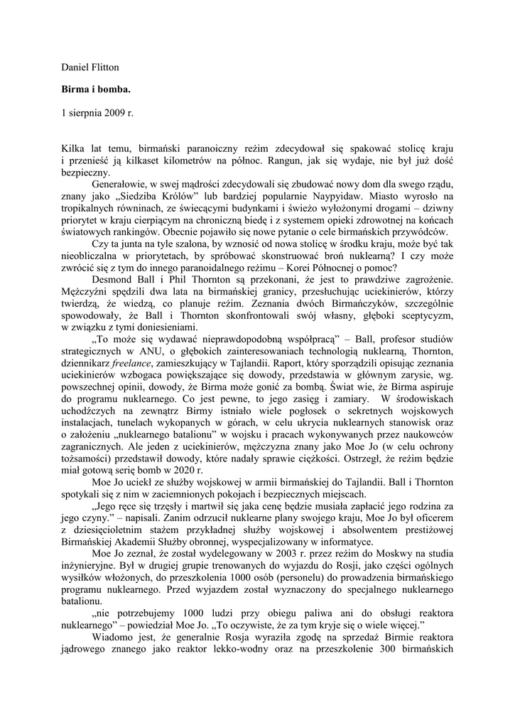 Daniel Flitton Birma i bomba. 1 sierpnia 2009 r. Kilka lat temu, birmański paranoiczny reŜim zdecydował się spakować stolicę kraju i przenieść ją kilkaset kilometrów na północ. Rangun, jak się wydaje, nie był juŜ dość bezpieczny. Generałowie, w swej mądrości zdecydowali się zbudować nowy dom dla swego rządu, znany jako „Siedziba Królów” lub bardziej popularnie Naypyidaw. Miasto wyrosło na tropikalnych równinach, ze świecącymi budynkami i świeŜo wyłoŜonymi drogami – dziwny priorytet w kraju cierpiącym na chroniczną biedę i z systemem opieki zdrowotnej na końcach światowych rankingów. Obecnie pojawiło się nowe pytanie o cele birmańskich przywódców. Czy ta junta na tyle szalona, by wznosić od nowa stolicę w środku kraju, moŜe być tak nieobliczalna w priorytetach, by spróbować skonstruować broń nuklearną? I czy moŜe zwrócić się z tym do innego paranoidalnego reŜimu – Korei Północnej o pomoc? Desmond Ball i Phil Thornton są przekonani, Ŝe jest to prawdziwe zagroŜenie. MęŜczyźni spędzili dwa lata na birmańskiej granicy, przesłuchując uciekinierów, którzy twierdzą, Ŝe wiedzą, co planuje reŜim. Zeznania dwóch Birmańczyków, szczególnie spowodowały, Ŝe Ball i Thornton skonfrontowali swój własny, głęboki sceptycyzm, w związku z tymi doniesieniami. „To moŜe się wydawać nieprawdopodobną współpracą” – Ball, profesor studiów strategicznych w ANU, o głębokich zainteresowaniach technologią nuklearną, Thornton, dziennikarz freelance, zamieszkujący w Tajlandii. Raport, który sporządzili opisując zeznania uciekinierów wzbogaca powiększające się dowody, przedstawia w głównym zarysie, wg. powszechnej opinii, dowody, Ŝe Birma moŜe gonić za bombą. Świat wie, Ŝe Birma aspiruje do programu nuklearnego. Co jest pewne, to jego zasięg i zamiary. W środowiskach uchodźczych na zewnątrz Birmy istniało wiele pogłosek o sekretnych wojskowych instalacjach, tunelach wykopanych w górach, w celu ukrycia nuklearnych stanowisk oraz o załoŜeniu „nuklearnego batalionu” w wojsku i pracach wykonywanych przez naukowców zagranicznych. Ale jeden z uciekinierów, męŜczyzna znany jako Moe Jo (w celu ochrony toŜsamości) przedstawił dowody, które nadały sprawie cięŜkości. Ostrzegł, Ŝe reŜim będzie miał gotową serię bomb w 2020 r. Moe Jo uciekł ze słuŜby wojskowej w armii birmańskiej do Tajlandii. Ball i Thornton spotykali się z nim w zaciemnionych pokojach i bezpiecznych miejscach. „Jego ręce się trzęsły i martwił się jaka cenę będzie musiała zapłacić jego rodzina za jego czyny.” – napisali. Zanim odrzucił nuklearne plany swojego kraju, Moe Jo był oficerem z dziesięcioletnim staŜem przykładnej słuŜby wojskowej i absolwentem prestiŜowej Birmańskiej Akademii SłuŜby obronnej, wyspecjalizowany w informatyce. Moe Jo zeznał, Ŝe został wydelegowany w 2003 r. przez reŜim do Moskwy na studia inŜynieryjne. Był w drugiej grupie trenowanych do wyjazdu do Rosji, jako części ogólnych wysiłków włoŜonych, do przeszkolenia 1000 osób (personelu) do prowadzenia birmańskiego programu nuklearnego. Przed wyjazdem został wyznaczony do specjalnego nuklearnego batalionu. „nie potrzebujemy 1000 ludzi przy obiegu paliwa ani do obsługi reaktora nuklearnego” – powiedział Moe Jo. „To oczywiste, Ŝe za tym kryje się o wiele więcej.” Wiadomo jest, Ŝe generalnie Rosja wyraziła zgodę na sprzedaŜ Birmie reaktora jądrowego znanego jako reaktor lekko-wodny oraz na przeszkolenie 300 birmańskich naukowców do obsługi obiektu. Powody tej wymiany określono jako cele badawcze, szczególnie do produkcji izotopów do celów medycznych. Co jest dyskusyjne, to, to czy rosyjski reaktor będzie dość duŜy, aby przekształcić go do celów produkcji wzbogaconego uranu lub plutonu jako paliwa dla broni nuklearnej. Do tych celów, zwykle potrzebny jest reaktor cięŜko-wodny. W tym miejscu pojawia się Korea Północna z jej doświadczeniami. Korea Północna pokazała, Ŝe z jej lekkim wodnym reaktorem, proces moŜe być powolny i bardziej złoŜony, ale moŜliwy – piszą Ball i Thornton. Moe Jo twierdzi, Ŝe drugi tajny reaktor podobnego rozmiaru jak rosyjski został zbudowany w kompleksie Naung Laing. Powiedział, Ŝe wojsko planowało wybudować system wzbogacania plutonu, a rosyjscy eksperci byli juŜ na miejscu zobaczyć jak to zostało zrobione. Powiedział, Ŝe teren operacyjny był ukryty w pobliŜu Gór Setkhaya placówka składająca się z inŜynierów, artylerii i łączności, działająca jako komenda i centrum oraz centrum kontroli dla programu broni nuklearnej. „W tym przypadku, jeśli świadectwa uciekinierów są prawdziwe, domniemany „sekretny reaktor” powinien działać i produkować jedną bombę rocznie, zaczynając od 2014 r.” – napisali Ball i Thornton. Tego typu doniesienia wzbudziły powaŜne zaniepokojenie. Sekretarz Stanu USA odbył podróŜ do Tajlandii na spotkanie dotyczące bezpieczeństwa regionalnego bezpośrednio podnosząc tę kwestię. „Wiemy, Ŝe wzrasta niepokój o współpracę wojskową między Birmą a Koreą Północną, które to traktujemy powaŜnie.” – powiedział. Niepokój eskalował, gdy północnokoreański frachtowiec Kang Nam I płynął w kierunku Birmy, przewoŜąc nieznany ładunek. Jeden z południowokoreańskich ekspertów słuŜb specjalnych, cytowany anonimowo, twierdził, Ŝe przyrządy satelitarne wykazały, iŜ statek był częścią tajnego nuklearnego transferu i przewoził broń dalekiego zasięgu. Śledzony przez marynarkę USA, statek ostatecznie zawrócił i wziął kurs na dom. Japońska policja takŜe ostatnio złapała Koreańczyka z Korei Północnej oraz dwóch Japończyków, którzy przypuszczalnie próbowali eksportować magnetyczny przedmiot pomiarowy do Birmy. Mógł on być uŜyty do produkcji pocisków. Ale to co wywołało zdziwienie następnego dnia, to słowa