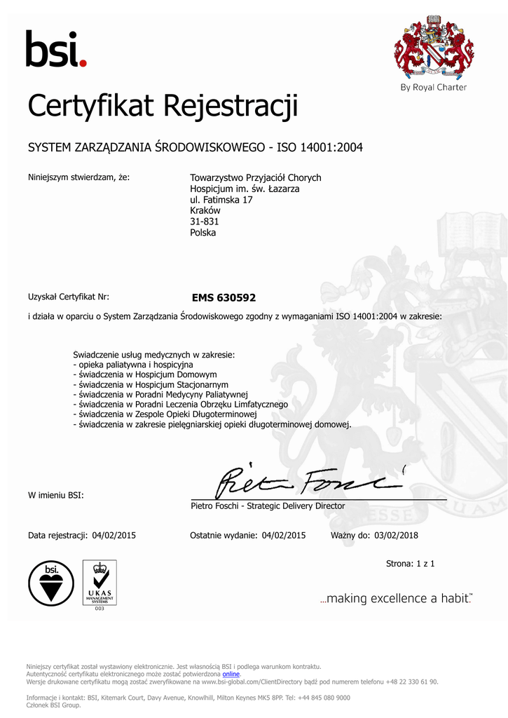Certyfikat Rejestracji SYSTEM ZARZĄDZANIA ŚRODOWISKOWEGO - ISO 14001:2004 Niniejszym stwierdzam, że: Towarzystwo Przyjaciół Chorych Hospicjum im. św. Łazarza ul. Fatimska 17 Kraków 31-831 Polska Uzyskał Certyfikat Nr: EMS 630592 i działa w oparciu o System Zarządzania Środowiskowego zgodny z wymaganiami ISO 14001:2004 w zakresie: Świadczenie usług medycznych w zakresie: - opieka paliatywna i hospicyjna - świadczenia w Hospicjum Domowym - świadczenia w Hospicjum Stacjonarnym - świadczenia w Poradni Medycyny Paliatywnej - świadczenia w Poradni Leczenia Obrzęku Limfatycznego - świadczenia w Zespole Opieki Długoterminowej - świadczenia w zakresie pielęgniarskiej opieki długoterminowej domowej. W imieniu BSI: Pietro Foschi - Strategic Delivery Director Data rejestracji: 04/02/2015 Ostatnie wydanie: 04/02/2015 Ważny do: 03/02/2018 Strona: 1 z 1 Niniejszy certyfikat został wystawiony elektronicznie. Jest własnością BSI i podlega warunkom kontraktu. Autentyczność certyfikatu elektronicznego może zostać potwierdzona online. Wersje drukowane certyfikatu mogą zostać zweryfikowane na www.bsi-global.com/ClientDirectory bądź pod numerem telefonu +48 22 330 61 90. Informacje i kontakt: BSI, Kitemark Court, Davy Avenue, Knowlhill, Milton Keynes MK5 8PP. Tel: +44 845 080 9000 Członek BSI Group.