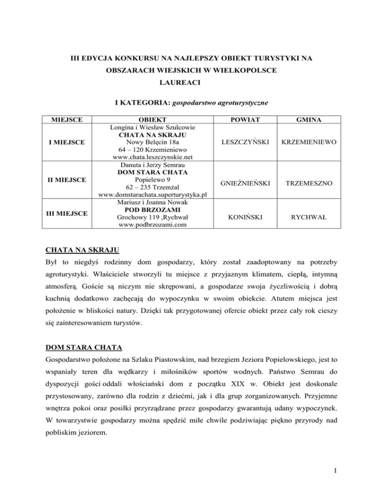 III EDYCJA KONKURSU NA NAJLEPSZY OBIEKT TURYSTYKI NA OBSZARACH WIEJSKICH W WIELKOPOLSCE LAUREACI I KATEGORIA: gospodarstwo agroturystyczne MIEJSCE I MIEJSCE II MIEJSCE III MIEJSCE OBIEKT Longina i Wiesław Szulcowie CHATA NA SKRAJU Nowy Belęcin 18a 64 – 120 Krzemieniewo www.chata.leszczynskie.net Danuta i Jerzy Semrau DOM STARA CHATA Popielewo 9 62 – 235 TrzemŜal www.domstarachata.superturystyka.pl Mariusz i Joanna Nowak POD BRZOZAMI Grochowy 119 ,Rychwał www.podbrzozami.com POWIAT GMINA LESZCZYŃSKI KRZEMIENIEWO GNIEŹNIEŃSKI TRZEMESZNO KONIŃSKI RYCHWAŁ CHATA NA SKRAJU Był to niegdyś rodzinny dom gospodarzy, który został zaadoptowany na potrzeby agroturystyki. Właściciele stworzyli tu miejsce z przyjaznym klimatem, ciepłą, intymną atmosferą. Goście są niczym nie skrępowani, a gospodarze swoja Ŝyczliwością i dobrą kuchnią dodatkowo zachęcają do wypoczynku w swoim obiekcie. Atutem miejsca jest połoŜenie w bliskości natury. Dzięki tak przygotowanej ofercie obiekt przez cały rok cieszy się zainteresowaniem turystów. DOM STARA CHATA Gospodarstwo połoŜone na Szlaku Piastowskim, nad brzegiem Jeziora Popielowskiego, jest to wspaniały teren dla wędkarzy i miłośników sportów wodnych. Państwo Semrau do dyspozycji gości oddali włościański dom z początku XIX w. Obiekt jest doskonale przystosowany, zarówno dla rodzin z dziećmi, jak i dla grup zorganizowanych. Przyjemne wnętrza pokoi oraz posiłki przyrządzane przez gospodarzy gwarantują udany wypoczynek. W towarzystwie gospodarzy moŜna spędzić miłe chwile podziwiając piękno przyrody nad pobliskim jeziorem. 1 Gospodarstwo ponadto zajęło I miejsce w konkursie na najlepsze gospodarstwo agroturystyczne w powiecie gnieźnieńskim w 2006 roku. POD BRZOZAMI Agroturystyka „POD BRZOZAMI” to gospodarstwo przyjazne dzieciom. Wszystkie działania gospodarzy skoncentrowane są na stworzeniu jak najlepszych warunków dla rodzin z dziećmi i zagwarantowaniu im bezpiecznej zabawy. Państwo Nowak stawiają na edukację najmłodszych przez pokazywanie codziennych prac w gospodarstwie, uczą takŜe właściwego podejścia i opieki nad zwierzętami utrzymywanymi w gospodarstwie. II KATEGORIA : obiekt wiejskiej bazy noclegowej do 25 miejsc noclegowych („kwatera wiejska”) nieprowadzący produkcji rolniczej MIEJSCE I MIEJSCE OBIEKT Maria Rau-Heina POWIAT GMINA Gospodarstwo agroturystyczne DWÓR I STAJNA DEBOGÓRA Dębogóra 18 64 – 730 Wieleń www.debogora.pl CZARNKOWSKO - TRZCIANECKI WIELEŃ OSTRZESZOWSKI OSTRZESZÓW SŁUPECKI SŁUPCA GRODZISKI GRODZISK WLPK. Aleksandra i Marek Heflik II MIEJSCE III MIEJSCE WYRÓśNIENIE DWOREK POD SOWĄ CELINKĄ Kochłowy –Celinka 58 63 – 500 Ostrzeszów Iwona i Stanisław Rajkowscy AGRORAJ Niezgoda 27 62 – 402 Ostrowite www.agroraj.pl Hanna Pioszyk Gospodarstwo Agroturystyczne ZACISZE Czarna Wieś 20 www.zacisze-czarnawies.pl 2 DWÓR DĘBOGÓRA Dębogóra to miejscowość połoŜona na terenie północnej Wielkopolski, na skraju Puszczy Noteckiej. Kryształowo czyste powietrze i bliskość przyrody stwarzają tu doskonałe warunki do wypoczynku. Dwór Dębogóra leŜy wśród pól i lasów, gdzie kaŜdy znajdzie miejsce dla siebie. Gospodyni jest osobą charyzmatyczną, pełną pomysłów i chęci do podejmowania róŜnych wyzwań , do czego zachęca równieŜ swoich gości. DWOREK POD SOWĄ CELINKĄ Gospodarstwo połoŜone jest na terenie malowniczych Wzgórz Ostrzeszowskich. Pan Marek Heflik, jako doskonały kucharz stawia na tradycyjną kuchnię wielkopolską, kultywuje tradycje kulinarne związane z regionem. Goście mogą tu spróbować m.in. starych zup regionalnych (farmuszka, kalteszale - zupa z piwa i chleba, ajntopf - zupa jarzynowa z mięsem), gęsi owsianej ostrzeszowskiej z kaszą, pasztetów ostrzeszowskich, czy klusek ziemniaczanych. W gospodarstwie funkcjonuje doskonale przygotowana baza noclegowa. „Dworek Pod Sowa Celiną” naleŜy do Europejskiej Sieci Regionalnego Dziedzictwa Kulinarnego. AGRORAJ Obiekt leŜy w sąsiedztwie Powidzkiego Parku Krajobrazowego. Baza noclegowa na wysokim poziomie daje poczucie komfortu i niezaleŜności. Jedną z głównych atrakcji gospodarstwa są konie. Gospodarze oferują przejaŜdŜki bryczką, a zimą kulig. Istnieje tu moŜliwość uczestnictwa w pracach polowych, obrządku zwierząt, gospodarze zapraszają do wspólnych biesiad przy kominku. ZACISZE Obiekt leŜy w Czarnej Wsi, osadzie załoŜonej w XVIII wieku na terenie leśnym, jako Czarne Olędry. Po wieloletnich poszukiwaniach Państwo Pioszyk zbudowali w tym miejscu dom oraz włoŜyli wiele sił i energii w remonty zaadoptowanych budynków. Sprowadzili konie, kozy, psy, koty, załoŜyli hodowlę danieli. Prowadzą szkółkę jeździecką. Chcąc podzielić się atmosferą tego miejsca postanowili otworzyć je dla turystów . 3 III KATEGORIA : obiekty zlokalizowane na terenach wiejskich o charakterze np. terapeutycznym, edukacyjnym, rekreacyjnym itp. MIEJSCE I MIEJSCE II MIEJSCE OBIEKT Wojciech Jaskólski GOSPODARSTWO ANIA I FILIP ul. Izabelin 47 62 – 510 Konin www.aniaifilip.net Małgorzata i Andrzej Kossowscy OGRÓD ZAKRZEWEK Zakrzewek 24 62 – 610 Zakrzewek III MIEJSCE WYRÓśNIENIE WYRÓśNIENIE POWIAT GMINA KONIŃSKI KRAMSK KONIŃSKI SOMPOLNO NIE PRZYZNANO Nadleśnictwo Sieraków Integracyjny Leśny Ogród Edukacyjny „Leśna Przygoda” Bucharzewo 64 – 410 Sieraków sierakow.lasypanstwowe.poznan.pl Nadleśnictwo Jarocin Ośrodek Edukacji Leśnej „Centrum Zarządzania Łęgami” w Czeszewie ul. Szkolna 29 62-322 Orzechowo MIĘDZYCHODZKI SIERAKÓW WRZESIŃSKI MIŁOSŁAW jarocin.lasypanstwowe.poznan.pl GOSPODARSTWO ANIA I FILIP Po trzech latach prac poświęconych realizacji pomysłu załoŜenia ciekawego, pełnego atrakcji i niespotykanego miejsca, w maju 2004 roku Państwo Jaskólscy otworzyli Gospodarstwo Agroturystyczne Ania i Filip. Dla swoich gości gospodarze przygotowali szereg atrakcji: dla wędkarzy łowisko "Raj Wędkarza" 