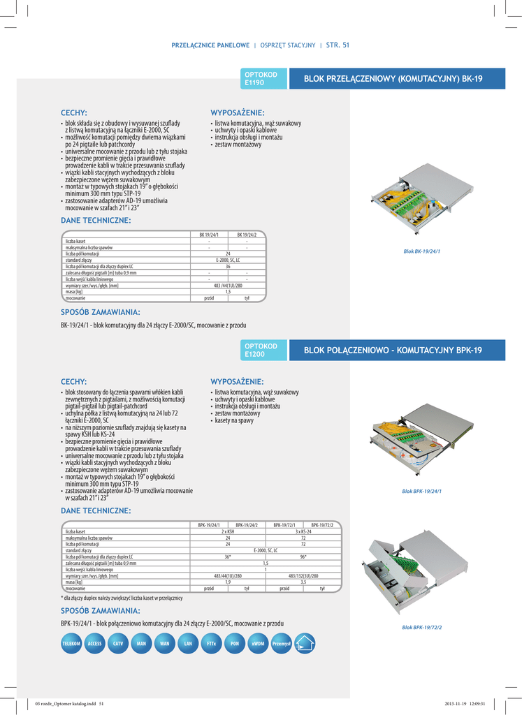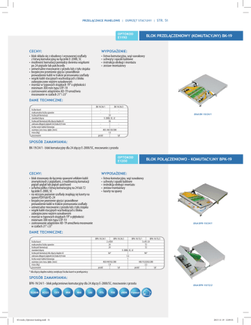 PRZEŁĄCZNICE PANELOWE | OSPRZĘT STACYJNY | STR. 51 OPTOKOD E1190 CECHY: • blok składa się z obudowy i wysuwanej szuflady z listwą komutacyjną na łączniki E-2000, SC • możliwość komutacji pomiędzy dwiema wiązkami po 24 pigtaile lub patchcordy • uniwersalne mocowanie z przodu lub z tyłu stojaka • bezpieczne promienie gięcia i prawidłowe prowadzenie kabli w trakcie przesuwania szuflady • wiązki kabli stacyjnych wychodzących z bloku zabezpieczone wężem suwakowym • montaż w typowych stojakach 19’’ o głębokości minimum 300 mm typu STP-19 • zastosowanie adapterów AD-19 umożliwia mocowanie w szafach 21’’ i 23’’ BLOK PRZEŁĄCZENIOWY (KOMUTACYJNY) BK-19 WYPOSAŻENIE: • listwa komutacyjna, wąż suwakowy • uchwyty i opaski kablowe • instrukcja obsługi i montażu • zestaw montażowy DANE TECHNICZNE: liczba kaset maksymalna liczba spawów liczba pól komutacji standard złączy liczba pól komutacji dla złączy duplex LC zalecana długość pigtaili [m] tuba 0,9 mm liczba wejść kabla liniowego wymiary szer./wys./głęb. [mm] masa [kg] mocowanie BK 19/24/1 - BK 19/24/2 - - - 24 E-2000, SC, LC 36 przód 483 /44(1U)/280 1,5 Blok BK-19/24/1 tył SPOSÓB ZAMAWIANIA: BK-19/24/1 - blok komutacyjny dla 24 złączy E-2000/SC, mocowanie z przodu OPTOKOD E1200 CECHY: • blok stosowany do łączenia spawami włókien kabli zewnętrznych z pigtailami, z możliwością komutacji pigtail-pigtail lub pigtail-patchcord • uchylna półka z listwą komutacyjną na 24 lub 72 łączniki E-2000, SC • na niższym poziomie szuflady znajdują się kasety na spawy KSH lub KS-24 • bezpieczne promienie gięcia i prawidłowe prowadzenie kabli w trakcie przesuwania szuflady • uniwersalne mocowanie z przodu lub z tyłu stojaka • wiązki kabli stacyjnych wychodzących z bloku zabezpieczone wężem suwakowym • montaż w typowych stojakach 19’’ o głębokości minimum 300 mm typu STP-19 • zastosowanie adapterów AD-19 umożliwia mocowanie w szafach 21’’ i 23’’ BLOK POŁĄCZENIOWO - KOMUTACYJNY BPK-19 WYPOSAŻENIE: • listwa komutacyjna, wąż suwakowy • uchwyty i opaski kablowe • instrukcja obsługi i montażu • zestaw montażowy • kasety na spawy Blok BPK-19/24/1 DANE TECHNICZNE: BPK-19/24/1 liczba kaset maksymalna liczba spawów liczba pól komutacji standard złączy liczba pól komutacji dla złączy duplex LC zalecana długość pigtaili [m] tuba 0,9 mm liczba wejść kabla liniowego wymiary szer./wys./głęb. [mm] masa [kg] mocowanie 2 x KSH 24 24 BPK-19/24/2 E-2000, SC, LC 36* przód 483/44(1U)/280 1,9 BPK-19/72/1 1,5 1 tył 3 x KS-24 72 72 BPK-19/72/2 96* 483/132(3U)/280 3,5 przód tył * dla złączy duplex należy zwiększyć liczba kaset w przełącznicy SPOSÓB ZAMAWIANIA: BPK-19/24/1 - blok połączeniowo komutacyjny dla 24 złączy E-2000/SC, mocowanie z przodu TELEKOM ACCESS 03 rozdz_Optomer katalog.indd 51 CATV MAN WAN LAN FTTx PON xWDM Blok BPK-19/72/2 Przemysł 2013-11-19 12:09:31