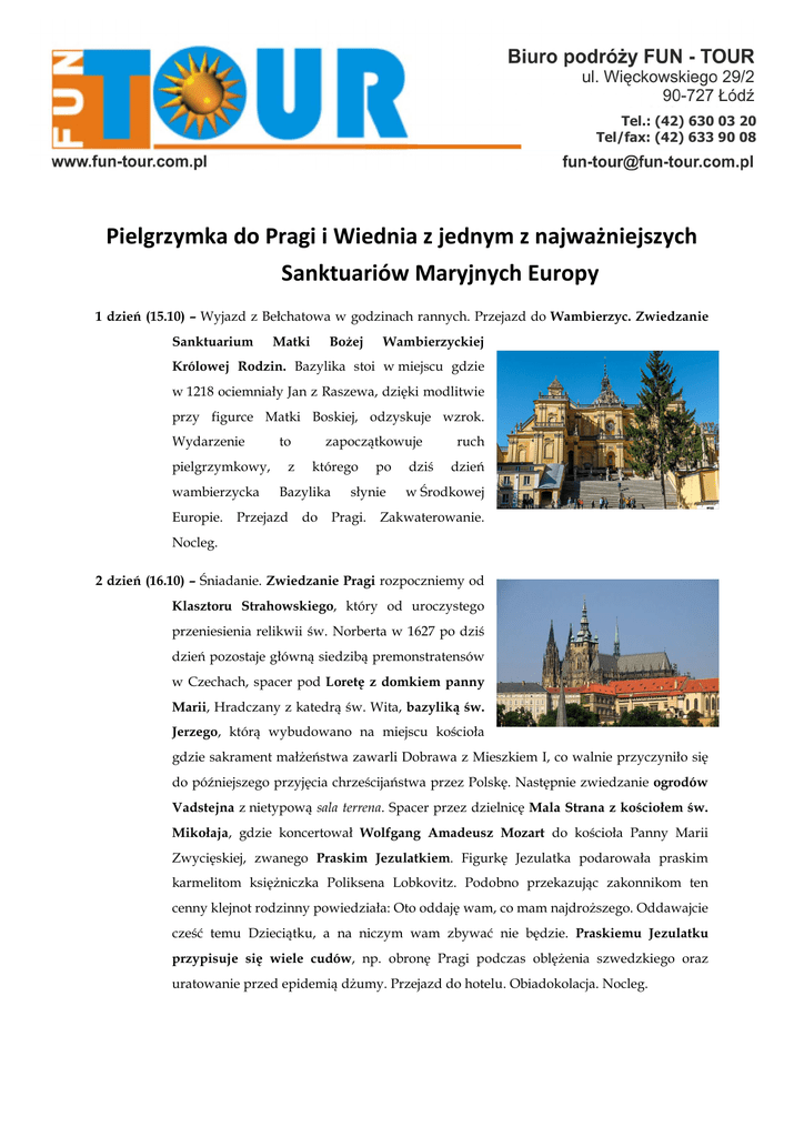 Tel.: (42) 630 03 20 Tel/fax: (42) 633 90 08 Pielgrzymka do Pragi i Wiednia z jednym z najważniejszych Sanktuariów Maryjnych Europy 1 dzień (15.10) – Wyjazd z Bełchatowa w godzinach rannych. Przejazd do Wambierzyc. Zwiedzanie Sanktuarium Matki BoŜej Wambierzyckiej Królowej Rodzin. Bazylika stoi w miejscu gdzie w 1218 ociemniały Jan z Raszewa, dzięki modlitwie przy figurce Matki Boskiej, odzyskuje wzrok. Wydarzenie pielgrzymkowy, wambierzycka Europie. to z zapoczątkowuje którego Bazylika Przejazd do po słynie Pragi. dziś ruch dzień w Środkowej Zakwaterowanie. Nocleg. 2 dzień (16.10) – Śniadanie. Zwiedzanie Pragi rozpoczniemy od Klasztoru Strahowskiego, który od uroczystego przeniesienia relikwii św. Norberta w 1627 po dziś dzień pozostaje główną siedzibą premonstratensów w Czechach, spacer pod Loretę z domkiem panny Marii, Hradczany z katedrą św. Wita, bazyliką św. Jerzego, którą wybudowano na miejscu kościoła gdzie sakrament małŜeństwa zawarli Dobrawa z Mieszkiem I, co walnie przyczyniło się do późniejszego przyjęcia chrześcijaństwa przez Polskę. Następnie zwiedzanie ogrodów Vadstejna z nietypową sala terrena. Spacer przez dzielnicę Mala Strana z kościołem św. Mikołaja, gdzie koncertował Wolfgang Amadeusz Mozart do kościoła Panny Marii Zwycięskiej, zwanego Praskim Jezulatkiem. Figurkę Jezulatka podarowała praskim karmelitom księŜniczka Poliksena Lobkovitz. Podobno przekazując zakonnikom ten cenny klejnot rodzinny powiedziała: Oto oddaję wam, co mam najdroŜszego. Oddawajcie cześć temu Dzieciątku, a na niczym wam zbywać nie będzie. Praskiemu Jezulatku przypisuje się wiele cudów, np. obronę Pragi podczas oblęŜenia szwedzkiego oraz uratowanie przed epidemią dŜumy. Przejazd do hotelu. Obiadokolacja. Nocleg. 3 dzień (17.10) – Śniadanie. Dalsze zwiedzanie stolicy Czech – Most Karola z rzeźbą św. Jana Nepomucena, rynek Starego Miasta z zegarem astronomicznym Orloj, Kościół Najświętszej Marii Panny pod Tynem, plac Wacława, ulica Na Prikope, Brama Prochowa. Przejazd do Mariazelle. Zakwaterowanie. Obiadokolacja. Nocleg. 4 dzień (18.10) – Śniadanie. Mariazelle - największe w Austrii i jedno z najwaŜniejszych w Europie sanktuariów maryjnych. Początki tego miejsca sięgają roku 1157, kiedy to mnich benedyktyński Magnus, z polecenia swojego opata, wyruszył na północ, aby załoŜyć nowy klasztor. Przejazd do Wiednia. Przejazd do Schonbrunn – rezydencji letniej Habsburgów. Zwiedzanie pięknych ogrodów z górującą nad całym kompleksem Gloriettą. Obiadokolacja. Nocleg. 5 dzień (19.10)- Śniadanie. Zwiedzanie Wiednia cesarskiego - Stephansdom (XIII – wieczna gotycka katedra, centrum Ŝycia duchowego miasta), Hofburg (zimowa rezydencja Habsburgów z Hiszpańską Dworską Szkołą Jazdy), bliźniacze budynki Muzeum Przyrodniczego i Muzeum Sztuki, budynek słynnej wiedeńskiej Opery, Parlament, neogotycki Ratusz, Domy Hunderwassera. Przejazd na Kahlenberg – wzgórze, z którego w 1683 roku Jan III Sobieski dowodził zwycięską odsieczą wiedeńską, dzięki której fala islamu nie zalała chrześcijańskiej Europy. Msza Święta w kościele św. Józefa. Obiadokolacja Powrót do Bełchatowa około 24.00 Termin: 15.10-19.10.2014 Cena: 950zł/os Cena zawiera: Przejazd autokarem o podwyŜszonym standardzie (WC, klimatyzacja, DVD, barek) Kawa, herbata, gorąca woda w autokarze, podczas przejazdów gratis Zakwaterowanie: 2 noclegi w Pradze, 2 w okolicach Wiednia, pokoje 2,3 os z łazienkami, WyŜywienie HB: śniadania, obiadokolacje (bez napojów), Opiekę pilota-przewodnika oraz licencjonowanych przewodników w Pradze i Wiedniu, Ubezpieczenie NNW + KL (nie obejmuje chorób przewlekłych) Uwaga!! Kolejność zwiedzanych obiektów moŜe ulec zmianie. Bilety wstępu uczestnicy pokrywają z własnych funduszy.