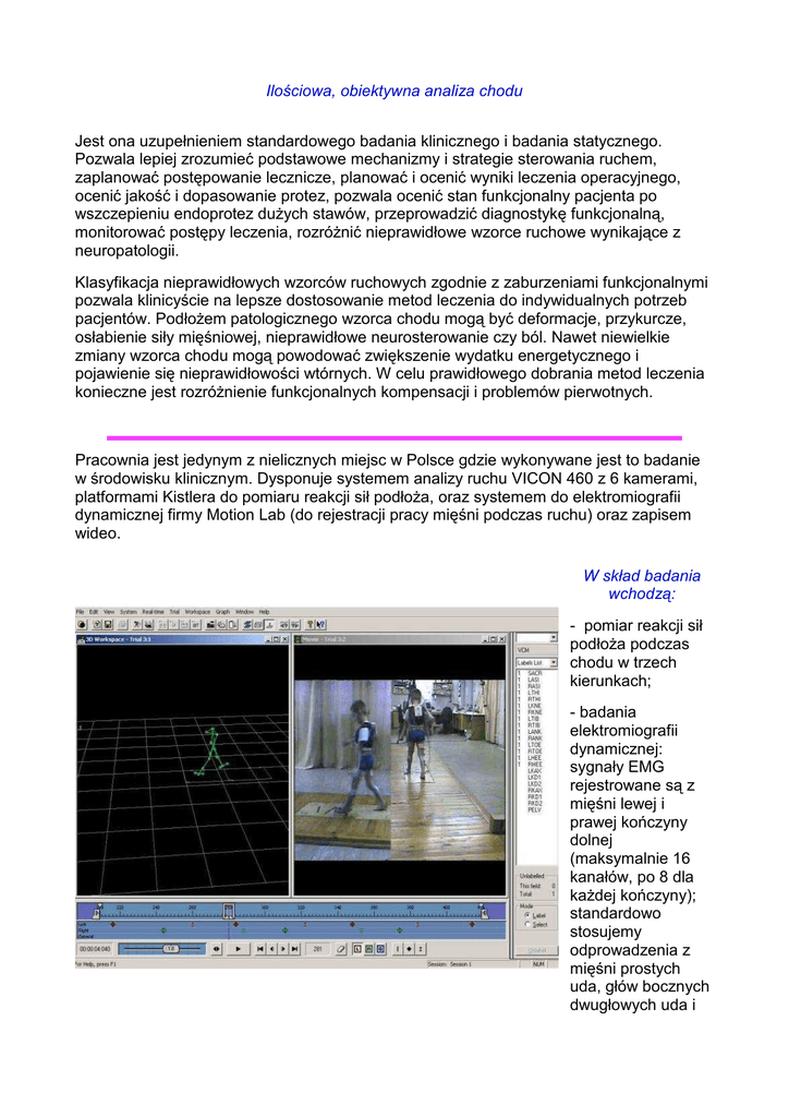Ilościowa, obiektywna analiza chodu Jest ona uzupełnieniem standardowego badania klinicznego i badania statycznego. Pozwala lepiej zrozumieć podstawowe mechanizmy i strategie sterowania ruchem, zaplanować postępowanie lecznicze, planować i ocenić wyniki leczenia operacyjnego, ocenić jakość i dopasowanie protez, pozwala ocenić stan funkcjonalny pacjenta po wszczepieniu endoprotez dużych stawów, przeprowadzić diagnostykę funkcjonalną, monitorować postępy leczenia, rozróżnić nieprawidłowe wzorce ruchowe wynikające z neuropatologii. Klasyfikacja nieprawidłowych wzorców ruchowych zgodnie z zaburzeniami funkcjonalnymi pozwala klinicyście na lepsze dostosowanie metod leczenia do indywidualnych potrzeb pacjentów. Podłożem patologicznego wzorca chodu mogą być deformacje, przykurcze, osłabienie siły mięśniowej, nieprawidłowe neurosterowanie czy ból. Nawet niewielkie zmiany wzorca chodu mogą powodować zwiększenie wydatku energetycznego i pojawienie się nieprawidłowości wtórnych. W celu prawidłowego dobrania metod leczenia konieczne jest rozróżnienie funkcjonalnych kompensacji i problemów pierwotnych. Pracownia jest jedynym z nielicznych miejsc w Polsce gdzie wykonywane jest to badanie w środowisku klinicznym. Dysponuje systemem analizy ruchu VICON 460 z 6 kamerami, platformami Kistlera do pomiaru reakcji sił podłoża, oraz systemem do elektromiografii dynamicznej firmy Motion Lab (do rejestracji pracy mięśni podczas ruchu) oraz zapisem wideo. W skład badania wchodzą: - pomiar reakcji sił podłoża podczas chodu w trzech kierunkach; - badania elektromiografii dynamicznej: sygnały EMG rejestrowane są z mięśni lewej i prawej kończyny dolnej (maksymalnie 16 kanałów, po 8 dla każdej kończyny); standardowo stosujemy odprowadzenia z mięśni prostych uda, głów bocznych dwugłowych uda i łydki, piszczelowych przednich oraz pośladkowych - w zależności od potrzeb pacjenta rejestrowany jest sygnał także z innych mięśni; - pomiary wielkości kinematycznych (dotyczących ruchu): położenie miednicy w płaszczyznach czołowej, strzałkowej i poprzecznej, kąty w stawach: biodrowym w trzech płaszczyznach (zginanie/prostowanie, odwiedzenie/przywiedzenie oraz rotacja wewnętrzna/zewnętrzna), kolanowym w płaszczyźnie strzałkowej (zginanie/prostowanie), skokowym w płaszczyźnie strzałkowej i poprzecznej (zginanie podeszwowe/grzbietowe oraz rotacja stopy względem podudzia), oraz ustawienie stopy względem linii kierunkowej chodu; - pomiar czasowych parametrów chodu: udział procentowy fazy podparcia w cyklu chodu, prędkość, częstość kroków, długość kroków. - parametry kinetyczne - momenty sił zewnętrznych w stawach. Przed rozpoczęciem pomiarów na ciele pacjenta, w ściśle określonych punktach anatomicznych, umieszcza się 15 markerów o średnicy 14 mm, oklejonych specjalną taśmą odblaskową. Ruch tych markerów w przestrzeni pomiarowej jest rejestrowany przez 6 specjalnych kamer rozmieszczonych w Pracowni. Kamery zbierają dane z częstotliwością próbkowania 60 Hz. Kamery przekazują obraz markerów do komputera, gdzie jest rejestrowany, a po badaniu poddawany obróbce. Przed badaniem na brzuścach mięśni pacjenta umieszczane są elektrody powierzchniowe, za pomocą których podczas chodu rejestrowana jest aktywność mięśni. Najczęściej stosuje się odprowadzenia dla mięśni prostych uda, dwugłowych uda, piszczelowych przednich, dwugłowych łydki i pośladkowych wielkich, ale można również badać inne mięśnie. Sygnały elektromiograficzne, a także reakcje sił podłoża podczas chodu z platform dynamograficznych a także obraz wideo z dwóch kamer ustawionych w płaszczyznach strzałkowej i czołowej są rejestrowane synchronicznie z obrazem z kamer rejestrujących ruch markerów. Po zarejestrowaniu danych podczas chodu pacjenta następuje ich przetwarzanie i wykonanie obliczeń. Analizie poddawanych jest najczęściej 6 prawidłowo zarejestrowanych przejść pacjenta i jeden cykl statyczny. W przypadku pacjentów, którzy z trudem się poruszają liczba przejść jest zmniejszana. Wynik przekazywany jest w postaci kilkustronicowego raportu z wykresami, tabelami i opisem słownym. Jest również możliwość otrzymania płytki CD z raportem w postaci mudltimedialnej. Jeśli jest to kolejne badanie, to porównuje się wyniki aktualne z otrzymanymi poprzednio (przed leczeniem w porównaniu do sytuacji po leczeniu, z zaopatrzeniem ortopedycznym w porównaniu ze stanem bez zaopatrzenia itp.). Najczęściej badanie wykonuje się u pacjentów z: mózgowym porażeniem dziecięcym, rozszczepem kręgosłupa, zespołami wad wrodzonych układu mięśniowo-szkieletowego; osteoporozą; dystrofiami mięśniowymi; niedowładami różnego pochodzenia; deformacjami kończyn dolnych różnego pochodzenia; dysplazjami; chorobami neurologicznymi wieku podeszłego (choroba Parkinsona, Alzheimera); reumatoidalnym zapaleniem stawów; zespołami móżdżkowymi; chorobami rdzenia; jałowymi martwicami kości; pacjentów po operacjach ortopedycznych kończyn dolnych; pacjentów po wszczepieniach endoprotez stawu biodrowego lub kolanowego (przed operacją i po niej). Nie jest to oczywiście pełna lista. Warunkiem przeprowadzenia badania jest chód samodzielny (ale może być o kulach, z balkonikiem, lub za rękę z osobą trzecią), oraz rozumienie i wykonywanie poleceń.