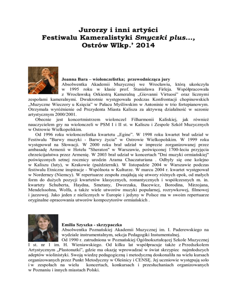 Jurorzy i inni artyści Festiwalu Kameralistyki Smyczki plus…, Ostrów Wlkp.’ 2014 Joanna Bara – wiolonczelistka; przewodnicząca jury Absolwentka Akademii Muzycznej we Wrocławiu, którą ukończyła w 1995 roku w klasie prof. Stanisława Firleja. Współpracowała z Wrocławską Orkiestrą Kameralną „Giovanni Virtuosi” oraz licznymi zespołami kameralnymi. Dwukrotnie występowała podczas Konfrontacji chopinowskich „Muzyczne Wieczory u Księcia” w Pałacu Myśliwskim w Antoninie w trio fortepianowym. Otrzymała wyróżnienie od Prezydenta Miasta Kalisza za aktywną działalność w sezonie artystycznym 2000/2001. Obecnie jest koncertmistrzem wiolonczel Filharmonii Kaliskiej, jak również nauczycielem gry na wiolonczeli w PSM I i II st. w Kaliszu i Zespole Szkół Muzycznych w Ostrowie Wielkopolskim. Od 1996 roku wiolonczelistka kwartetu „Egine”. W 1998 roku kwartet brał udział w Festiwalu "Barwy muzyki - Barwy życia" w Ostrowie Wielkopolskim. W 1999 roku występował na Słowacji. W 2000 roku brał udział w imprezie zorganizowanej przez ambasadę Armenii w Hotelu "Sheraton" w Warszawie, poświęconej 1700-leciu przyjęcia chrześcijaństwa przez Armenię. W 2003 brał udział w koncertach "Dni muzyki ormiańskiej" poświęconych setnej rocznicy urodzin Arama Chaczaturiana . Odbyły się one kolejno w Kaliszu (luty), w Krakowie (październik). W listopadzie 2004 w Warszawie podczas festiwalu Etniczne inspiracje - Wspólnota w Kulturze. W marcu 2004 r. kwartet występował w Norderney (Niemcy). W repertuarze zespołu znajdują się utwory różnych epok, od małych form do dużych pozycji kwartetów klasycznych, romantycznych i współczesnych m. in. kwartety Schuberta, Haydna, Smetany, Dworzaka, Bacewicz, Borodina, Mirzojana, Mendelssohna, Wolfa, a także wiele utworów muzyki popularnej, rozrywkowej, filmowej i jazzowej. Jako jeden z nielicznych w Europie i jedyny w Polsce ma w swoim repertuarze oryginalne opracowania utworów kompozytorów ormiańskich . Emilia Szyszka - skrzypaczka Absolwentka Poznańskiej Akademii Muzycznej im. I. Paderewskiego na wydziale instrumentalnym, sekcja Pedagogiki Instumentalnej. Od 1990 r. zatrudniona w Poznańskiej Ogólnokształcącej Szkole Muzycznej I st. nr 1 im. H. Wieniawskiego. Od kilku lat współpracuje także z Przedszkolem Artystycznym „Plastonutki”, gdzie ma okazję wprowadzać w świat skrzypiec najmłodszych adeptów wiolinistyki. Swoją wiedzę pedagogiczną i metodyczną doskonaliła na wielu kursach organizowanych przez Punkt Metodyczny w Oleśnicy i CENSĘ. Jej uczniowie występują solo i w zespołach na wielu koncertach, konkursach i przesłuchaniach organizowanych w Poznaniu i innych miastach Polski. Jest pomysłodawczynią warsztatów skrzypcowych „I solo i tutti” dla uczniów i ich nauczycieli z Regionu Wielkopolskiego , współpracuje także z Towarzystwem im. H. Wieniawskiego w Poznaniu w organizowaniu koncertów z cyklu „Scena Młodych” . Od marca 2012 jest konsultantem CEA . Robert Adamczak - pianista Ukończył z wyróżnieniem Państwową Szkołę Muzyczną I i II stopnia im. Henryka Melcera w Kaliszu w klasie fortepianu Krystyny Bujakiewicz. Jest absolwentem Akademii Muzycznej im. Karola Lipińskiego we Wrocławiu w klasie fortepianu Witolda Witkowskiego. Ukończył również Podyplomowe Studium Mistrzowskie pod kierunkiem prof. Waldemara Andrzejewskiego w Akademii Muzycznej im. Ignacego Jana Paderewskiego w Poznaniu. W 2012 roku uzyskał stopień doktora sztuki muzycznej w dyscyplinie artystycznej instrumentalistyka. Obecnie zatrudniony jest na stanowisku adiunkta na Wydziale PedagogicznoArtystycznym w Kaliszu Uniwersytetu im. Adama Mickiewicza w Poznaniu. Prowadzi również klasę fortepianu w Zespole Szkół Muzycznych im. Krzysztofa Komedy Trzcińskiego w Ostrowie Wielkopolskim oraz w Państwowej Szkole Muzycznej I i II stopnia im. Henryka Melcera w Kaliszu. Równolegle z pracą pedagogiczną realizuje działalność artystyczną jako solista i kameralista. Jerzy Burban – lutnik Absolwent Technikum Budowy Instrumentów Lutniczych w Nowym Targu.Praktyki lutnicze odbywał w pracowni Władysława Bachledy w Gdańsku, następnie w Zakopanem pod kierunkiem Mistrza Franciszka Marduły. Od 1975 roku członek Związku Polskich Artystów Lutników (ZPAL), brał czynny udział w pracach związku jako zastępca przewodniczącego Komisji Rewizyjnej oraz pełnił funkcję sekretarza Zarządu.Od 1985 do 2011 roku prowadził pracownię lutniczą we Wrocławiu. Aktualnie działa w Bronikowie koło Wielunia. Konserwator i twórca instrumentów; zbudował około 300 sztuk rożnego rodzaju instrumentów, takich jak: skrzypce, altówki, wiolonczele, kontrabasy, viole da gamba oraz smyczki. Od 2009 jest Rzeczoznawcą Ministra Kultury w dziedzinie instrumenty muzyczne – specjalność: lutnictwo. W czasie swojej prawie czterdziestoletniej działalności, sporządził kilkaset opinii i ekspertyz instrumentów na potrzeby instytucji muzycznych oraz osób prywatnych. Brał udział w wielu konkursach i wystawach lutniczych między innymi: 1991, 2001 – Konkurs im. H. Wieniawskiego w Poznaniu 1997, 2001 – Konkurs w Mittenwaldzie 1998 – Konkurs w Manchesterze w kategorii wiolonczel 1999 – Konkurs w im. W. Kamińskiego w Poznaniu 2012 – Ogólnopolski konkurs na brzmienie skrzypiec w Lublinie (laureat III nagrody) Agnieszka Lisiak "Skórka" – artystka; twórczyni statuetek Złotej, Srebrnej i Brązowej Trioli Absolwentka Uniwersytetu im. A. Mickiewicza w Poznaniu Wydział Pedagogiczno-Artystyczny w Kaliszu, dyplom artystyczny w Pracowni Rzeźby pod kierunkiem prof. Andrzeja Jocza oraz Akademii Sztuk Pięknych we Wrocławiu, specjalizacja rzeźba pod kierunkiem prof. Janusza Kucharskiego i ceramika pod kierunkiem prof. Krystyny Cybińskiej. Zajmuje się głównie rzeźbą, ceramiką oraz malarstwem, modą i fotografią. Jest członkiem Związku Polskiego Artystów Plastyków oraz Wielkopolskiego Związ
