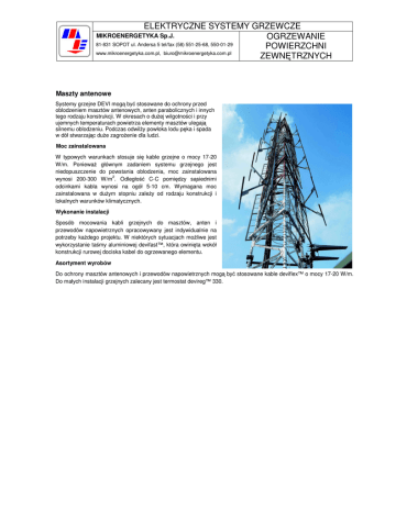 ELEKTRYCZNE SYSTEMY GRZEWCZE OGRZEWANIE 81-831 SOPOT ul. Andersa 5 tel/fax (58) 551-25-68, 550-01-29 POWIERZCHNI www.mikroenergetyka.com.pl, [email protected] ZEWN TRZNYCH MIKROENERGETYKA Sp.J. Maszty antenowe Systemy grzejne DEVI mog by stosowane do ochrony przed oblodzeniem masztów antenowych, anten parabolicznych i innych tego rodzaju konstrukcji. W okresach o du ej wilgotno ci i przy ujemnych temperaturach powietrza elementy masztów ulegaj silnemu oblodzeniu. Podczas odwil y powłoka lodu p ka i spada w dół stwarzaj c du e zagro enie dla ludzi. Moc zainstalowana W typowych warunkach stosuje si kable grzejne o mocy 17-20 W/m. Poniewa głównym zadaniem systemu grzejnego jest niedopuszczenie do powstania oblodzenia, moc zainstalowana 2 wynosi 200-300 W/m . Odległo C-C pomi dzy s siednimi odcinkami kabla wynosi na ogół 5-10 cm. Wymagana moc zainstalowana w du ym stopniu zale y od rodzaju konstrukcji i lokalnych warunków klimatycznych. Wykonanie instalacji Sposób mocowania kabli grzejnych do masztów, anten i przewodów napowietrznych opracowywany jest indywidualnie na potrzeby ka dego projektu. W niektórych sytuacjach mo liwe jest wykorzystanie ta my aluminiowej devifast™, która owini ta wokół konstrukcji rurowej dociska kabel do ogrzewanego elementu. Asortyment wyrobów Do ochrony masztów antenowych i przewodów napowietrznych mog by stosowane kable deviflex™ o mocy 17-20 W/m. Do małych instalacji grzejnych zalecany jest termostat devireg™ 330.