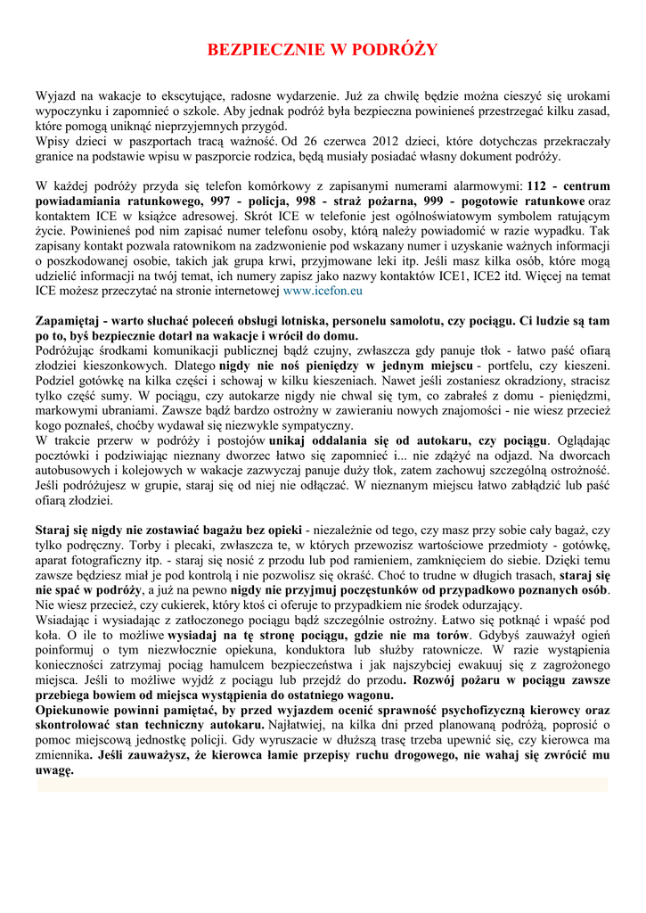 BEZPIECZNIE W PODRÓŻY Wyjazd na wakacje to ekscytujące, radosne wydarzenie. Już za chwilę będzie można cieszyć się urokami wypoczynku i zapomnieć o szkole. Aby jednak podróż była bezpieczna powinieneś przestrzegać kilku zasad, które pomogą uniknąć nieprzyjemnych przygód. Wpisy dzieci w paszportach tracą ważność. Od 26 czerwca 2012 dzieci, które dotychczas przekraczały granice na podstawie wpisu w paszporcie rodzica, będą musiały posiadać własny dokument podróży. W każdej podróży przyda się telefon komórkowy z zapisanymi numerami alarmowymi: 112 - centrum powiadamiania ratunkowego, 997 - policja, 998 - straż pożarna, 999 - pogotowie ratunkowe oraz kontaktem ICE w książce adresowej. Skrót ICE w telefonie jest ogólnoświatowym symbolem ratującym życie. Powinieneś pod nim zapisać numer telefonu osoby, którą należy powiadomić w razie wypadku. Tak zapisany kontakt pozwala ratownikom na zadzwonienie pod wskazany numer i uzyskanie ważnych informacji o poszkodowanej osobie, takich jak grupa krwi, przyjmowane leki itp. Jeśli masz kilka osób, które mogą udzielić informacji na twój temat, ich numery zapisz jako nazwy kontaktów ICE1, ICE2 itd. Więcej na temat ICE możesz przeczytać na stronie internetowej www.icefon.eu Zapamiętaj - warto słuchać poleceń obsługi lotniska, personelu samolotu, czy pociągu. Ci ludzie są tam po to, byś bezpiecznie dotarł na wakacje i wrócił do domu. Podróżując środkami komunikacji publicznej bądź czujny, zwłaszcza gdy panuje tłok - łatwo paść ofiarą złodziei kieszonkowych. Dlatego nigdy nie noś pieniędzy w jednym miejscu - portfelu, czy kieszeni. Podziel gotówkę na kilka części i schowaj w kilku kieszeniach. Nawet jeśli zostaniesz okradziony, stracisz tylko część sumy. W pociągu, czy autokarze nigdy nie chwal się tym, co zabrałeś z domu - pieniędzmi, markowymi ubraniami. Zawsze bądź bardzo ostrożny w zawieraniu nowych znajomości - nie wiesz przecież kogo poznałeś, choćby wydawał się niezwykle sympatyczny. W trakcie przerw w podróży i postojów unikaj oddalania się od autokaru, czy pociągu. Oglądając pocztówki i podziwiając nieznany dworzec łatwo się zapomnieć i... nie zdążyć na odjazd. Na dworcach autobusowych i kolejowych w wakacje zazwyczaj panuje duży tłok, zatem zachowuj szczególną ostrożność. Jeśli podróżujesz w grupie, staraj się od niej nie odłączać. W nieznanym miejscu łatwo zabłądzić lub paść ofiarą złodziei. Staraj się nigdy nie zostawiać bagażu bez opieki - niezależnie od tego, czy masz przy sobie cały bagaż, czy tylko podręczny. Torby i plecaki, zwłaszcza te, w których przewozisz wartościowe przedmioty - gotówkę, aparat fotograficzny itp. - staraj się nosić z przodu lub pod ramieniem, zamknięciem do siebie. Dzięki temu zawsze będziesz miał je pod kontrolą i nie pozwolisz się okraść. Choć to trudne w długich trasach, staraj się nie spać w podróży, a już na pewno nigdy nie przyjmuj poczęstunków od przypadkowo poznanych osób. Nie wiesz przecież, czy cukierek, który ktoś ci oferuje to przypadkiem nie środek odurzający. Wsiadając i wysiadając z zatłoczonego pociągu bądź szczególnie ostrożny. Łatwo się potknąć i wpaść pod koła. O ile to możliwe wysiadaj na tę stronę pociągu, gdzie nie ma torów. Gdybyś zauważył ogień poinformuj o tym niezwłocznie opiekuna, konduktora lub służby ratownicze. W razie wystąpienia konieczności zatrzymaj pociąg hamulcem bezpieczeństwa i jak najszybciej ewakuuj się z zagrożonego miejsca. Jeśli to możliwe wyjdź z pociągu lub przejdź do przodu. Rozwój pożaru w pociągu zawsze przebiega bowiem od miejsca wystąpienia do ostatniego wagonu. Opiekunowie powinni pamiętać, by przed wyjazdem ocenić sprawność psychofizyczną kierowcy oraz skontrolować stan techniczny autokaru. Najłatwiej, na kilka dni przed planowaną podróżą, poprosić o pomoc miejscową jednostkę policji. Gdy wyruszacie w dłuższą trasę trzeba upewnić się, czy kierowca ma zmiennika. Jeśli zauważysz, że kierowca łamie przepisy ruchu drogowego, nie wahaj się zwrócić mu uwagę.